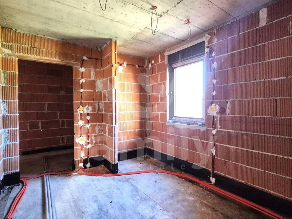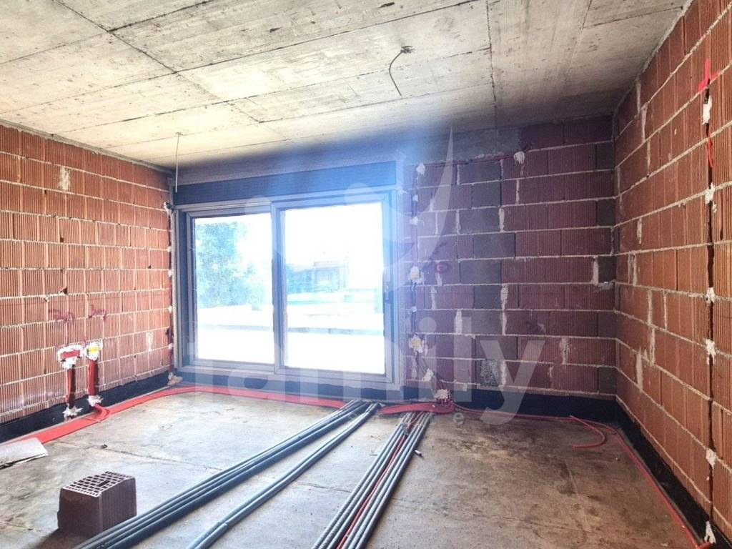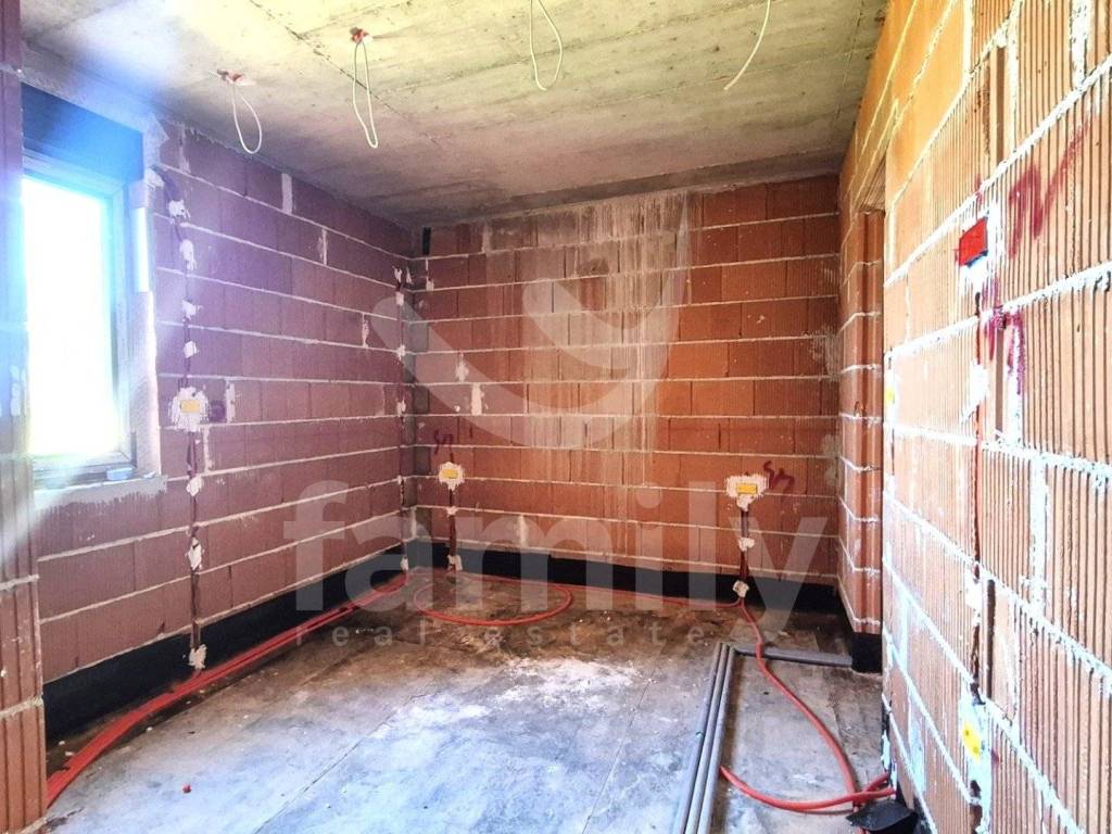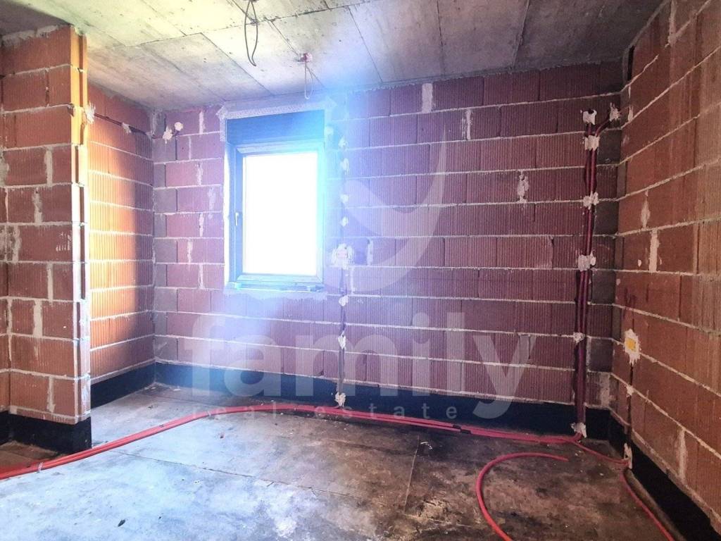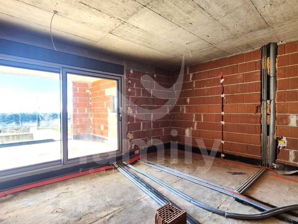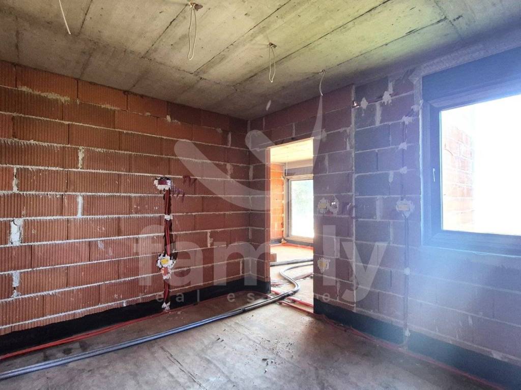 Upon entering the apartment with a total area of 74 m2, we have a hallway where the heat pump installations are located. The apartment has a guest toilet and a space that leads us to a comfortable bedroom that is approximately 12.50 m2, with space for built-in wardrobes, large anthracite-colored living openings with triple-layered glass. Each bedroom has its own bathroom that is spacious and modern in appearance with larger living openings. The living area has a chimney and air conditioning units and underfloor heating throughout the apartment, including the bathrooms. The second bedroom is also of similar dimensions with its own bathroom, also planned to be comfortable in appearance and with similar square footage. Upon entering the living room, we have an open-type dining room with a total area of 31 m2 connected to the kitchen and access to the terrace where we have an extremely large living sliding opening from which you can see the pool and greenery. The open space concept and comfortable passage to the covered terrace are certainly a benefit. The terrace offers a wealth of decoration options because the overall concept is excellently designed. The covered terrace is sunny during the summer and winter months for most of the day, where there is also a shared overflow heated pool of approximately 30 m2 and we additionally have a small part of the green area as a sunbathing area around the pool. The entire property has the option of choosing ceramics since the works have not reached the installation phase. Currently, a place is planned for a bio septic tank, with pipes for a classic septic tank being laid when it is possible to connect to it.