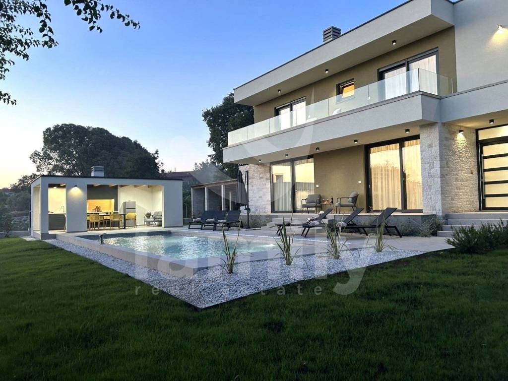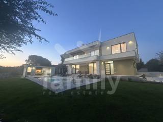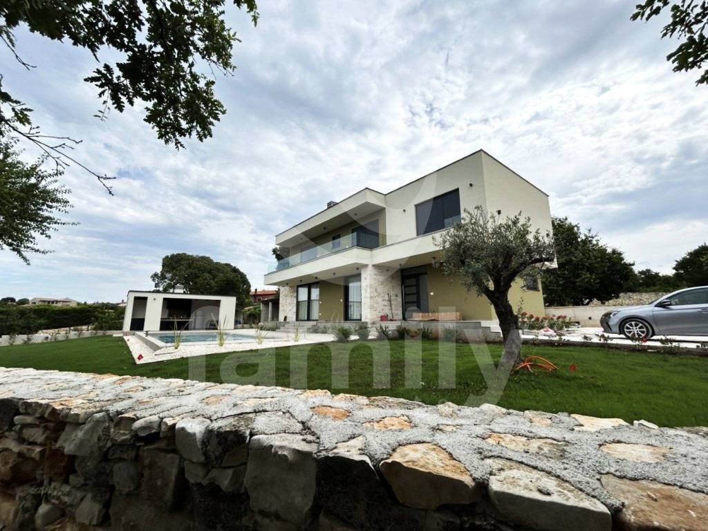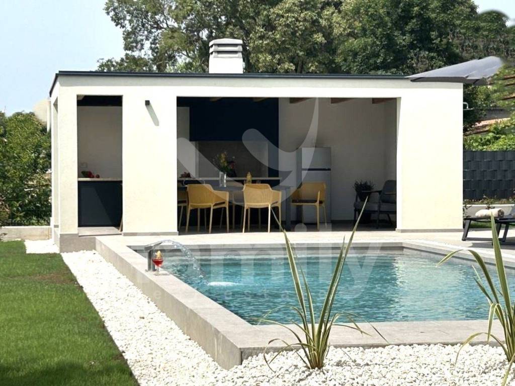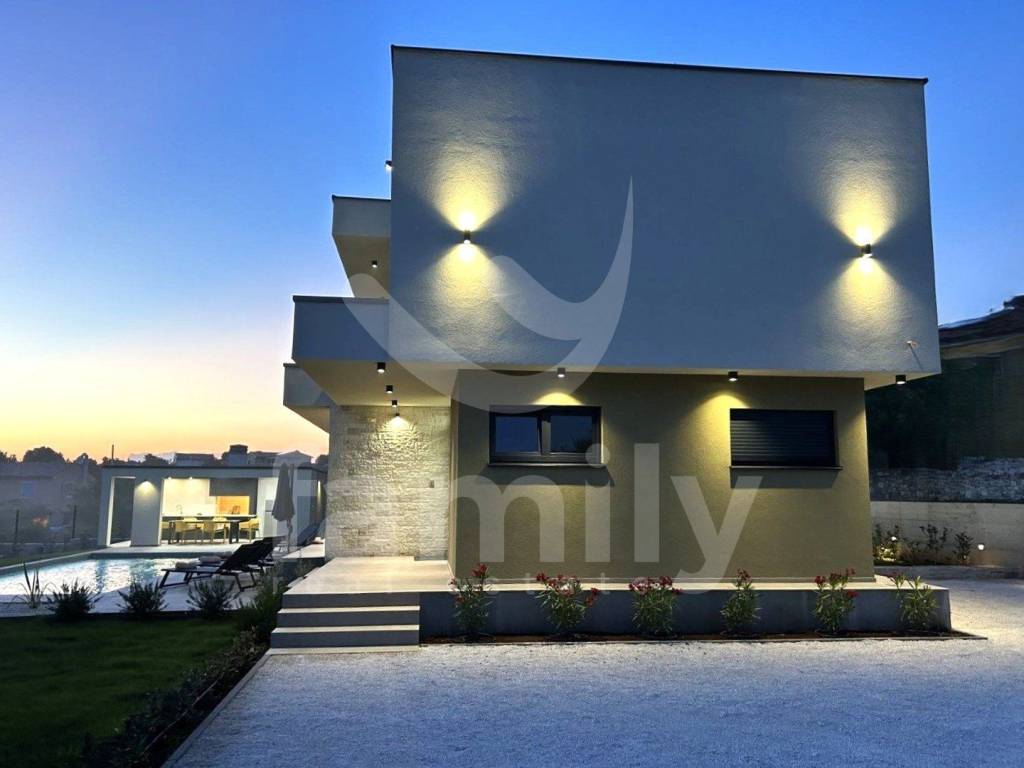 The villa with a total area of 208 m2 is positioned on the southwest side at the end of the urbtioned place.anized part. The entire plot is surrounded by a wall, the entrance gate is electric with three parking spaces in the yard. The yard is decorated and maintained with love and the lawn has automatic irrigation. In the outdoor area we have a covered auxiliary building with a fireplace for socializing and staying as well as a heated swimming pool with a total area of 40 m2. The garage area is also separate. The house is furnished extremely nicely and modernly and is being sold as such. The first entrance area has a living area with a dining room, kitchen and guest toilet. On the first floor we have three bedrooms with three bathrooms and a balcony with a view of the greenery and a small part of the sea. The villa is extremely nicely and modernly equipped with quality and modern materials. Staying in the aforementioned property is certainly pleasant because it offers a bright and sunny space with a modern look with a beautiful garden on an ideal orientation with large PVC openings with electric shutters. Certainly the advantage is the larger number of air conditioners and the heat pump system provided in the boiler room. The entire villa has underfloor heating.It is also designed for solar panels.