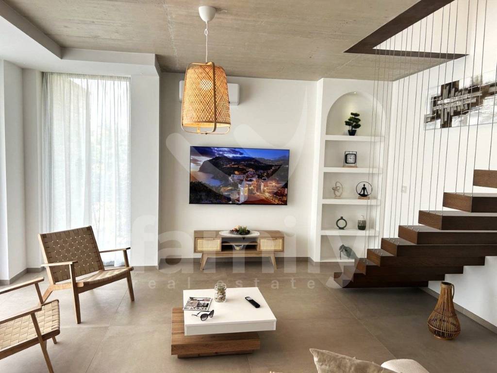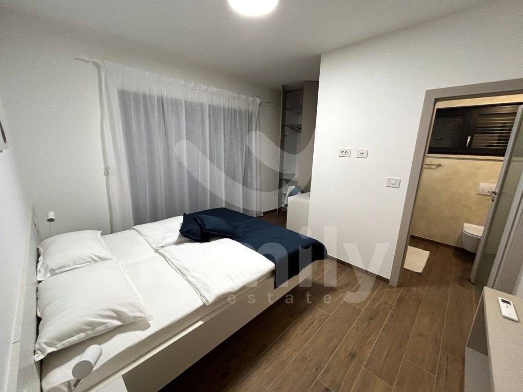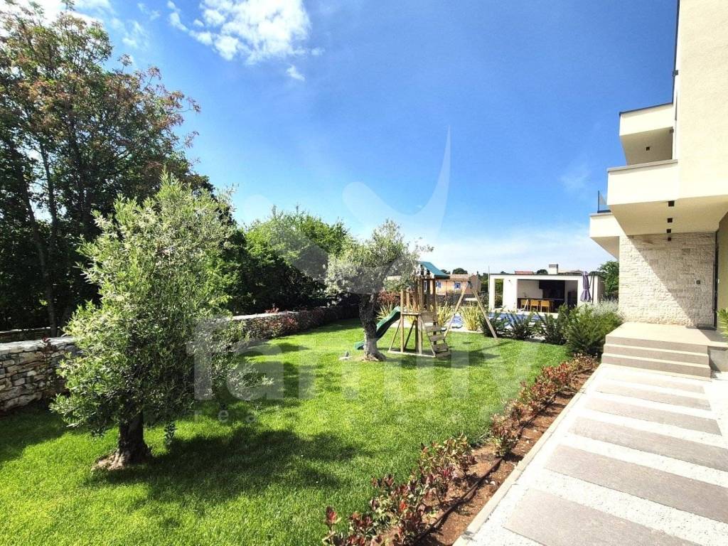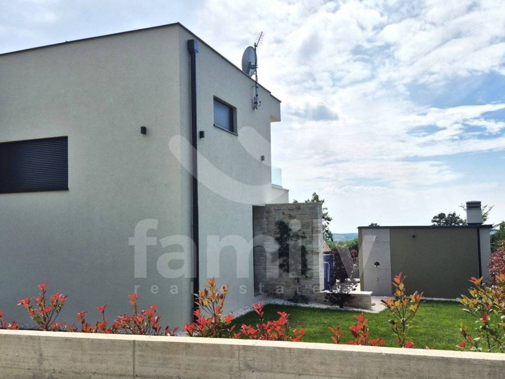 The villa with a total area of 208 m2 is positioned on the southwest side at the end of the urbtioned place.anized part. The entire plot is surrounded by a wall, the entrance gate is electric with three parking spaces in the yard. The yard is decorated and maintained with love and the lawn has automatic irrigation. In the outdoor area we have a covered auxiliary building with a fireplace for socializing and staying as well as a heated swimming pool with a total area of 40 m2. The garage area is also separate. The house is furnished extremely nicely and modernly and is being sold as such. The first entrance area has a living area with a dining room, kitchen and guest toilet. On the first floor we have three bedrooms with three bathrooms and a balcony with a view of the greenery and a small part of the sea. The villa is extremely nicely and modernly equipped with quality and modern materials. Staying in the aforementioned property is certainly pleasant because it offers a bright and sunny space with a modern look with a beautiful garden on an ideal orientation with large PVC openings with electric shutters. Certainly the advantage is the larger number of air conditioners and the heat pump system provided in the boiler room. The entire villa has underfloor heating.It is also designed for solar panels.