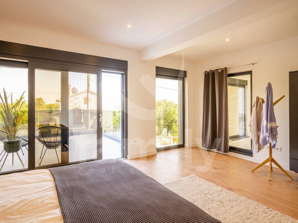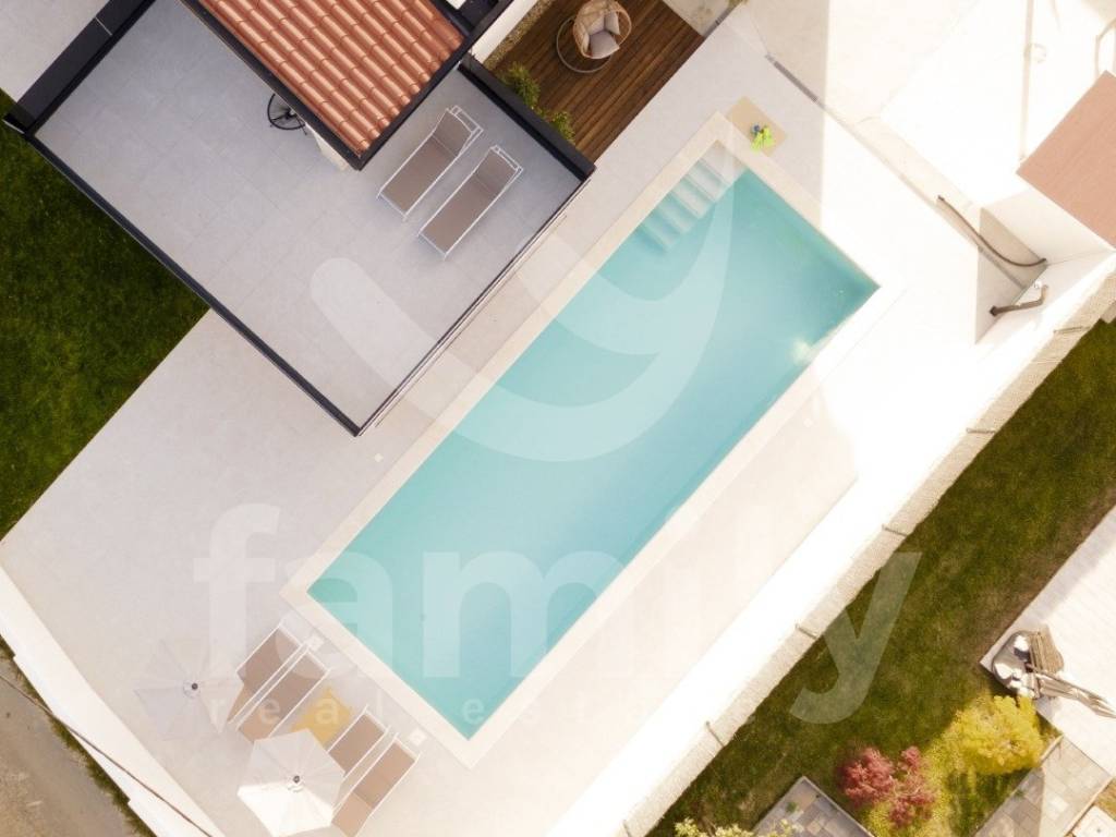 Not far from Rovinj, just a ten-minute drive away, in a quiet and luxurious village, is this spacious, designer villa with a total area of 230 m2 and a garden of 560 m2. The villa is spread over two floors, where on the ground floor there is a living room with lots of daylight and windows, a spacious kitchen area with a dining room and access to a spacious, covered terrace and garden of the property. On the ground floor there is also one bedroom with its own bathroom, adapted for people with special needs. On the first floor there are three beautifully decorated and bright bedrooms with two bathrooms and a spacious terrace. Quality joinery with electric shutters, as well as a heating and cooling system via air conditioning and the possibility of installing a fireplace in the living room certainly represent an advantage of this excellent property. The courtyard is a true oasis of peace and is fenced to ensure privacy and features a spacious, heated swimming pool of approximately 45 m2, a sundeck, a garden with an irrigation system and secured parking spaces, and an electric entrance gate. The first phase has been completed in the property, which is ready for the installation of video surveillance if necessary.