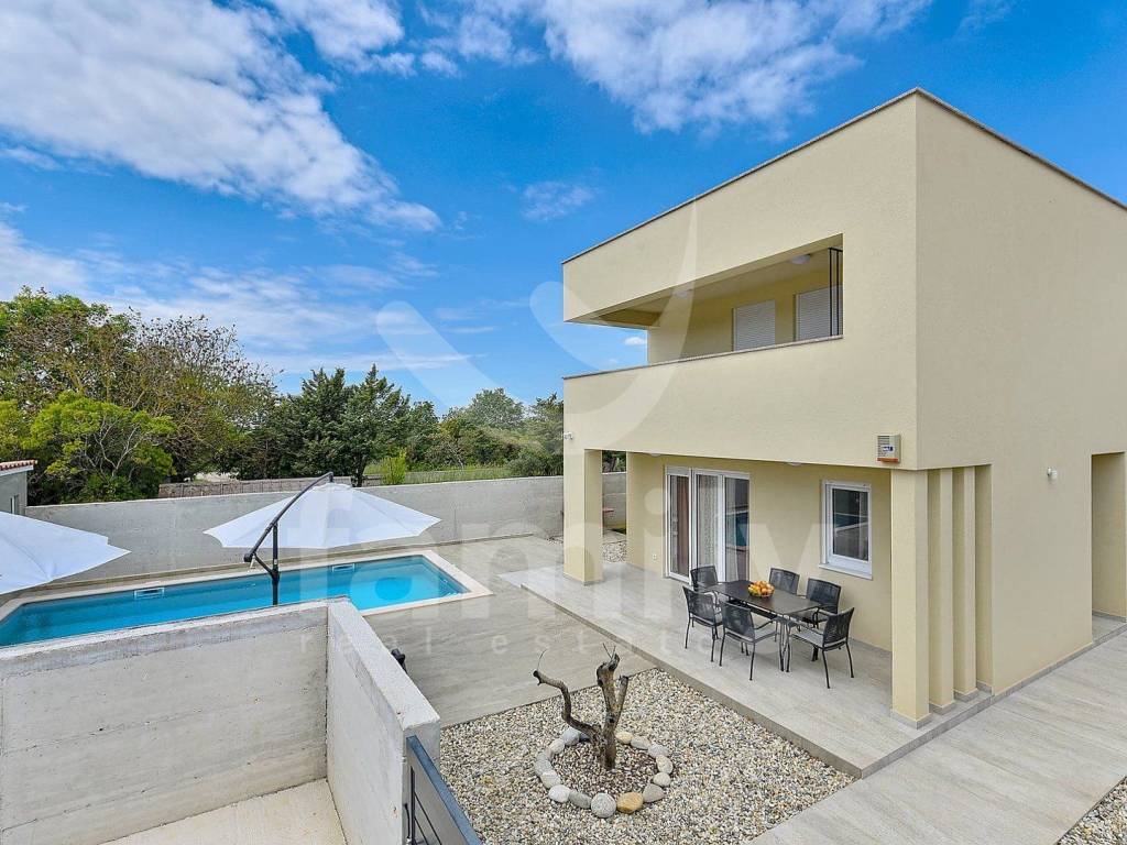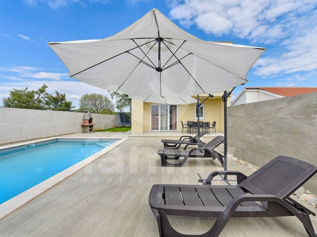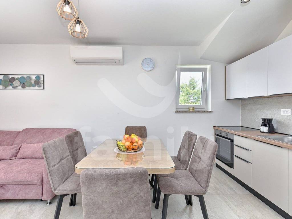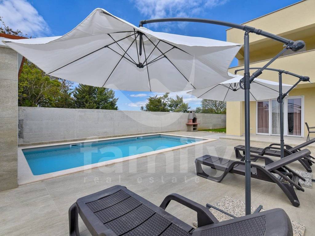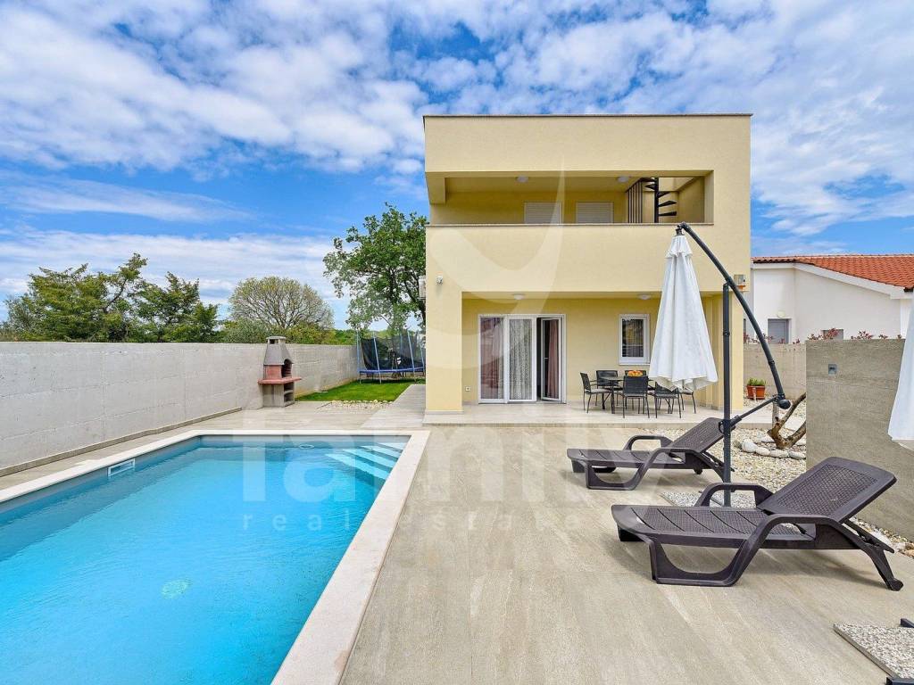 It is in Peroj that a detached house with a beautiful sea view of 145 m2 is located on a plot of 300 m2. Inside the house on the ground floor there is an entrance hall with a storage room, a spacious, bright living room with kitchen and dining area, a bedroom and a bathroom. The living room has a glass wall from which you can access a covered ground-floor terrace, a swimming pool with a spacious sunbathing area and a barbecue area. On the first floor of this beautiful house there is a bathroom and two spacious, bright bedrooms, each of which has access to a shared terrace with a stunning view of the surrounding nature and the sea. The property is equipped with high-quality PVC three-layer joinery with nine gas chambers and roller shutters, the thermal facade is 5cm thick, and the heating and cooling system is regulated by three air conditioning units (in the living room and in the bedrooms on the first floor). The garden is carefully maintained and mostly paved with Italian ceramics and there is a 24 m2 swimming pool as well as an outdoor fireplace. The advantage of this quality house is a beautiful roof terrace with a stunning view of the sea and beautiful sunsets. On the back of the property there are several older oak trees, young olive trees and other various plants that already make up the beautiful garden of the said property and will increasingly enhance the overall aesthetic image and the feeling of enjoyment in the garden of this beautiful building every day. The house has two outdoor parking spaces and is being sold fully furnished. The property is located in a very quiet, yet attractive location, close to all amenities and beautiful beaches.