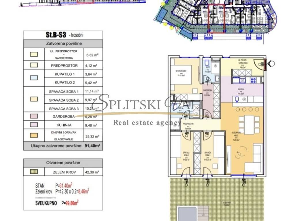 Posredujemo u prodaji luksuzne novogradnje na Duilovu. Prodaje se trosobni stan unutrašnje površine 91,4m2,a s terasom ukupna stambena površina iznosi 100m2. Stan se sastoji od 3 spavaće sobe, dvije kupaonice, kuhinje s blagovaonicom, dnevnog boravka i terase. Orijentacija stana je jug-sjever, nalazi se u prizemlju s velikim staklenim stijenkama koje pružaju mnogo osvjetljenja tokom dana. Moguća je kupnja parking mjesta u garaži. Kupac plaća posredničku naknadu od 2%+pdv.