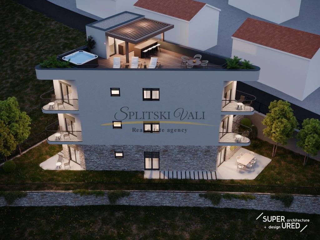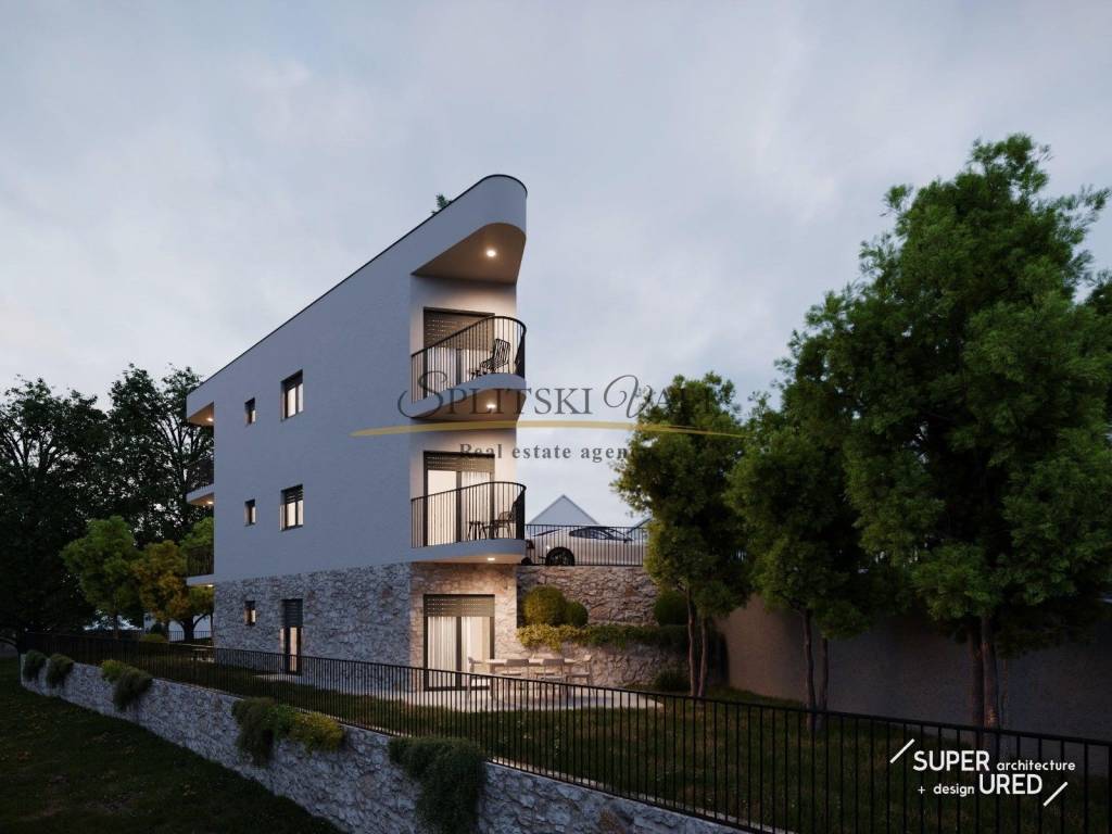 Lokacija je u mirnom i prestižnom predgrađu Splita, poznatom po lijepim plažama, luksuznim vilama i odličnim sadržajima. U blizini nalaze se restorani, trgovine, škola, marina. Idealan izbor za obiteljski život ili kao investicija za turistički najam.