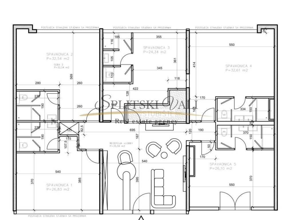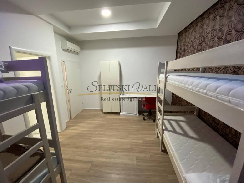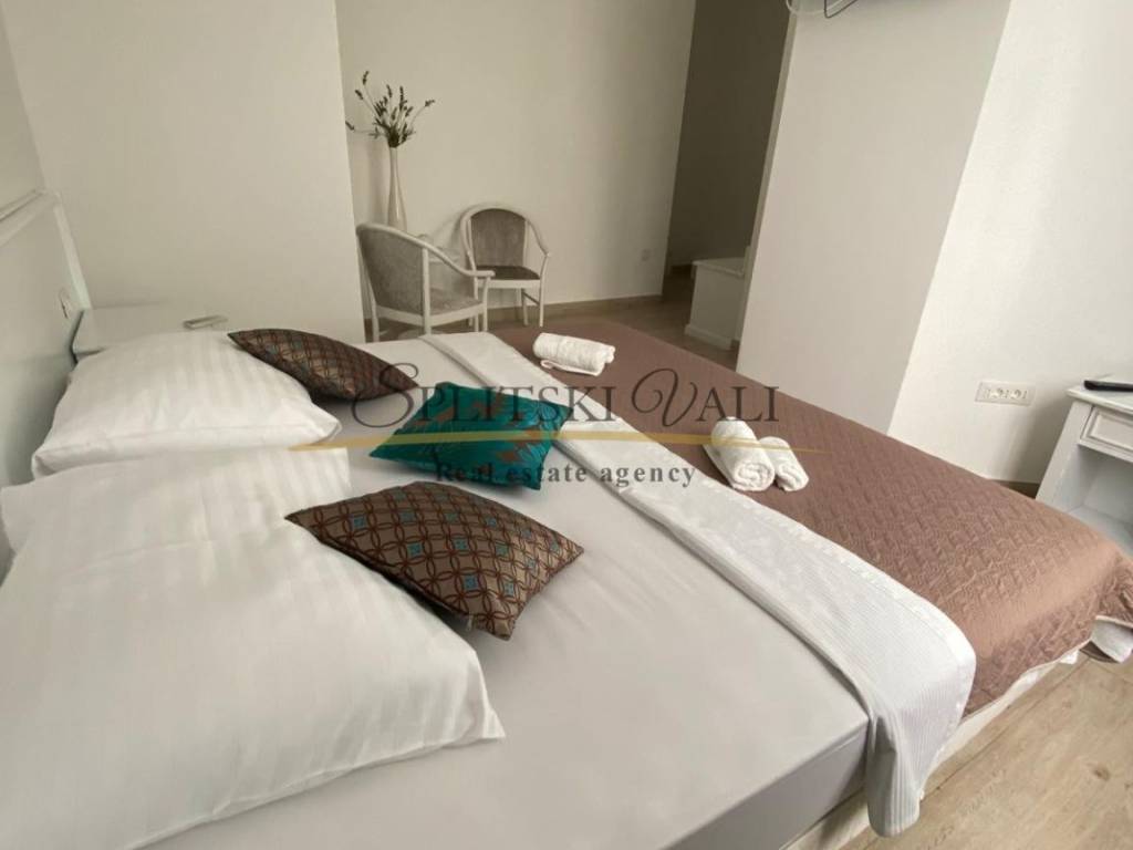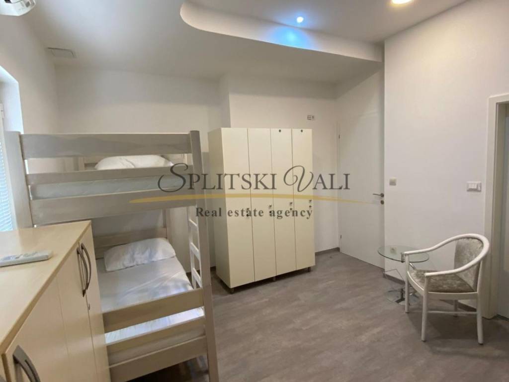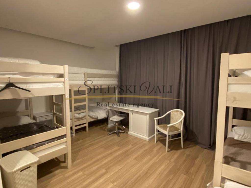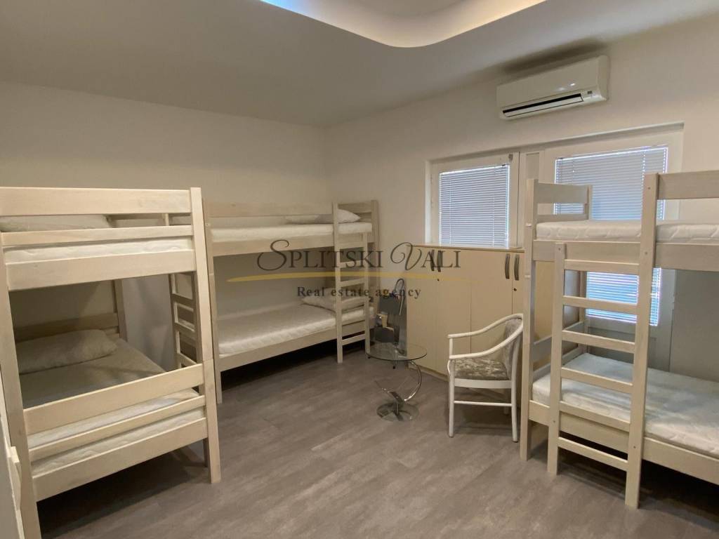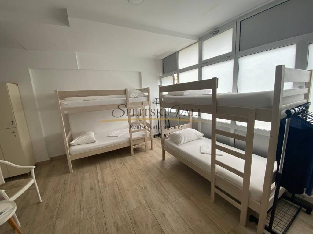 Ekskluzivno na tržištu, posredujemo u prodaji Hostela na odličnoj lokaciji u Splitu. Hostel se nalazi 850 m od mora, 1 km od centra grada (17 min hoda). Površina hostela iznosi 300 m2 te je podijeljen na dvije etaže. Smještajni kapacitet hostela je 44 kreveta, s dozvolom. Na gornjoj etaži, odnosno prizemlju nalazi se prostrana recepcija sa prostorom za sjedenje s TV-om, pet novouređenih soba (cca 30 m2), te kupatilima za svaku sobu (cca 5m2). Sobe su opremljene krevetima na kat, ormarićima i radnim stolovima. Sve sobe su klimatizirane. Na donjoj etaži nalazi se još jedna soba, sanitarni čvor s tušem i dva umivaonika, opremljena kuhinja s prostorom za konzumaciju hrane (stolovi i stolice) i skladišni prostor. Hostel je potpuno renoviran, promijenjene su instalacije, prozori, vrata, podovi (keramika,laminat), te su spušteni plafoni s rasvjetom. Prednost investicije je već uhodano poslovanje i visoka popunjenost, te uredno vlasništvo.