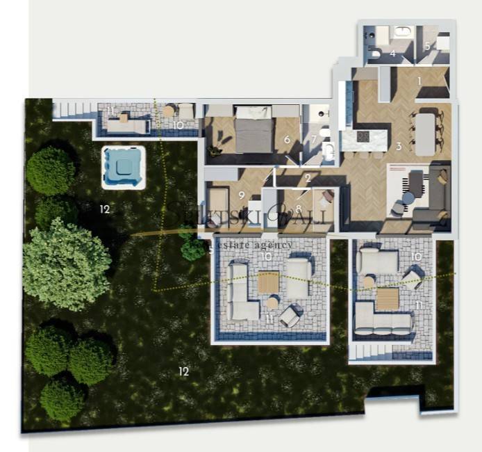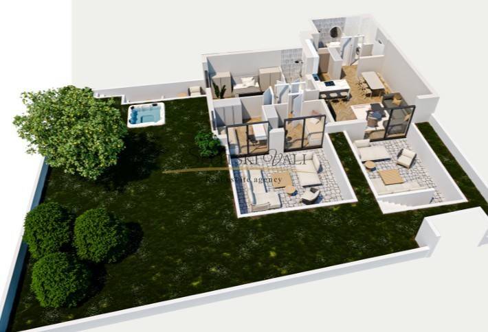 Sastoji se od hodnika, dnevnog prostora s kuhinjom i blagovaonicom, dvije kupaonice, praonice/ostave, tri spavaće sobe te prostranog vrta od preko 200m2, jacuzzi uključen u cijenu.