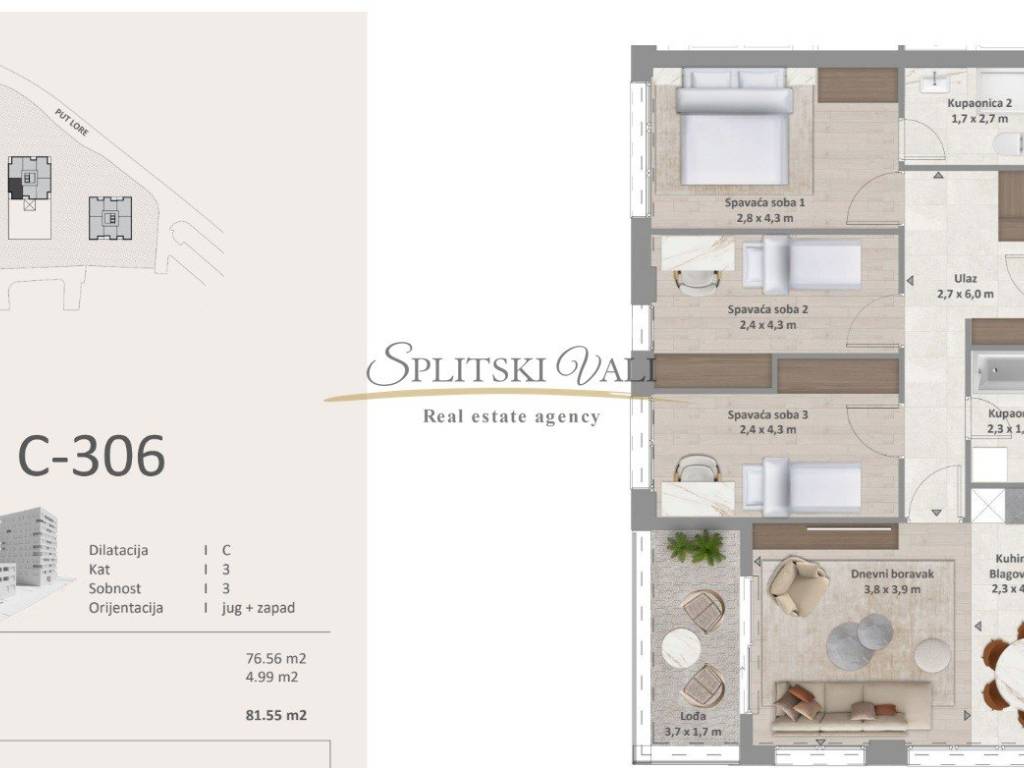 Stan C306 - Trosoban stan, ukupne površine 81,55 m2 nalazi se na 3.katu zgrade (od 6). Sastoji se od tri spavaće sobe, 2 kupatila, kuhinje s blagovaonicom, dnevnog boravka i lođe. Velike staklene stijenke pružaju mnogo osvjetljenja tokom dana i otvoren pogled. Orijentacija stana je jugozapad. Stanu pripadaju tri parking mjesta u garaži u iznosu od 35 000 po svakom mjestu, te sprema koja se nalazi u suterenu zgrade u iznosu od 22 000.
