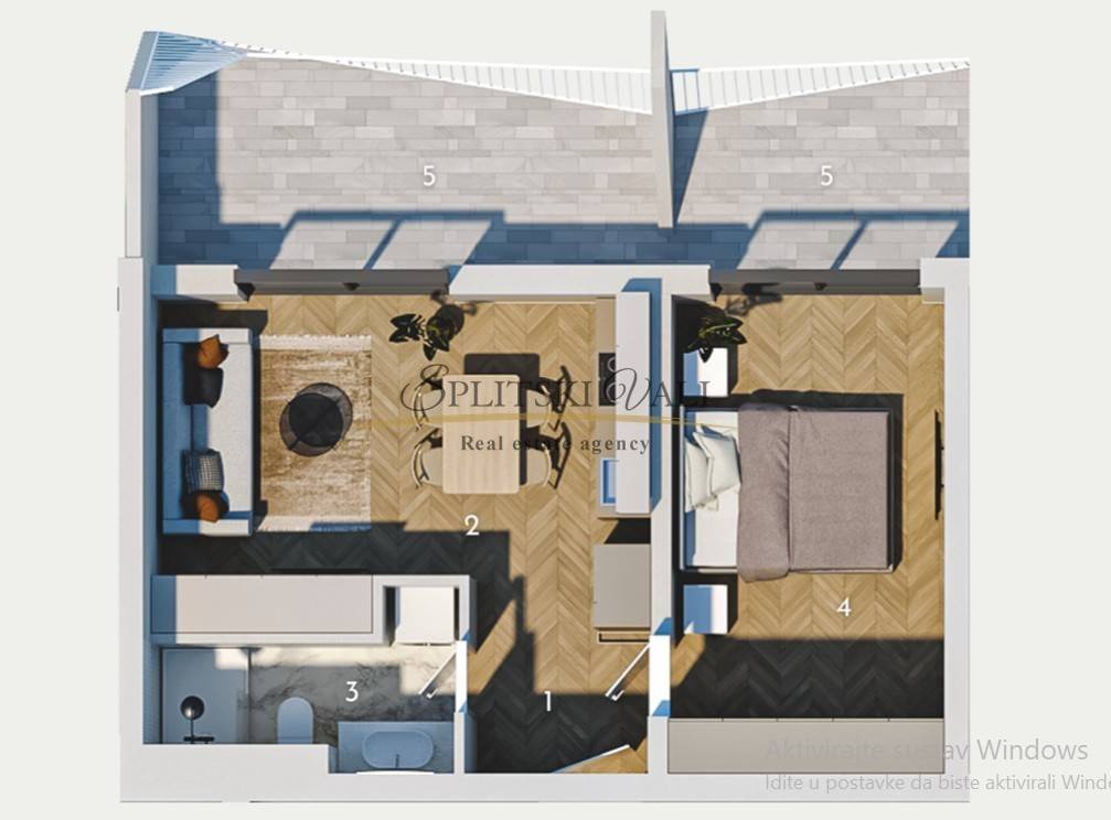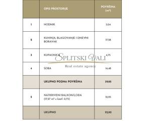 Sastoji se od dnevnog prostora s kuhinjom i blagovaonicom, spavaće sobe, kupaonice te natkrivenog balkona.