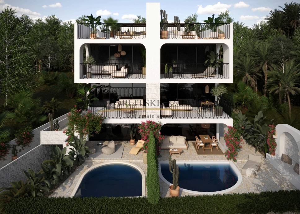 Prizemlja: 2 apartmana s privatnim vrtovima i bazenima, te prostorom za sjedenje, idealno za opuštanje uz more.