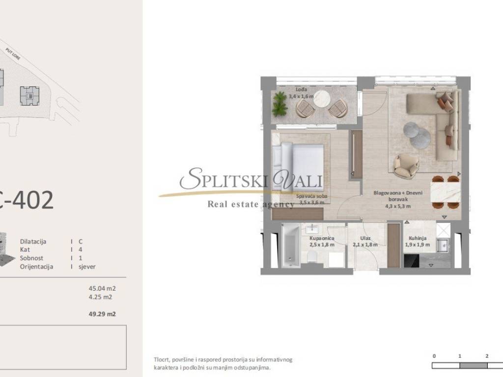 Stan C402 - jednosoban stan ukupne površine 49,29 m2, nalazi se na četvrtom katu od ukupno 6 katova. Stan je sjeverne orijentacije i sastoji se od spavaće sobe, kupaonice, kuhinje, dnevnog boravka s blagovaonicom i lođe. Velike staklene stijenke u stanu pružaju mnogo osvjetljenja tokom dana. Stanu pripada i parking mjesto u garaži (dodatno se naplaćuje 35.000) i sprema koja se nalazi u suterenu (dodatno se naplaćuje 22 000).