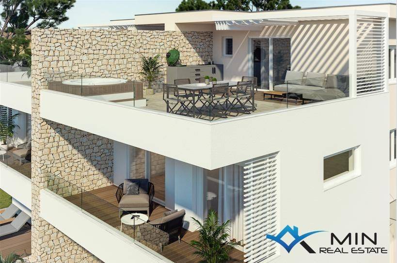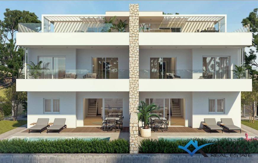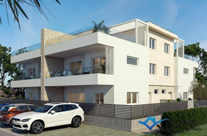 A semi-detached house is for sale 2 km from the sea and a beautifully landscaped beach. The house is located near Umag and is surrounded by new modern houses. na The house has a net area of 140 m2 and consists of 3 floors - ground floor, first floor and roof terrace with jacuzzi and summer kitchen. The terrace offers a beautiful view of nature and the sea. The house has a garden area of 375 m2 where a swimming pool can be placed. On the ground floor there is a living room with a kitchen and a dining room, from which there is access to a spacious terrace, and a bathroom with a toilet. On the first floor there are three bedrooms, each with its own bathroom and toilet and access to spacious terraces. The roof terrace offers a partial view of the sea, and there is a jacuzzi and a summer kitchen on it. The entire property consists of two such units, each with a separate entrance and a separate garden and 3 parking spaces. The price for the second house is EUR 470,000.00 EUR.