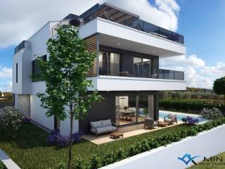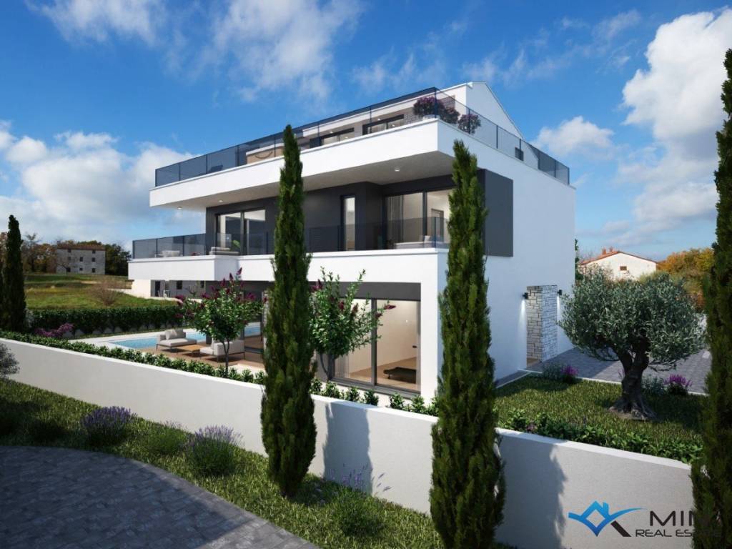 Detached villa for sale in a quiet location near Poreč. The villa extends over the 3rd floor and has 220 m2. The house consists of a ground floor, a first floor and a roof terrace. On the ground floor, the house consists of an entrance hall, a technical room, a toilet, a storage room, a wellness area and an open space area in which there is a kitchen with a dining room and a living room with access to a covered terrace of 24 m2. On the 1st floor there are 3 bedrooms, each with its own private bathroom and access to a covered terrace. The house has a comfortable roof terrace of 70 m2 where there is a sauna, bathroom and 2 storage rooms. The villa has a garden of 501 m2 with a swimming pool of 32 m2 and 2 parking spaces. The house can be used for residential or tourist purposes. The distance from the sea and the beautifully decorated beach is 13 km, and the center of Poreč is 15 km away. It is possible to buy the villa in an unfinished state.