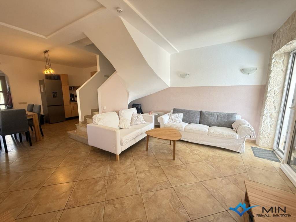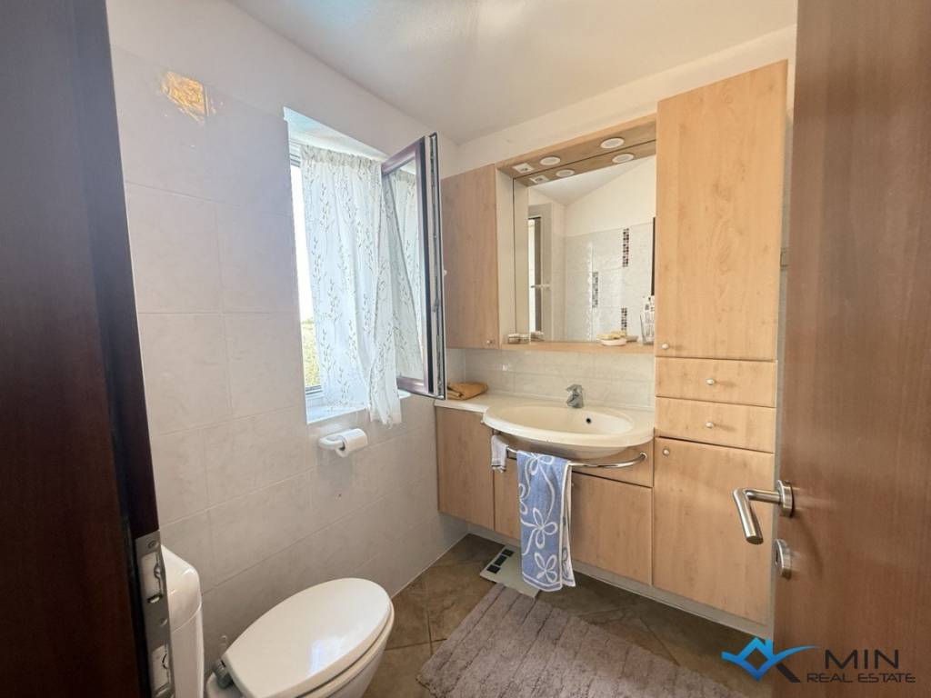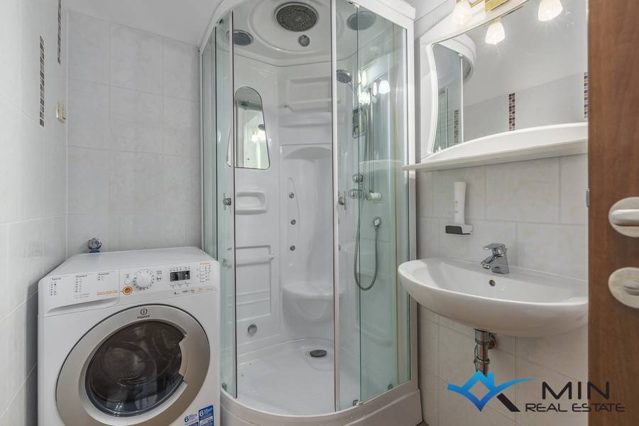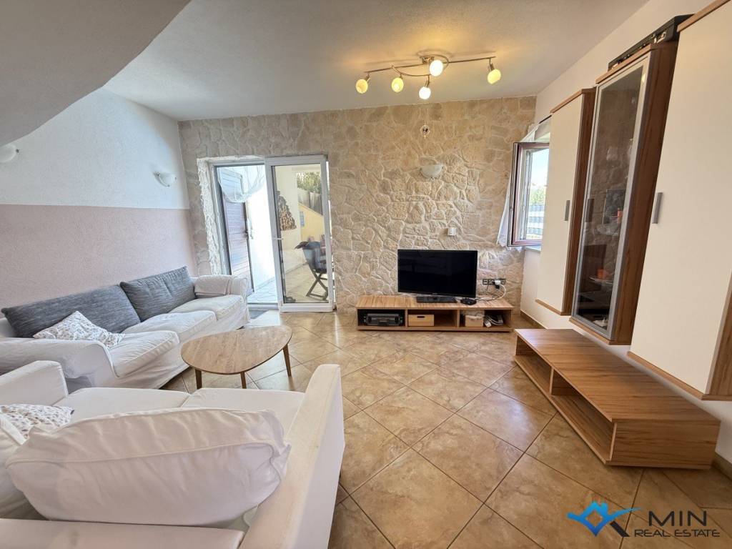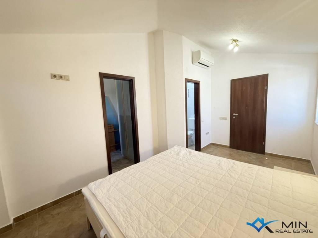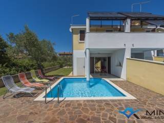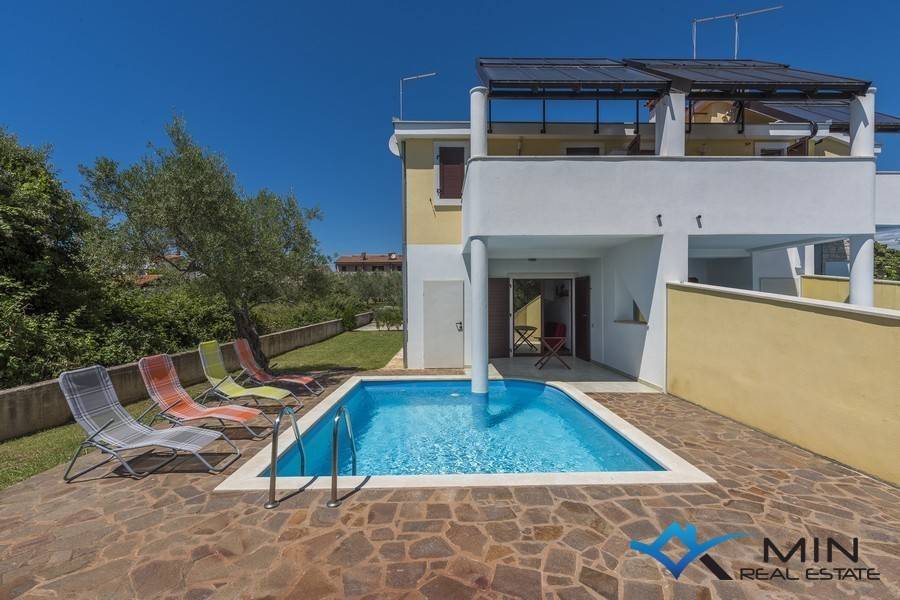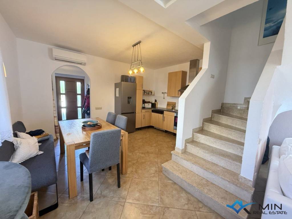 A terraced house for sale with a swimming pool in a quiet location 2.5 km from the sea and a beautifully landscaped beach and the city center. The house has 112 m2 and consists of a ground floor and a first floor. On the ground floor there is an entrance hall, a bathroom, a kitchen with a dining room and a living room with access to a covered terrace and garden. The garden is 214 m2 and there is a 19 m2 swimming pool. On the first floor there is a bedroom with a private bathroom and access to the terrace with a view of the sea.The second bedroom has a private bathroom and a walk-in closet. Every room in the apartment is equipped with air conditioning, while there is underfloor heating in the living room and on the 1st floor. The house also has solar panels that heat the hot water in the house, underfloor heating and the pool. The house has 2 parking spaces. The house is being sold fully furnished.