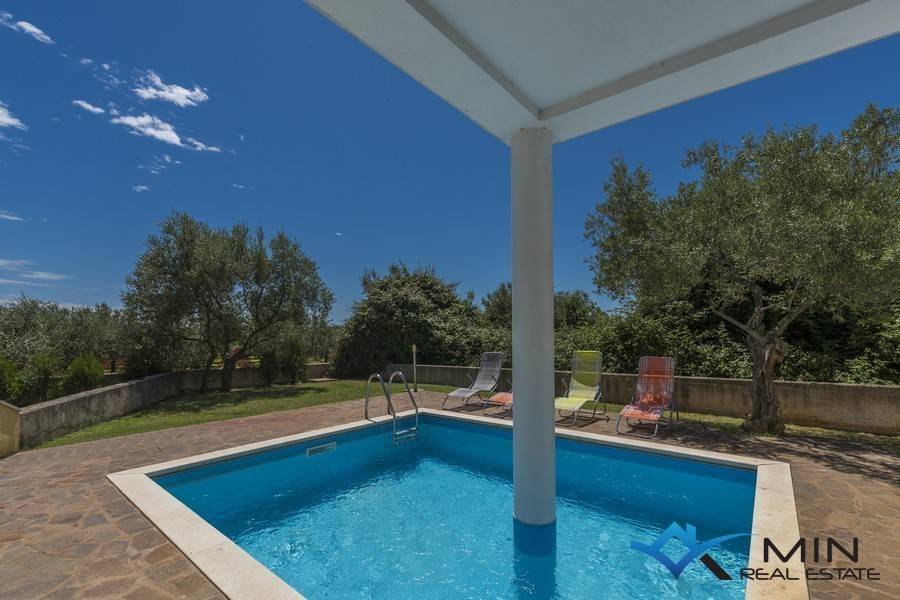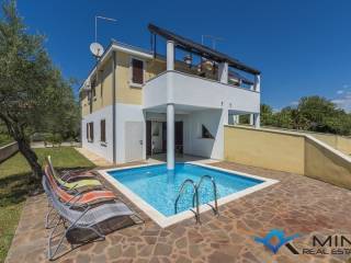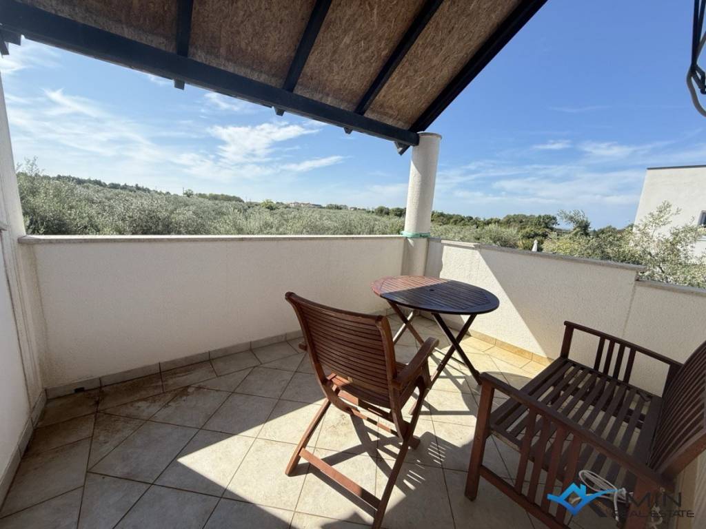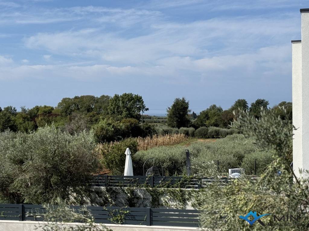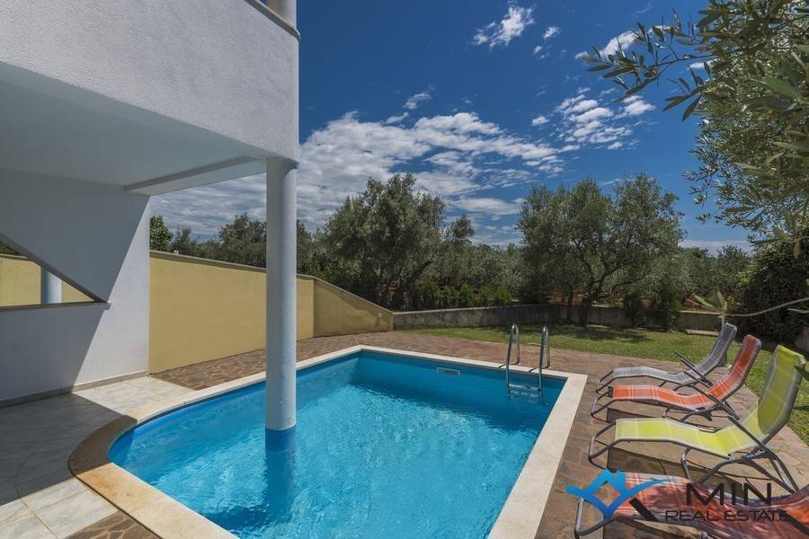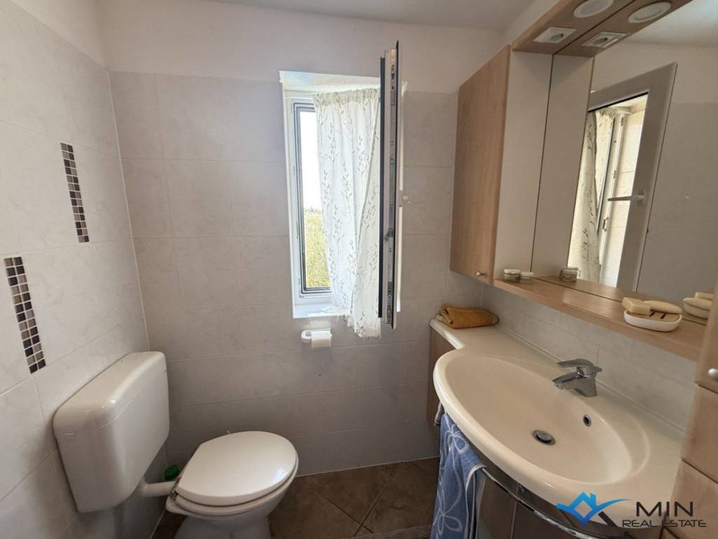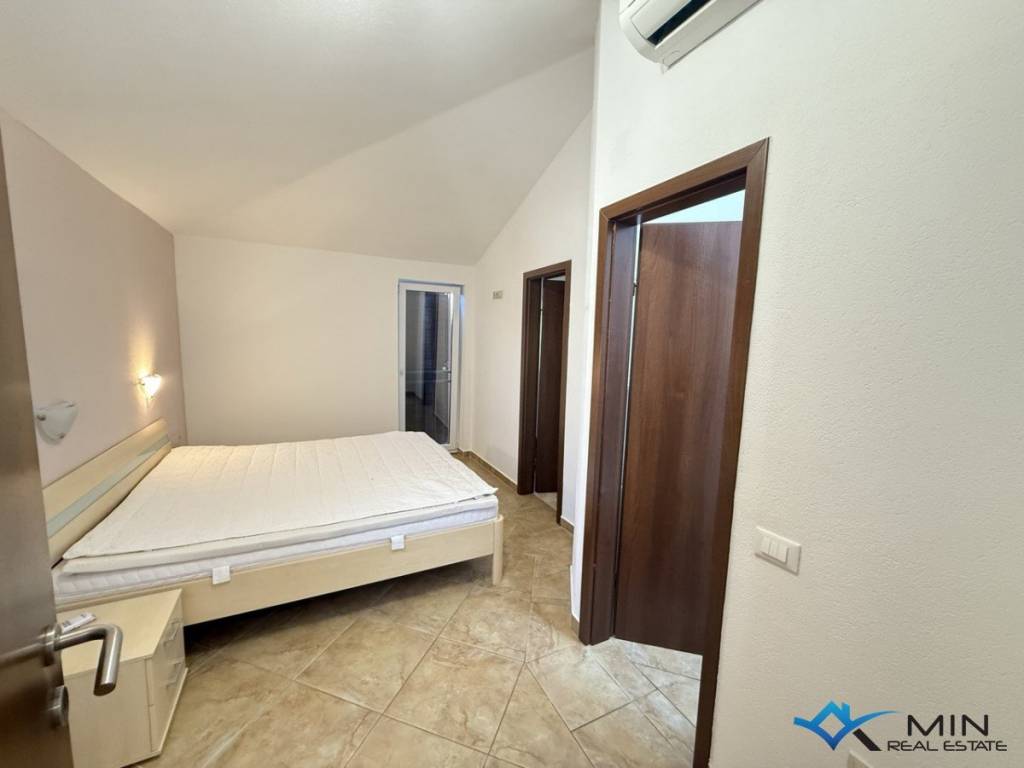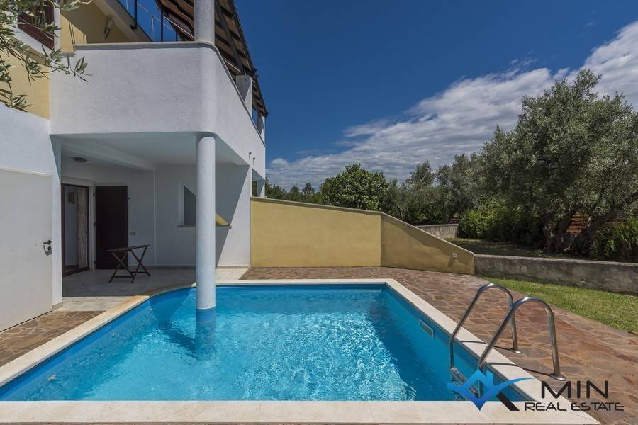 A terraced house for sale with a swimming pool in a quiet location 2.5 km from the sea and a beautifully landscaped beach and the city center. The house has 112 m2 and consists of a ground floor and a first floor. On the ground floor there is an entrance hall, a bathroom, a kitchen with a dining room and a living room with access to a covered terrace and garden. The garden is 214 m2 and there is a 19 m2 swimming pool. On the first floor there is a bedroom with a private bathroom and access to the terrace with a view of the sea.The second bedroom has a private bathroom and a walk-in closet. Every room in the apartment is equipped with air conditioning, while there is underfloor heating in the living room and on the 1st floor. The house also has solar panels that heat the hot water in the house, underfloor heating and the pool. The house has 2 parking spaces. The house is being sold fully furnished.