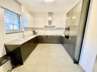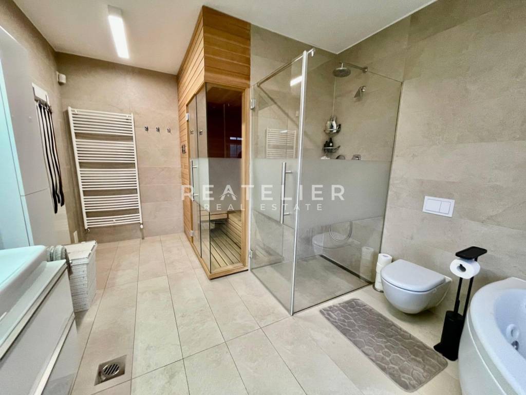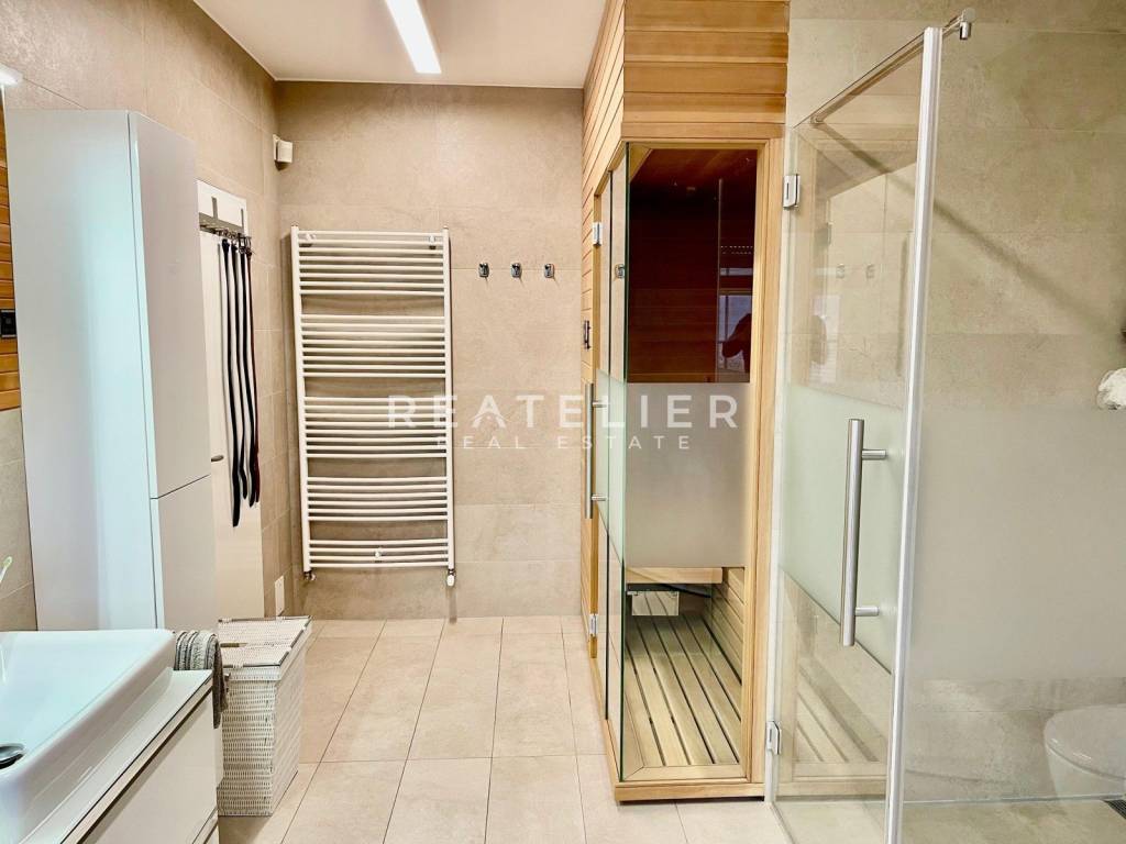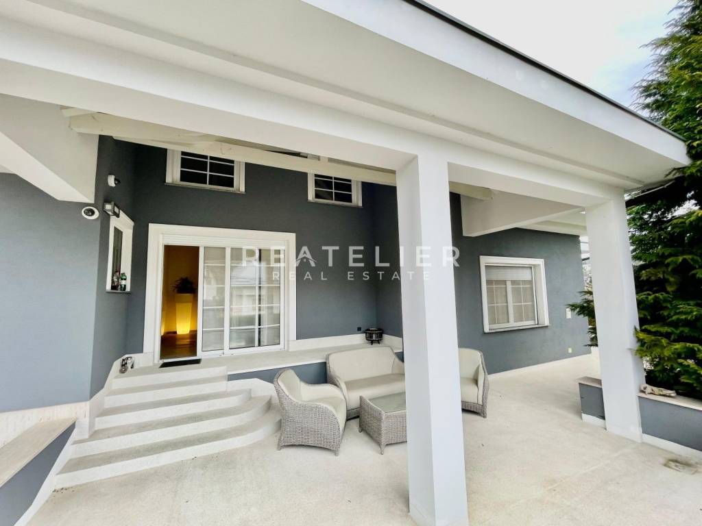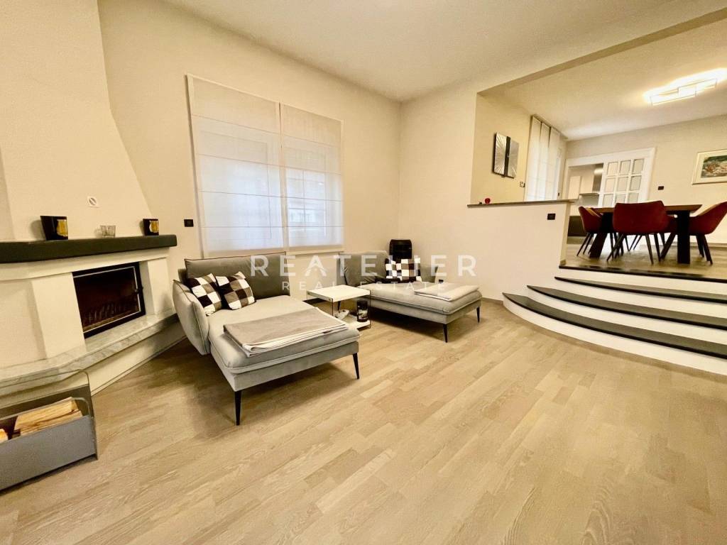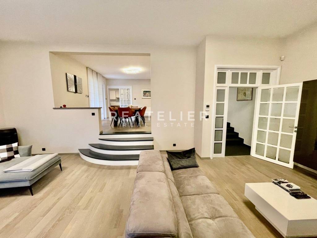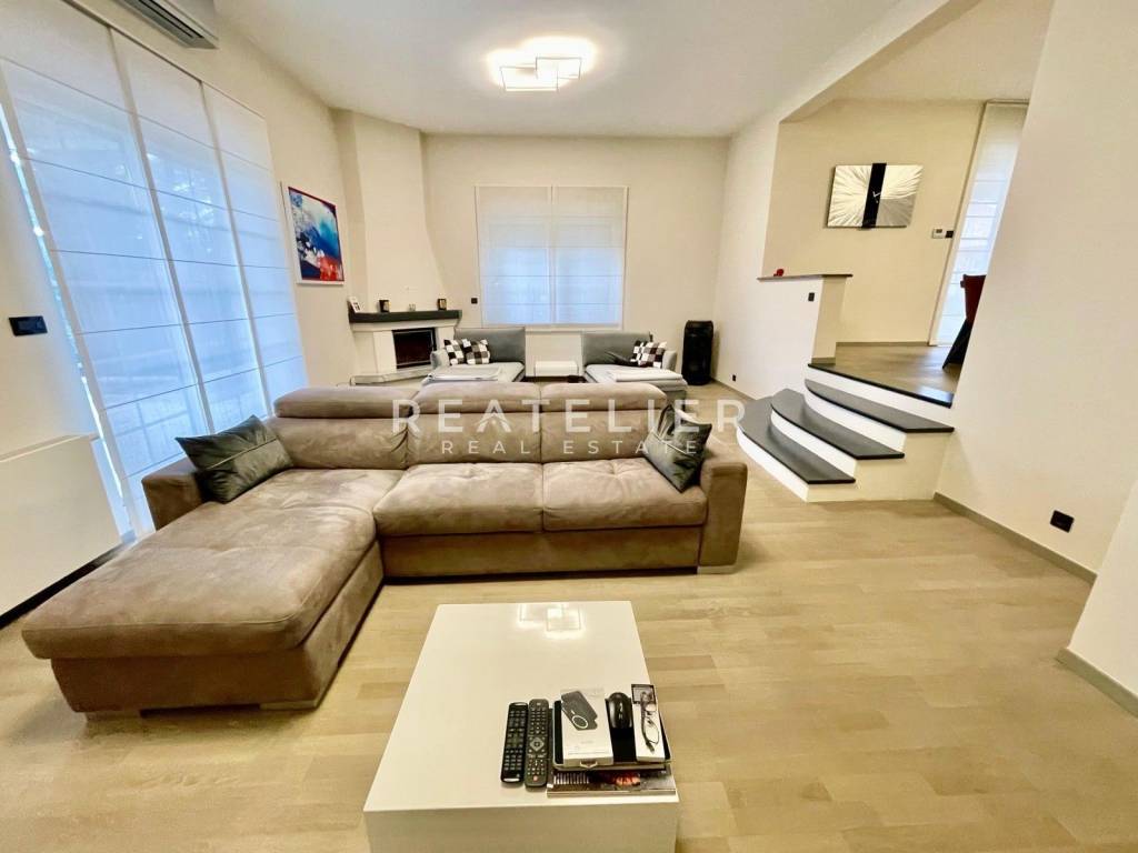 The villa is filled with natural light and built with high-quality materials, including ALU joinery, central gas heating, electric shutters, an alarm system, and video surveillance. The façade is clad in travertine, and as part of a thorough renovation in 2018, a new roof, parquet flooring, bathroom with a sauna, and a fully equipped Bosch kitchen were installed. The spacious terrace is furnished with designer outdoor furniture, and in addition to garage parking, two additional parking spaces are available in the courtyard.