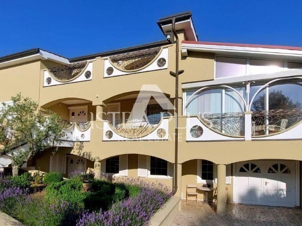 A detached house for sale with a total area of 357 m2 in the vicinity of Poreč, consists of a large two-story apartment on the ground floor and first floor of the house with an area of 259 m2, an apartment of 51 m2, a garage of 25 m2, a tavern and a storage room. The two-story apartment consists of a living room, a closed terrace (winter garden) with a view of the sea, 5 rooms, 3 bathrooms, a guest toilet and a balcony.