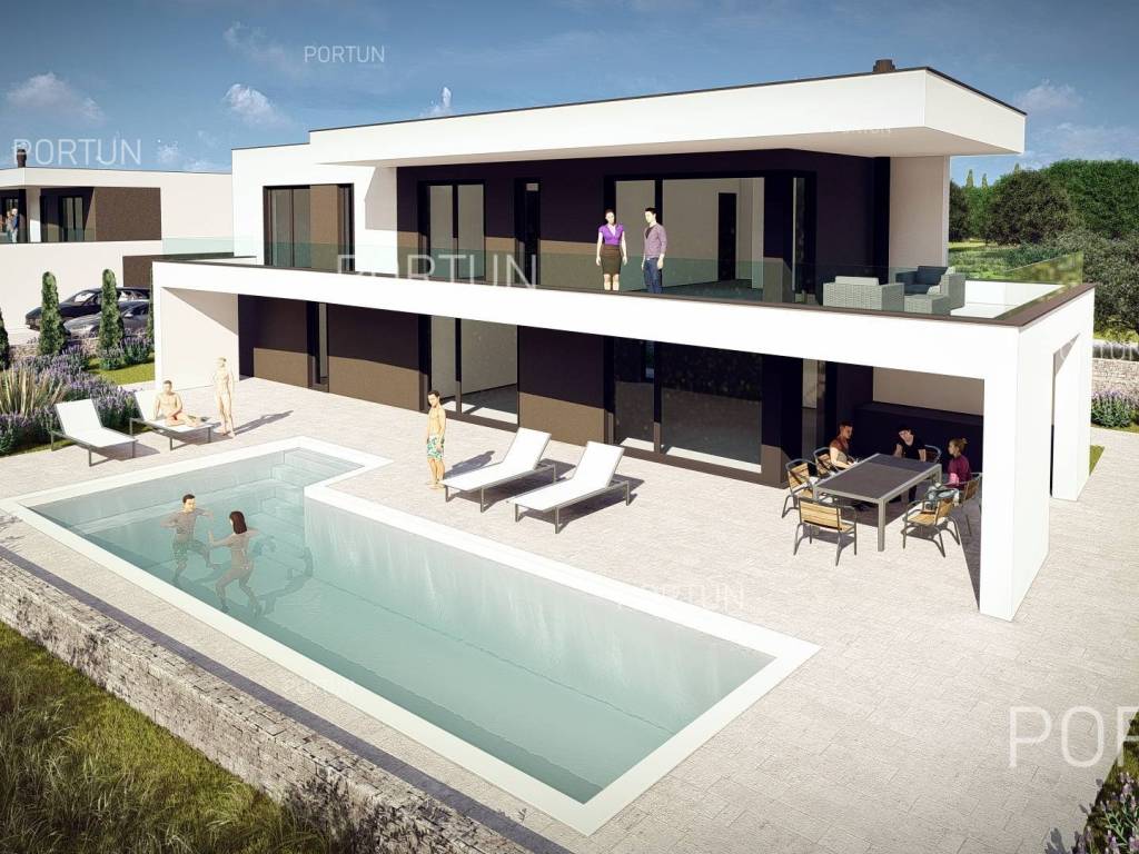U tihoj seoskoj idili na području općine Kanfanar, svega 20 km udaljenoj od Rovinja, prodaje se zemljište s projektom i građevinskom dozvolom za izgradnju moderne vile s tri spavaće sobe. Ova suvremena vila ističe se ravnim površinama, prostranim natkrivenim terasama i duboko uvučenim prozorima s velikim staklenim površinama. Takav koncept omogućuje da zimi sunce grije kuću, dok se ljeti sprječava nepoželjno pregrijavanje. Velike nadstrešnice također pružaju ugodnu hladovinu s mnogo prostora za opuštanje i boravak. Unutrašnjost je moderno uređena i podijeljena na dvije etaže, pri čemu je gornja etaža s tri velike spavaće sobe namijenjena noćenju. Sve spavaće sobe imaju vlastite kupaonice, a najveća soba ima i terasu s hidromasažnom kadom. S te etaže pruža se predivan pogled sve do mora u lijepim sunčanim danima, a budući da je kuća orijentirana prema zapadu, s prvog kata se može vidjeti zalazak sunca u more. Prizemlje je većim dijelom zauzeo masivan dnevni boravak s kuhinjom i blagovaonicom, te dvije natkrivene terase ukupne površine gotovo 70 četvornih metara. U prizemlju se nalaze predsoblje, jedna kupaonica, ulazni hol sa stubištem te pomoćne prostorije - tehnička soba i praonica rublja. Vila se nalazi na zemljištu površine 967 četvornih metara, većim dijelom predviđenom za uređenje kao zelena površina s bujnim raslinjem, okružena kamenim zidom. Na ulazu u dvorište ostavljen je prostor za kamenom popločano parkiralište, iz kojega staza vodi prema vili. Bazen zajedno sa sunčalištem nalazi se na zapadnom dijelu zemljišta, idealno smješten pred dnevnim boravkom. Vila je savršeno smještena na mirnoj seoskoj lokaciji, pogodnoj za izlete do obližnjeg Rovinja, Limskog zaljeva, Bala i Svetvinčenta. Trgovine i gostionice se mogu pronaći u par kilometara udaljenom Kanfanaru ili Žminju. LokacijaIstra predstavlja idealan spoj kristalno čistog mora, brežuljaka i dolina, razigranih rijeka i slapova, suncem okupanih vinograda temnogobrojnih povijesnih i kulturnih znamenitosti. Idilična, zelenilom okružena lokacija u Istri, nedaleko Kanfanara, gdje se nalazi kuća, nudi brojne prednosti:More | Plaža 20 km Usluge | Dućan 1,2 km - Kafić ili bar 2,2 km - Gostionica ili restoran 5,3 km - Osnovna škola 2 km - Apoteka 8 km Sport i zabava | Nogometno igralište 2 km - Adrenalinski park 15 km Mjesta u blizini | Rovinj 19 km - Pula 37 km Promet | Ulaz na autocestu Kanfanar 4 km - Zračna luka Pula 36 km Zanimljivosti | Ruševine srednjovjekovnog Dvigrada 5 km - Jama Feštinsko Kraljevstvo 12 km RasporedProstrana kuća zanimljivog rasporeda, površine 249 četvornih metara, prostire se kroz dvije etaže, odnosno kroz prizemlje i 1. kat. Prizemlje | Ulaz u kuću je na razini prizemlja. U sklopu ovog kata se nalaze dnevni boravak s kuhinjom i blagovaonicom 58,80 m2, ljetna kuhinja 13,69 m2, natkrivena terasa, wc, hodnik, natkriveni ulaz, kotlovnica, zona za opuštanje i praonica. 1. Kat | Unutarnje dvokrake stepenice vode na gornju etažu, odnosno na 1. kat. U sklopu ove etaže se nalaze tri spavaće sobe s kupaonicama, natkrivena terasa, hodnik i spremište. Parking Parkiralište za dva automobilaSvojstva kućeUlaz u kuću je izveden u razini prizemlja, sa jugoistočne strane, a vertikalna komunikacija se odvija putem unutarnjeg stubišta. Osnovne arhitektonske karakteristike ove moderno koncipirane katnice su: Etaže | Prizemlje + 1. kat Orijentacija | Zapad Vanjski zidovi | ETICS fasada 10 cm + Zid iz blok opeke 25 cm Armirano betonska međukatna konstrukcija Krovište | Ravni krovNamještaj i opremaNamještaj | Namještaj nije uključen u cijenuOprema | Videoparlafon (instalacije) - Alarm (instalacije) - Rasvjeta (instalacije) - Sanitarije (instalacije)Stolarija | Alu-drvo stolarija s dvostrukim ostakljenjem Schüco - Aluminijske grilje - Komarnici - Aluminijska sigurnosna ulazna vrata - Sobna vrata iz masivnog drvaMultimedia | SAT TVPodne obloge | Keramičke pločice - ParketGrijanjePodno grijanje i hlađenje | Sve prostorijeRadijator | KupaoniceOkolišOgrade | ZidVanjski bazenSkimerski bazen 47,13 m2 | Betonska konstrukcija - Obloga: Pebble tec - Slana voda (dezinfekcija pomoću elektrolize klorom) - Grijanje vode Infrastruktura Priključak na elektroenergetsku mrežu Priključak na vodopskrbnu mrežu Biološki pročistač otpadnih voda Javni makadamski kolni putStatus nekretnineZemljište se u cijelosti nalazi unutar granica građevinskog područja. DokumentacijaRaspoloživa dokumentacija | Geodetska situacija - Građevinska dozvola - Glavni projektObračun površineU površinu kuće (249,05 m2) uračunate su površine ovih prostorija:Stambeni prostor (Prizemlje + 1. kat) = 186,02 m2Terasa (1. kat) = 5,14 m2Natkrivene terase (Prizemlje + 1. kat) = 57,89 m2Izvor podataka = Glavni projektUkupna površina zemljišta uključujući površinu ispod građevina(e) iznosi 967 četvornih metara. Izvor podataka = Geodetski projekt