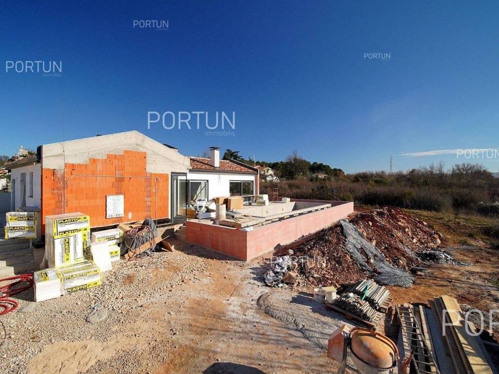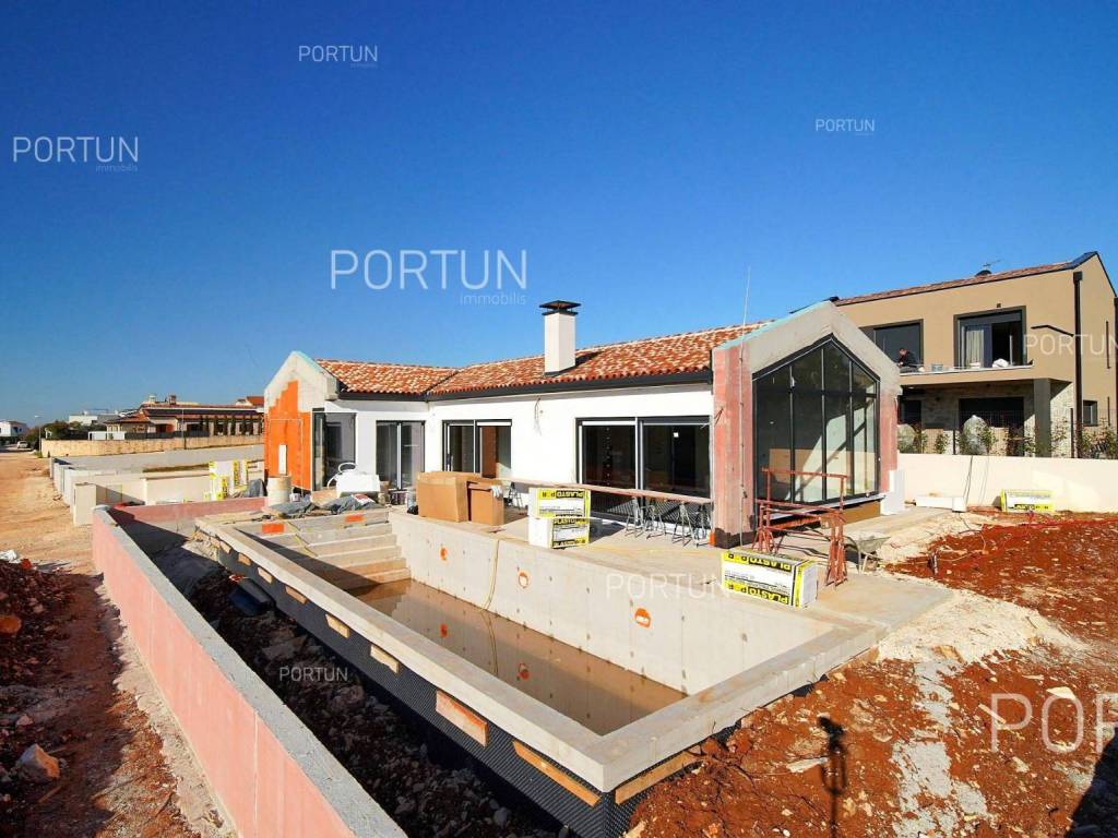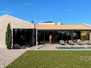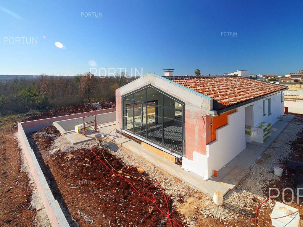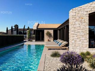 Introducing an exclusive modern stone villa with a pool, located in an idyllic setting near Poreč. This impressive property blends traditional Istrian charm with contemporary luxury, offering a perfect home for those seeking peace, privacy, and prestige. Situated on an elevated location, the villa offers panoramic views of the sea and greenery while ensuring top comfort and elegance.The main feature of the courtyard is the large pool, which seamlessly integrates into the villa's surroundings. It is surrounded by a spacious sun deck with comfortable loungers, inviting you to enjoy the sun all day long. The dazzling stone facade and contemporary lines make this villa an architectural gem. The combination of traditional elements and modern design creates a unique charm. High-quality materials and carefully selected details achieve a timeless elegance. Every corner of this residence exudes sophisticated style and thoughtful design, satisfying even the most demanding tastes.Situated on an elevation, the villa offers panoramic sea views and a picturesque landscape. Thanks to its southwest orientation, the interior is bathed in sunlight throughout the day, while in the evening, it provides spectacular sunsets over the sea horizon. Large glass walls frame these stunning views, blurring the boundary between interior and exterior.The spacious and bright open-concept living room is connected to an elegant dining area and a fully equipped modern kitchen. The three spacious bedrooms are designed as private retreats, offering a hotel-like luxury feel.The 500 m2 plot surrounding the villa has been transformed into a carefully designed Mediterranean garden with olive trees and lavender, creating an authentic Istrian ambiance. Expansive stone terraces around the house are ideal for outdoor dining and relaxation.The villa features a modern heating and cooling system that ensures a comfortable climate throughout the year. In winter, warmth is provided by underfloor heating connected to an efficient heat pump, keeping the home cozy even on the coldest days. In summer, a high-quality air conditioning system cools every room, with individual units allowing precise temperature control.Located in a peaceful neighborhood near Poreč, this villa enjoys the advantages of a prestigious location close to the sea and all amenities. Beautiful beaches and the historic center of Poreč, with numerous restaurants, cafes, and cultural attractions, are just a few minutes' drive away. The surrounding area offers shops, wineries, and other facilities necessary for a comfortable stay. Excellent transport connections ensure quick access to the highway leading to the rest of Istria, while Pula International Airport is about 45 minutes away. Don't miss the opportunity to own this exclusive villa and enjoy the charms of Istrian luxury. Contact us for more information and to schedule a viewing.Distances from the propertyPoreč | 6 kmSea | Beach 5 km Services | Food store 1000 m - Cafe or bar 900 m - Inn or restaurant 1000 m - Pharmacy 800 m Sports and fun | Soccer field 1000 m - Basketball court 950 m - Cycling and hiking trail Parenzana 9 km Nearby towns | Vrsar 18 km - Umag 23 km Traffic | Highway entry Višnjan 9 km - Pula Airport 63 km Attractions | Geomorphological nature monument Baredine Pit 5 km - Protected forest in the Mirna river valley 20 km About the propertyThe estate which extends to 500 square meters comprises: One storey house | 3 Bedrooms - 2 Bathrooms - 1 Floor - 158,94 m2Swimming pool | 45,00 m2About the houseThe entrance to the house is from the southwest side. The basic architectural characteristics of this modernly designed one-story house are: Floors | Ground floor Orientation | Southeast External walls | Styrofoam insulation 10 cm + Block brick wall 25 cm Roof | Pitched roof covered with clay tiles Construction began in 2024/2 | Planned completion of construction in 2025/9Furniture and equipmentFurniture | All furniture is included in the priceEquipment | Alarm system for the house - Video surveillanceJoinery | Aluminum joinery with double glazing - PVC joinery with double glazing - Aluminum entry door - Classic interior doorsMultimedia | SAT TVHeating and cooling | Underfloor heating with a heat pump - Air conditioning - Heat pumps - ChimneyOutdoor spaceGreen areas | Olive treeEquipment | Charger for electric vehicles - Automatic irrigation - Drip irrigationFences | Leylandii cypress hedge - A wall with a metal fenceDriveway | Metal door - Motor drive - Slide openingOutdoor pool Skimmer pool 45,00 m2 | Concrete construction - Pool liner: Foil - Disinfection of water with chlorine Sunbathing area | Deckchairs - Outdoor shower Services Connection to the power grid Connection to the water supply network Biological waste water purifier Unpaved public access road | Distance to the paved road 58 mDocumentationExtracted documents | Building permit - Main projectArea calculationThe area of the house (158,94 m2) includes the areas of these spaces:Living area = 119,00 m2Terrace = 39,94 m2Data source = Main projectThe total land area including the footprint of the building(s) amounts to 500 square meters. Data source = Cadastre data