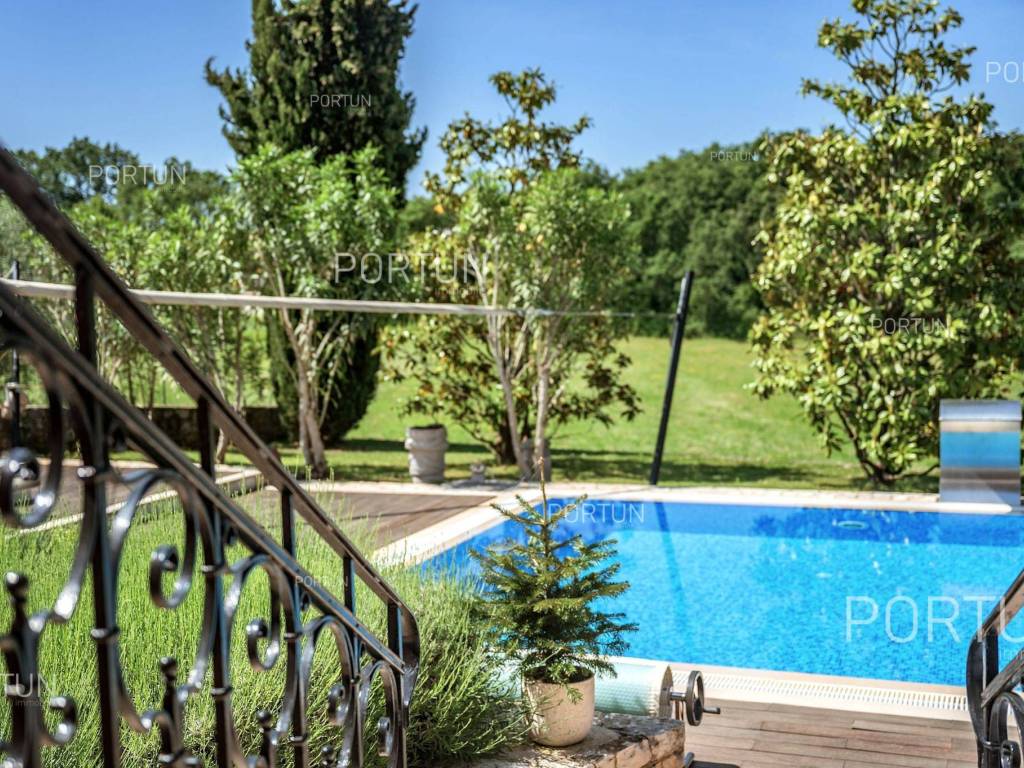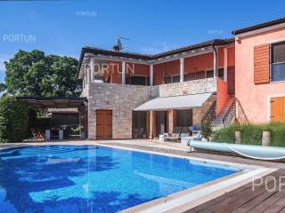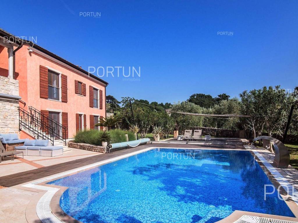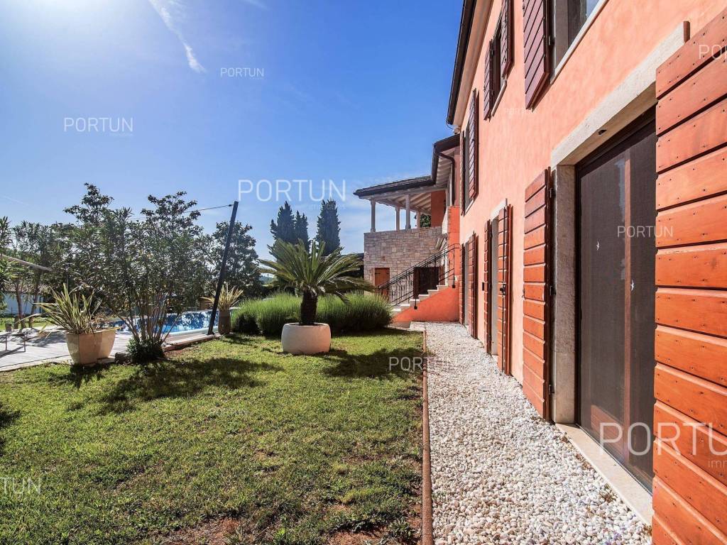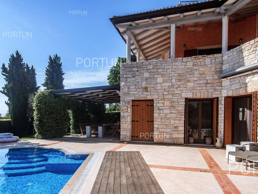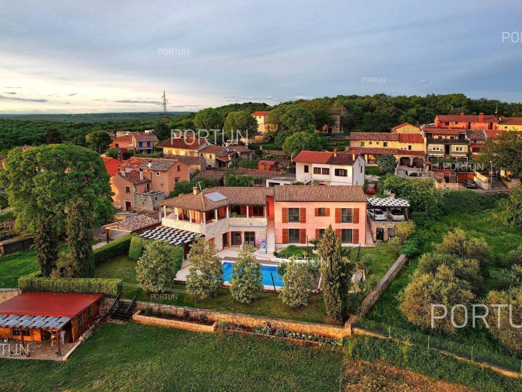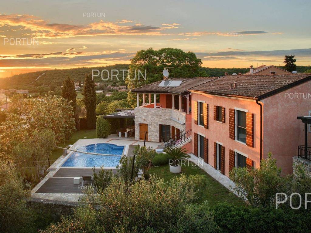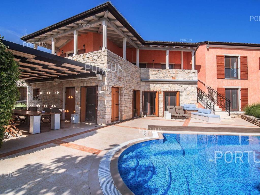 The charming villa boasting five bedrooms and a vast expanse of land showcases a Tuscan-inspired exterior, exquisitely adorned interiors, and a serene rural setting just a short drive from the renowned Rovinj Nestled on the outskirts of a quaint village, this villa offers the tranquility of countryside living while being conveniently close to Rovinj and the Lim Bay, renowned for its beaches, dining options, and cultural attractions. Sitting on a plot of land spanning nearly eight hundred square meters, the villa also includes an additional parcel of approximately four thousand six hundred square meters, situated on the southwest slope in front of the villa. This additional land offers the opportunity for constructing further buildings as it falls within the designated construction zone. It is encompassed within the listed price, though buyers solely interested in the villa with a smaller plot can negotiate a reduced price. The villa's exterior is already richly appointed, featuring a pool terrace, a covered outdoor kitchen terrace, a lush garden with Mediterranean flora, and a covered parking area equipped with an electric vehicle charger. The opulent interior spans two floors connected by an internal stone staircase. With five bedrooms, each boasting its own bathroom, the villa is perfectly suited for a larger family home. Additionally, being fully furnished, it presents an attractive option for investors seeking rental income. The interior is impeccably decorated with unique furniture pieces, high-end appliances, carefully curated lighting fixtures, and decorative accents, all meticulously arranged to provide maximum comfort and leave a lasting impression on guests. A modern heating and cooling system, powered by a heat pump and fan coil, ensures optimal indoor temperatures, while built-in solar collectors contribute to reduced electricity consumption and environmental sustainability. If you desire a countryside property offering luxury, comfort, and freedom, this villa is a rare find in the Rovinj area. Don't hesitate to contact us to seize this exceptional opportunity. LocationIn Istria you have an opportunity to enjoy in panoramic views from the small medieval towns, traditional gastronomy based on homemade, organic grown food or active vacation on the seaside and mountain peaks. On the west coast of Istria is picturesque Rovinj - known for its romantic old town center, the protected Zlatni rt forest park of high aesthetic and botanical value, a rich gastronomic offer and tempting beaches. A wonderful panoramic location in the western part of Istria, not far from Rovinj, where the house is positioned, offers a whole spectrum of amenities nearby:Sea | Beach 6 km Services | Food store 3,5 km - Cafe or bar 3,5 km - Inn or restaurant 3,6 km - Elementary School 3 km - Kindergarten 3 km - Health center 10 km - Marina 10 km Sports and fun | Basketball court 3 km - Public swimming pool 11 km - Special forest vegetation reserve "Kontija" 9 km Nearby towns | Svetvinčenat 14 km - Poreč 23 km Traffic | Highway entry Kanfanar 5 km - Pula Airport 36 km Attractions | Abandoned medieval town Dvigrad 11 km About the propertyThe estate which extends to 5.383 square meters comprises: Main house | 5 Bedrooms - 6 Bathrooms - 2 Floors - 301,80 m2Garden house | 1 Floor - 33,00 m2Swimming pool | 43,00 m2LayoutThe luxuriously decorated house, with 302 square meters, is spread over two floors, namely the ground floor and the 1st floor. Ground floor | The entrance to the house is on the ground floor. This 169,50 m2 floor includes a living room with kitchen and dining room, a summer kitchen, two bedrooms with en suite bathrooms, a covered terrace, one bathroom, a lavatory, a corridor, a staircase, a boiler room, a laundry and 2x storage space. First floor | Internal straight stairs lead to the upper level, that is to the 1st floor. This 132,30 m2 level features three bedrooms with en suite bathrooms and a covered terrace. The three most important rooms in this house are The living room with kitchen and dining room | Ground floor - 54,50 m2 - Southwest facing - Spacious living room - Exit to the yard - Three-seater - Armchair - Coffee table - TV - Brick fireplace - L-shaped kitchen - Equipped with household appliances - Kitchen counter - Coffee machine - Stove - Oven - Kitchen hood - Dishwasher - Refrigerator with freezer - Massive wooden table - 8 ChairsThe covered terrace | First floor - 39,80 m2 - Southwest facing - View of the sea in the distance - Modern sofa setThe outdoor kitchen | 35,40 m2 - Southwest facing - Single-line kitchen - Equipped with household appliances - Kitchen counter - Stove with oven - Kitchen hood - Wine cooler - Wooden table - 10 ChairsExtras Parking canopy for two cars Garden houseAbout the houseThe entrance to the house is on the ground floor level, from the northeast side, and vertical communication takes place via an internal staircase. The basic architectural characteristics of this well-designed two-story building are: Floors | Ground floor + First floor Orientation | Southwest External walls | Stone wall + Styrofoam insulation + Block brick wall | Styrofoam insulation + Block brick wall Concrete slab floors Roof | Pitched roof covered with clay tiles E.P.C. B Built in 2009Furniture and equipmentFurniture | Rustic furnitureEquipment | Parlaphone - Alarm system for the house - Video surveillance - Modern sanitary ware - Bathroom furniture - Wall panelingJoinery | Wooden joinery with double glazing - Wooden shutters - Mosquito screens - Anti-burglary entry door - Interior doors made of solid woodMultimedia | TV in the living room - TV in each bedroom - SAT TVHeating and cooling | Central heating - gas - Central heating with a heat pump - Fan coils - Fireplace - Solar collectors - Combined water boiler - Bathroom radiatorsFlooringTop quality ceramic tiles | Ground floor (Bathrooms) - First floor (Bathrooms - Covered terrace)Plank floor | Ground floor (Living room with kitchen an