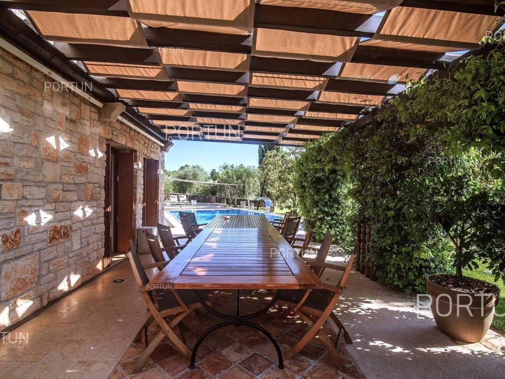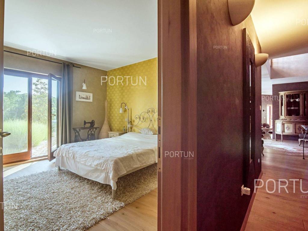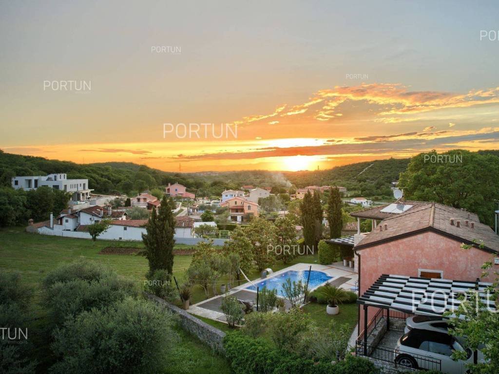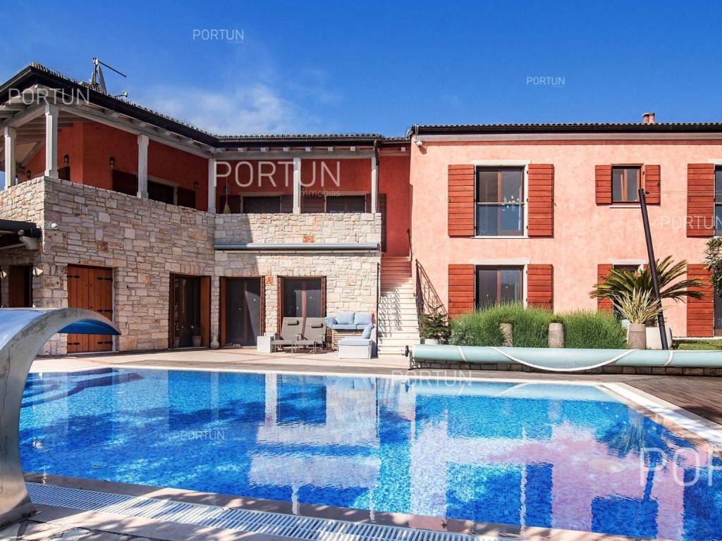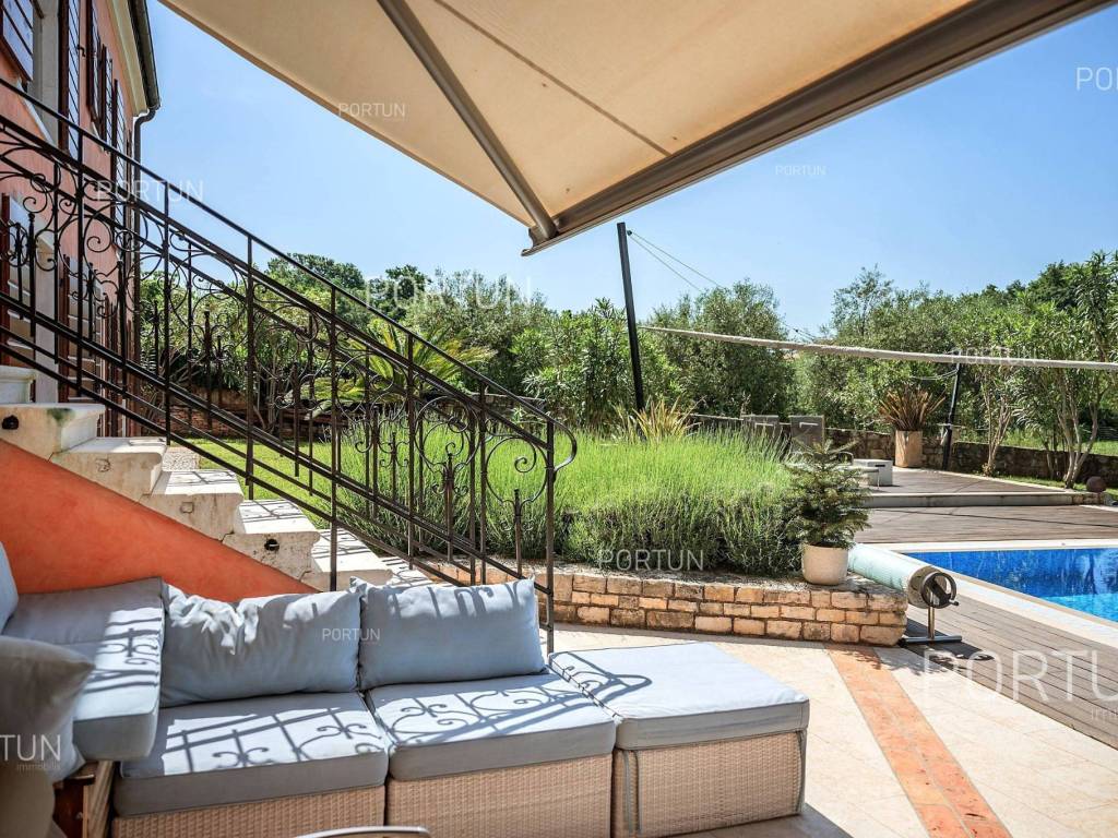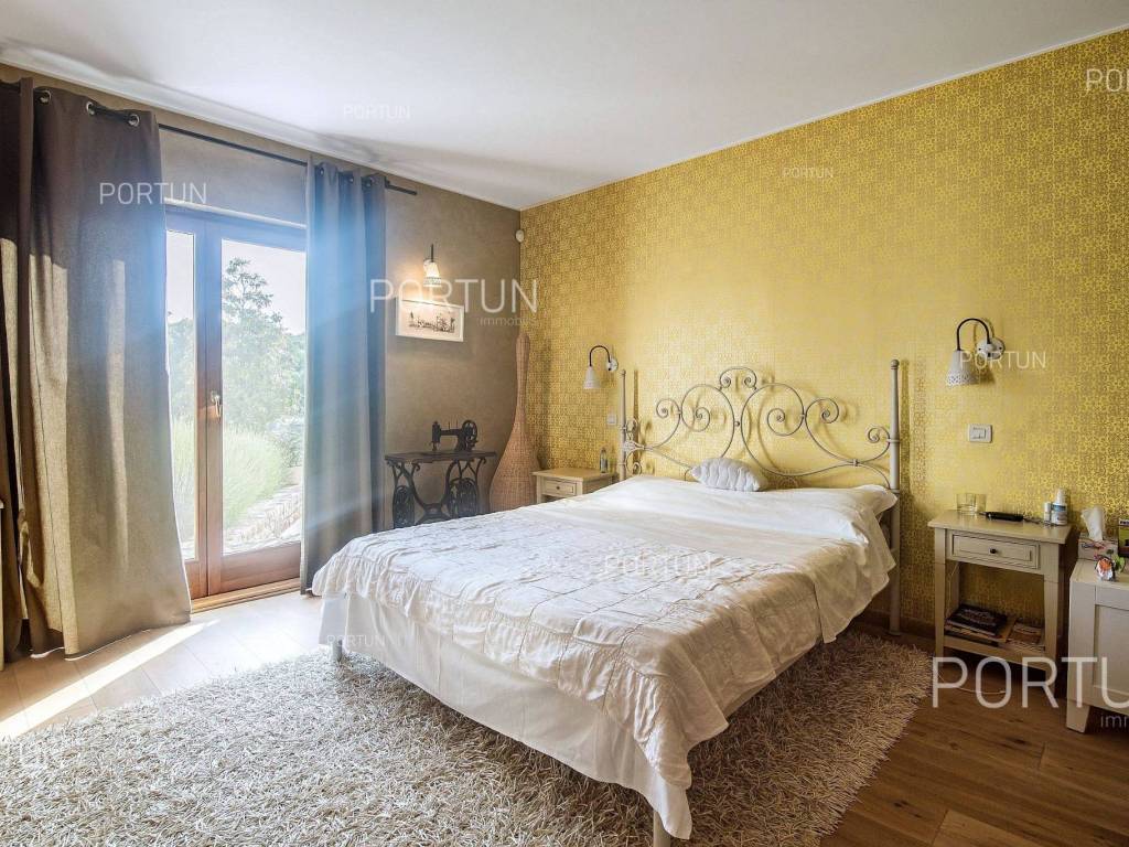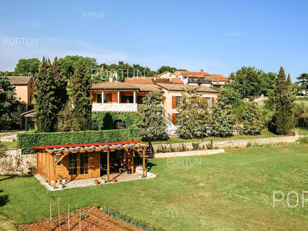 The charming villa boasting five bedrooms and a vast expanse of land showcases a Tuscan-inspired exterior, exquisitely adorned interiors, and a serene rural setting just a short drive from the renowned Rovinj Nestled on the outskirts of a quaint village, this villa offers the tranquility of countryside living while being conveniently close to Rovinj and the Lim Bay, renowned for its beaches, dining options, and cultural attractions. Sitting on a plot of land spanning nearly eight hundred square meters, the villa also includes an additional parcel of approximately four thousand six hundred square meters, situated on the southwest slope in front of the villa. This additional land offers the opportunity for constructing further buildings as it falls within the designated construction zone. It is encompassed within the listed price, though buyers solely interested in the villa with a smaller plot can negotiate a reduced price. The villa's exterior is already richly appointed, featuring a pool terrace, a covered outdoor kitchen terrace, a lush garden with Mediterranean flora, and a covered parking area equipped with an electric vehicle charger. The opulent interior spans two floors connected by an internal stone staircase. With five bedrooms, each boasting its own bathroom, the villa is perfectly suited for a larger family home. Additionally, being fully furnished, it presents an attractive option for investors seeking rental income. The interior is impeccably decorated with unique furniture pieces, high-end appliances, carefully curated lighting fixtures, and decorative accents, all meticulously arranged to provide maximum comfort and leave a lasting impression on guests. A modern heating and cooling system, powered by a heat pump and fan coil, ensures optimal indoor temperatures, while built-in solar collectors contribute to reduced electricity consumption and environmental sustainability. If you desire a countryside property offering luxury, comfort, and freedom, this villa is a rare find in the Rovinj area. Don't hesitate to contact us to seize this exceptional opportunity. LocationIn Istria you have an opportunity to enjoy in panoramic views from the small medieval towns, traditional gastronomy based on homemade, organic grown food or active vacation on the seaside and mountain peaks. On the west coast of Istria is picturesque Rovinj - known for its romantic old town center, the protected Zlatni rt forest park of high aesthetic and botanical value, a rich gastronomic offer and tempting beaches. A wonderful panoramic location in the western part of Istria, not far from Rovinj, where the house is positioned, offers a whole spectrum of amenities nearby:Sea | Beach 6 km Services | Food store 3,5 km - Cafe or bar 3,5 km - Inn or restaurant 3,6 km - Elementary School 3 km - Kindergarten 3 km - Health center 10 km - Marina 10 km Sports and fun | Basketball court 3 km - Public swimming pool 11 km - Special forest vegetation reserve "Kontija" 9 km Nearby towns | Svetvinčenat 14 km - Poreč 23 km Traffic | Highway entry Kanfanar 5 km - Pula Airport 36 km Attractions | Abandoned medieval town Dvigrad 11 km About the propertyThe estate which extends to 5.383 square meters comprises: Main house | 5 Bedrooms - 6 Bathrooms - 2 Floors - 301,80 m2Garden house | 1 Floor - 33,00 m2Swimming pool | 43,00 m2LayoutThe luxuriously decorated house, with 302 square meters, is spread over two floors, namely the ground floor and the 1st floor. Ground floor | The entrance to the house is on the ground floor. This 169,50 m2 floor includes a living room with kitchen and dining room, a summer kitchen, two bedrooms with en suite bathrooms, a covered terrace, one bathroom, a lavatory, a corridor, a staircase, a boiler room, a laundry and 2x storage space. First floor | Internal straight stairs lead to the upper level, that is to the 1st floor. This 132,30 m2 level features three bedrooms with en suite bathrooms and a covered terrace. The three most important rooms in this house are The living room with kitchen and dining room | Ground floor - 54,50 m2 - Southwest facing - Spacious living room - Exit to the yard - Three-seater - Armchair - Coffee table - TV - Brick fireplace - L-shaped kitchen - Equipped with household appliances - Kitchen counter - Coffee machine - Stove - Oven - Kitchen hood - Dishwasher - Refrigerator with freezer - Massive wooden table - 8 ChairsThe covered terrace | First floor - 39,80 m2 - Southwest facing - View of the sea in the distance - Modern sofa setThe outdoor kitchen | 35,40 m2 - Southwest facing - Single-line kitchen - Equipped with household appliances - Kitchen counter - Stove with oven - Kitchen hood - Wine cooler - Wooden table - 10 ChairsExtras Parking canopy for two cars Garden houseAbout the houseThe entrance to the house is on the ground floor level, from the northeast side, and vertical communication takes place via an internal staircase. The basic architectural characteristics of this well-designed two-story building are: Floors | Ground floor + First floor Orientation | Southwest External walls | Stone wall + Styrofoam insulation + Block brick wall | Styrofoam insulation + Block brick wall Concrete slab floors Roof | Pitched roof covered with clay tiles E.P.C. B Built in 2009Furniture and equipmentFurniture | Rustic furnitureEquipment | Parlaphone - Alarm system for the house - Video surveillance - Modern sanitary ware - Bathroom furniture - Wall panelingJoinery | Wooden joinery with double glazing - Wooden shutters - Mosquito screens - Anti-burglary entry door - Interior doors made of solid woodMultimedia | TV in the living room - TV in each bedroom - SAT TVHeating and cooling | Central heating - gas - Central heating with a heat pump - Fan coils - Fireplace - Solar collectors - Combined water boiler - Bathroom radiatorsFlooringTop quality ceramic tiles | Ground floor (Bathrooms) - First floor (Bathrooms - Covered terrace)Plank floor | Ground floor (Living room with kitchen an