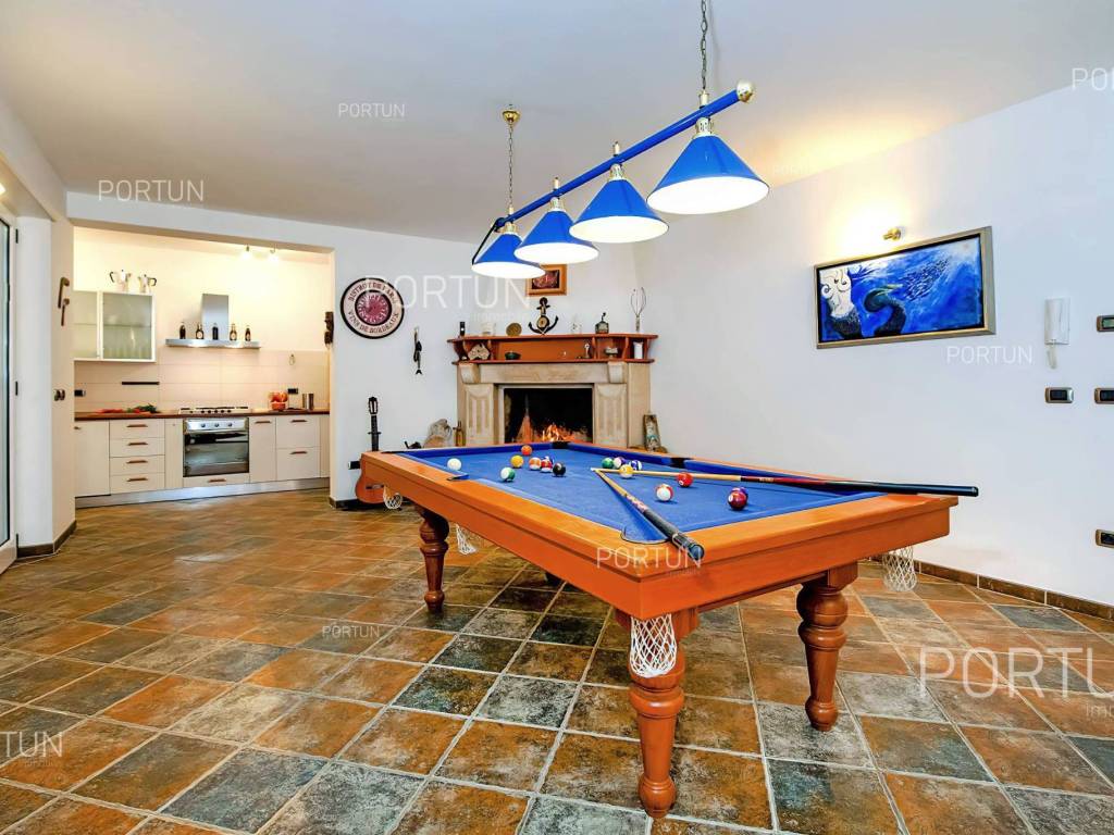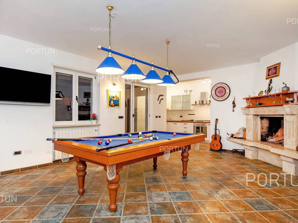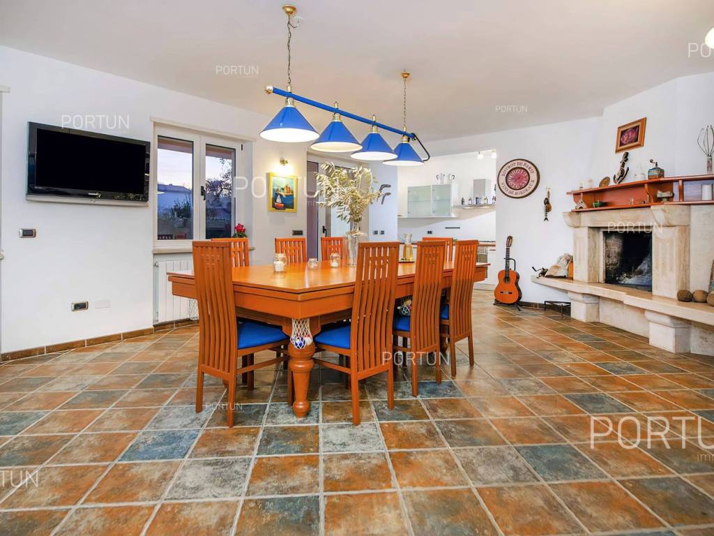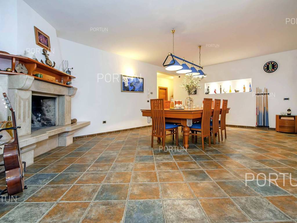 This impressive house is designed as an exclusive residence for two families, providing them with ample shared space for socializing and entertainment. Located in a rural setting not far from Rovinj, this house offers plenty of indoor and outdoor space, complete equipment, and quality furniture. Built in 2005, this house stands out with its large rooms, quality construction, and contemporary furniture. It is situated on a plot of land larger than 1,700 square meters, mostly covered with lawn and lush green hedges. In the southwest part of the yard, there is a 32 m2 swimming pool with a sunbathing area, alongside which there is a canopy with a summer kitchen. The house consists of two apartments; the larger apartment with three bedrooms and two bathrooms is located on the first floor, while the smaller apartment with one bedroom and one bathroom is on the ground floor. The ground floor also includes a boiler room, laundry room, storage room, two garages, and a large gathering room equipped with an impressive fireplace, a billiard table, a fully equipped kitchen, and a dining area. In recent years, the house has been rented out and has become a popular choice for multiple families looking to spend their vacation together in a peaceful village near Rovinj. LocationOne of the most developed and beautiful regions of Croatia is green-blue Istria, known as the "new Tuscany", which represents a combination of unique natural sights and rich cultural heritage. Well known Istrian gem - Rovinj, once a small fishing port and now a famous touristic destination, with the countless colorful houses, charming waterfront with the lovely cafés, the beautiful harbor, theidyllic beaches and the offshore islands creates a breathtaking ambience. Quiet residential location not far from Rovinj, where the house is positioned, offers numerous attractions and facilities at your fingertips:Sea | Beach 7 km Services | Food store 950 m - Cafe or bar 700 m - Inn or restaurant 650 m - Elementary School 1,4 km - Health center 7 km Sports and fun | Soccer field 2 km - Basketball court 950 m - Public swimming pool 7,5 km - Forrestal park Punta Corrente 8,5 km Nearby towns | Kanfanar 11 km - Bale 13 km Traffic | Highway entry Kanfanar 8 km - Pula Airport 39 km Attractions | Abandoned medieval town Dvigrad 14 km About the propertyThe estate which extends to 1.149 square meters comprises: Main house | 2 Apartments - 4 Bedrooms - 3 Bathrooms - 2 Floors - 550,00 m2Summer kitchen | 1 Floor - 30,00 m2Swimming pool | 32,00 m2LayoutThe spacious house, with 550 square meters, is spread over two floors, namely the ground floor and the 1st floor. Ground floor | The entrance to the house is on the ground floor. This 275,00 m2 floor includes a one-bedroom apartment, a covered terrace, a lavatory, a corridor, 2x garage, a boiler room, a wine cellar and a storage space. First floor | Internal turning stairs lead to the upper level, that is to the 1st floor. This 275,00 m2 level features the owner's flat, two bedrooms, a bedroom with en suite bathroom, two covered terraces, a corridor and a pantry. About the houseThe entrance to the house is on the ground floor level, from the southeast side, and vertical communication takes place via an internal staircase. The basic architectural characteristics of this well-maintained two-story building are: Floors | Ground floor + First floor Orientation | Southwest External walls | Block brick wall 25 cm Concrete slab floors Parking for three cars Built in 2005Furniture and equipmentFurniture | All furniture is included in the priceEquipment | Parlaphone - Modern lighting - Sanitary ware - Bathroom furnitureJoinery | PVC joinery with double glazing - Motorized blinds - Security solid wood door - Classic interior doorsMultimedia | TV in the living room - SAT TVHeating and cooling | Central heating - gas - Radiators - Fireplace - Electric boiler 300L - Gas boiler - ChimneyFlooring | Top quality ceramic tiles - ParquetOutdoor spaceEquipment | Outdoor lighting - Automatic irrigation - Drip irrigationFences | Hedge - Concrete wallDriveway | Metal door - Motor drive - Wing opening - ParlaphonePedestrian entrance | Metal doorOutdoor pool Skimmer pool | Concrete construction - Pool liner: Pebble tec - Disinfection of water with chlorine - LED lighting - Parasols Sunbathing area | Wooden deckchairs - Shower Services Connection to the power grid Connection to the water supply network | Rainwater tank Connection to the sewage system Optical Internet Paved public access roadRenting potentialCategorization: 4 Stars. Usage permission. Fully equipped for rent. Real estate statusThe land is entirely located within the boundaries of the residential construction area. DocumentationExtracted documents | Building permit - Usage permission - Main projectArea calculationArea of the house includes (550,00 m2): Living area (Ground floor + First floor) = 550,00 m2**Areas are calculated with coefficient c= 1,00Data source = Main projectThe total land area including the footprint of the building(s) amounts to 1.149 square meters. Data source = Cadastre data