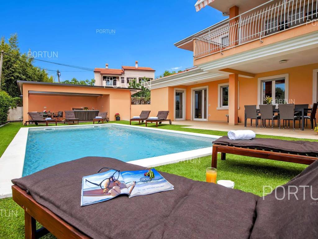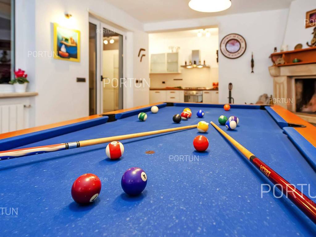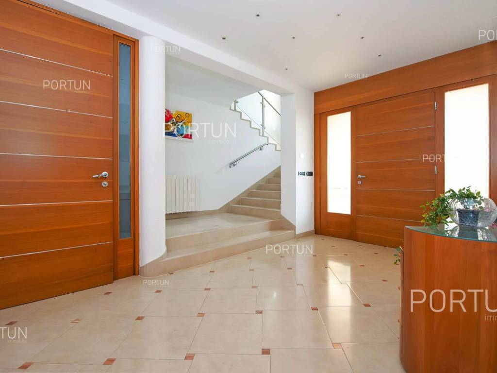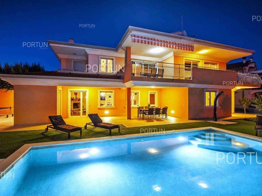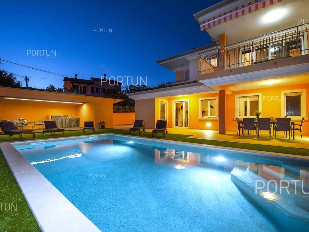 This impressive house is designed as an exclusive residence for two families, providing them with ample shared space for socializing and entertainment. Located in a rural setting not far from Rovinj, this house offers plenty of indoor and outdoor space, complete equipment, and quality furniture. Built in 2005, this house stands out with its large rooms, quality construction, and contemporary furniture. It is situated on a plot of land larger than 1,700 square meters, mostly covered with lawn and lush green hedges. In the southwest part of the yard, there is a 32 m2 swimming pool with a sunbathing area, alongside which there is a canopy with a summer kitchen. The house consists of two apartments; the larger apartment with three bedrooms and two bathrooms is located on the first floor, while the smaller apartment with one bedroom and one bathroom is on the ground floor. The ground floor also includes a boiler room, laundry room, storage room, two garages, and a large gathering room equipped with an impressive fireplace, a billiard table, a fully equipped kitchen, and a dining area. In recent years, the house has been rented out and has become a popular choice for multiple families looking to spend their vacation together in a peaceful village near Rovinj. LocationOne of the most developed and beautiful regions of Croatia is green-blue Istria, known as the "new Tuscany", which represents a combination of unique natural sights and rich cultural heritage. Well known Istrian gem - Rovinj, once a small fishing port and now a famous touristic destination, with the countless colorful houses, charming waterfront with the lovely cafés, the beautiful harbor, theidyllic beaches and the offshore islands creates a breathtaking ambience. Quiet residential location not far from Rovinj, where the house is positioned, offers numerous attractions and facilities at your fingertips:Sea | Beach 7 km Services | Food store 950 m - Cafe or bar 700 m - Inn or restaurant 650 m - Elementary School 1,4 km - Health center 7 km Sports and fun | Soccer field 2 km - Basketball court 950 m - Public swimming pool 7,5 km - Forrestal park Punta Corrente 8,5 km Nearby towns | Kanfanar 11 km - Bale 13 km Traffic | Highway entry Kanfanar 8 km - Pula Airport 39 km Attractions | Abandoned medieval town Dvigrad 14 km About the propertyThe estate which extends to 1.149 square meters comprises: Main house | 2 Apartments - 4 Bedrooms - 3 Bathrooms - 2 Floors - 550,00 m2Summer kitchen | 1 Floor - 30,00 m2Swimming pool | 32,00 m2LayoutThe spacious house, with 550 square meters, is spread over two floors, namely the ground floor and the 1st floor. Ground floor | The entrance to the house is on the ground floor. This 275,00 m2 floor includes a one-bedroom apartment, a covered terrace, a lavatory, a corridor, 2x garage, a boiler room, a wine cellar and a storage space. First floor | Internal turning stairs lead to the upper level, that is to the 1st floor. This 275,00 m2 level features the owner's flat, two bedrooms, a bedroom with en suite bathroom, two covered terraces, a corridor and a pantry. About the houseThe entrance to the house is on the ground floor level, from the southeast side, and vertical communication takes place via an internal staircase. The basic architectural characteristics of this well-maintained two-story building are: Floors | Ground floor + First floor Orientation | Southwest External walls | Block brick wall 25 cm Concrete slab floors Parking for three cars Built in 2005Furniture and equipmentFurniture | All furniture is included in the priceEquipment | Parlaphone - Modern lighting - Sanitary ware - Bathroom furnitureJoinery | PVC joinery with double glazing - Motorized blinds - Security solid wood door - Classic interior doorsMultimedia | TV in the living room - SAT TVHeating and cooling | Central heating - gas - Radiators - Fireplace - Electric boiler 300L - Gas boiler - ChimneyFlooring | Top quality ceramic tiles - ParquetOutdoor spaceEquipment | Outdoor lighting - Automatic irrigation - Drip irrigationFences | Hedge - Concrete wallDriveway | Metal door - Motor drive - Wing opening - ParlaphonePedestrian entrance | Metal doorOutdoor pool Skimmer pool | Concrete construction - Pool liner: Pebble tec - Disinfection of water with chlorine - LED lighting - Parasols Sunbathing area | Wooden deckchairs - Shower Services Connection to the power grid Connection to the water supply network | Rainwater tank Connection to the sewage system Optical Internet Paved public access roadRenting potentialCategorization: 4 Stars. Usage permission. Fully equipped for rent. Real estate statusThe land is entirely located within the boundaries of the residential construction area. DocumentationExtracted documents | Building permit - Usage permission - Main projectArea calculationArea of the house includes (550,00 m2): Living area (Ground floor + First floor) = 550,00 m2**Areas are calculated with coefficient c= 1,00Data source = Main projectThe total land area including the footprint of the building(s) amounts to 1.149 square meters. Data source = Cadastre data