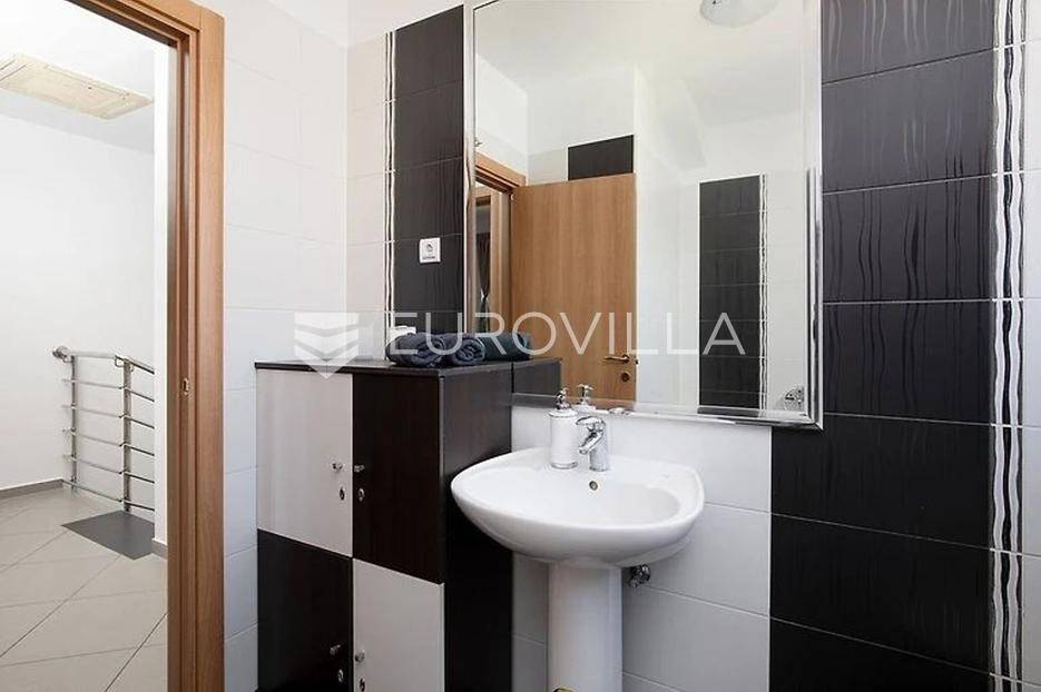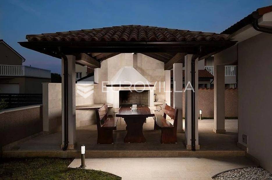 Glavna spavaća soba raspolaže vlastitom kupaonicom i izlazom na prostranu terasu koja pruža poseban ugođaj privatnosti i opuštanja.U dvorištu se nalaze garaža, parkirna mjesta, spremište, natkriveni lounge prostor s kaminom, bazen dimenzija 9 x 3,8 m s vanjskim tušem te pomoćni objekt koji može poslužiti kao drvarnica ili dodatno spremište.
