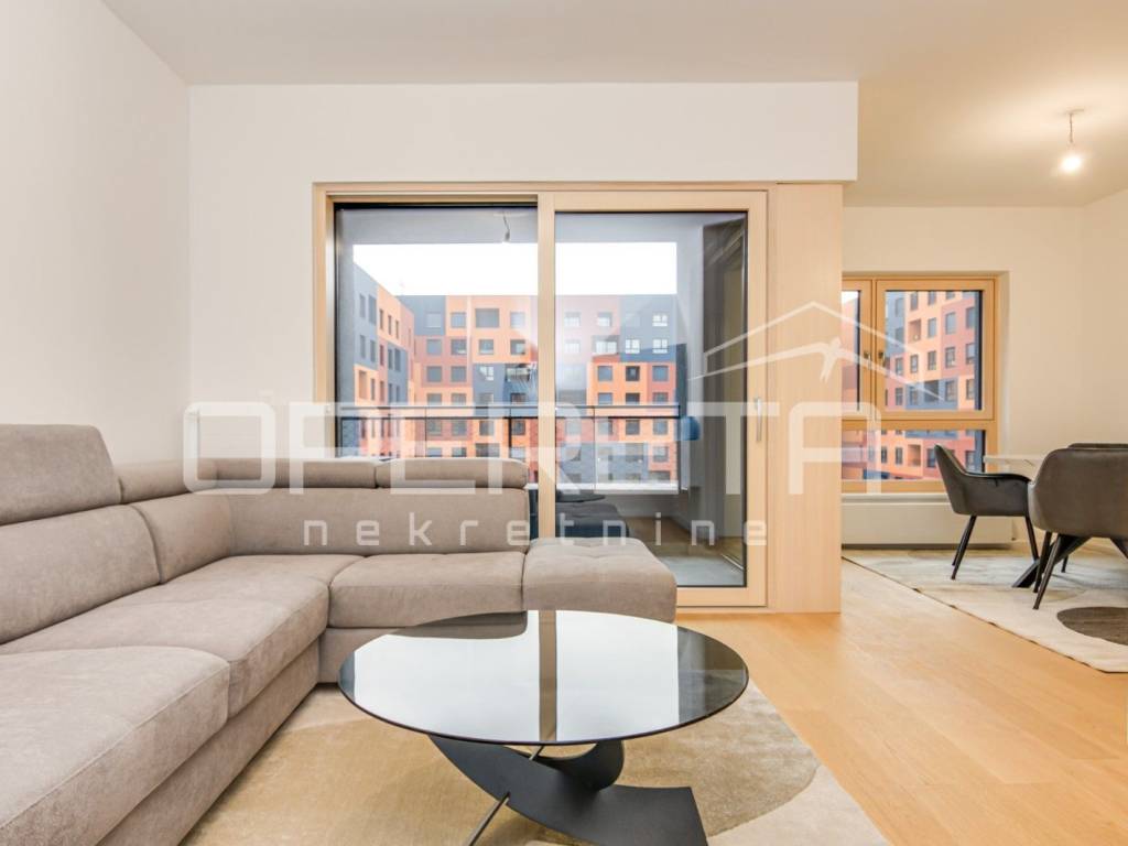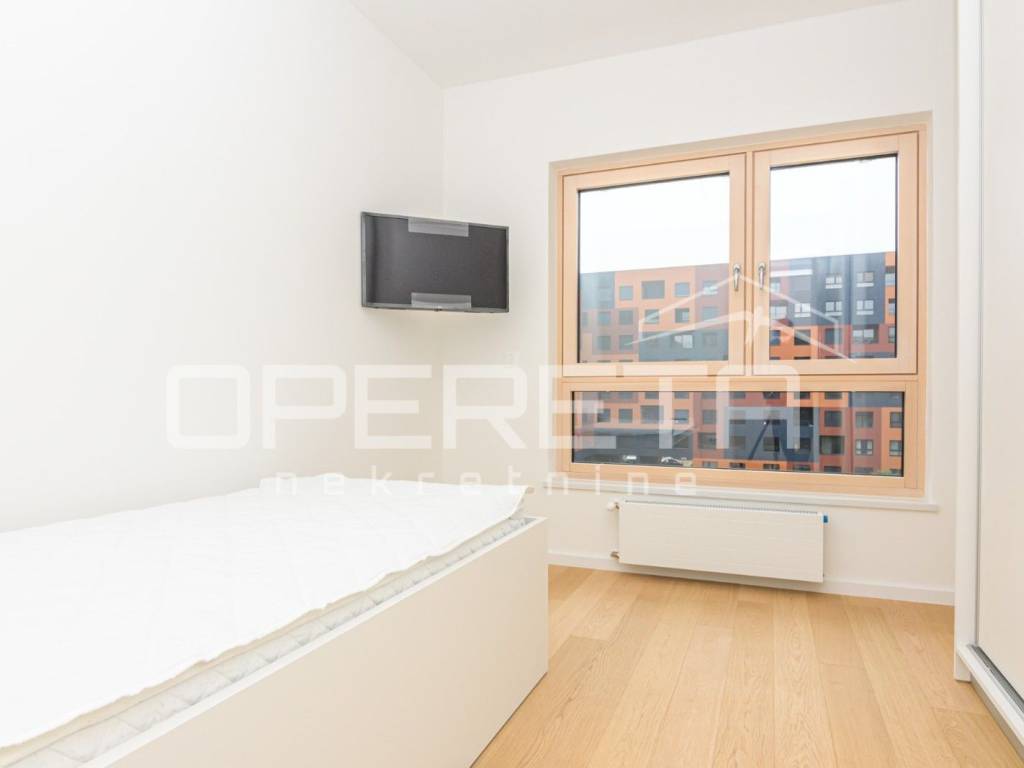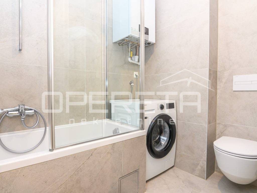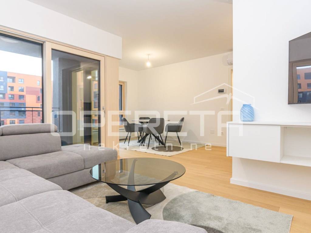 A 3-room apartment in a new building is for rent on Ivana Cankara Street. The apartment consists of an entrance hall, a living room with a kitchen and a dining room, which opens onto a spacious loggia, 2 bedrooms and 2 bathrooms (one bathroom has a bathtub and the other a shower).