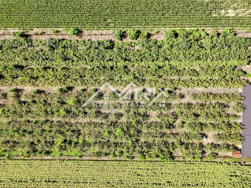 The land includes 1300 pear trees and 7000 pine trees, offering both agricultural value and a lush natural setting. It has access from two sides and is surrounded by building land, enabling further development, parcel division (up to 4 plots), or business expansion.