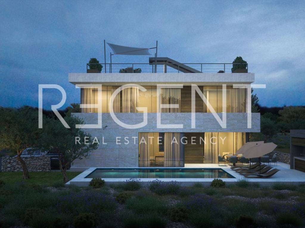Near the main beach of Sukošan, in an exceptional location only 100 meters from the sea, is a beautiful luxury villa with a swimming pool, with a total developed area of 411 m2. It consists of a ground floor with: garage, entrance area, wardrobe, toilet, kitchen, dining room and living room with access to the yard with a covered terrace and swimming pool. On the first floor there are 3 bedrooms, each with its own bathroom and access to the terrace. On the second floor there is a roof terrace with a sunbathing area and jacuzzi overlooking the sea and islands, providing complete comfort and relaxation. This elegant villa is characterized by clean and simple lines of the exterior and interior, creating a perfect environment for complete relaxation. The entire garden is just as impressive as the interior, perfectly landscaped and comfort is its basic imperative. Swimming pool, sun deck, area for socializing; everything is designed with the aim that every moment of staying in this villa is pleasant and relaxing. It is a property with all the potentials you could wish for. *Ideal for family vacation or as an investment (rent).