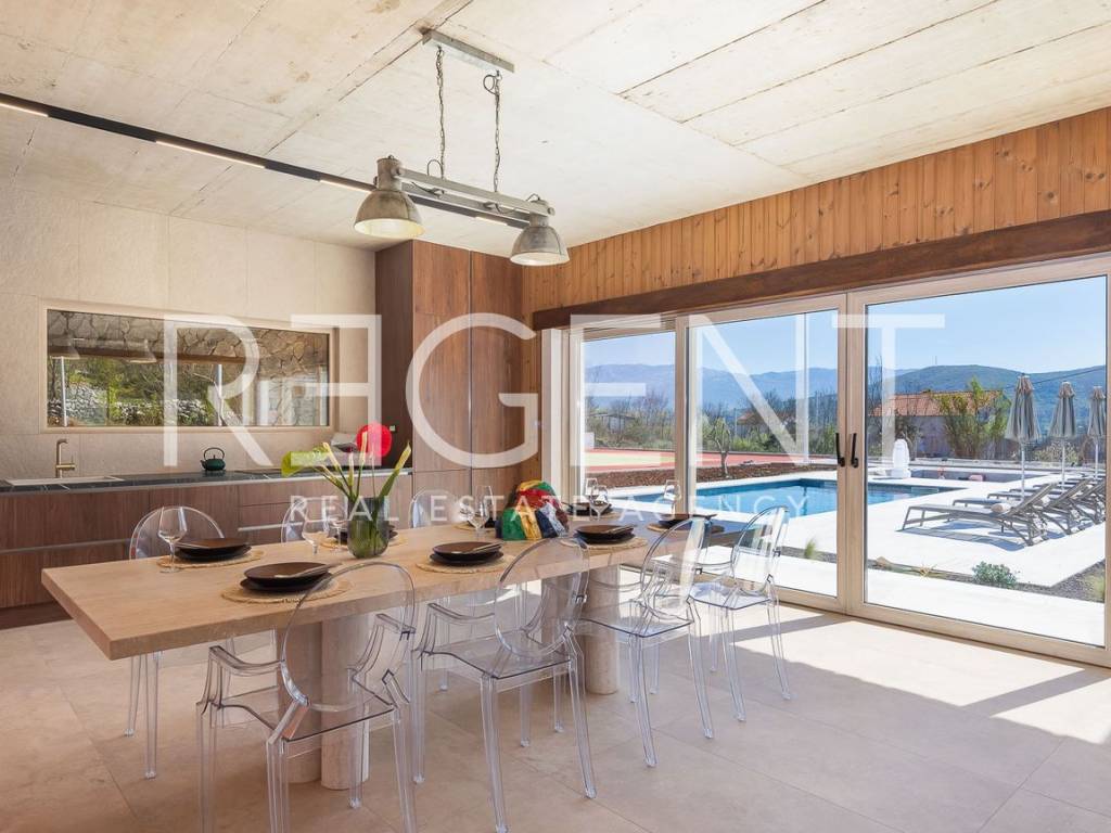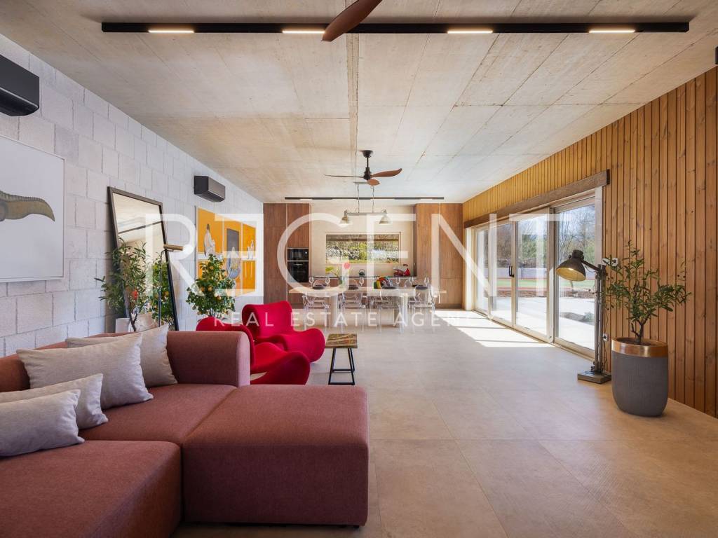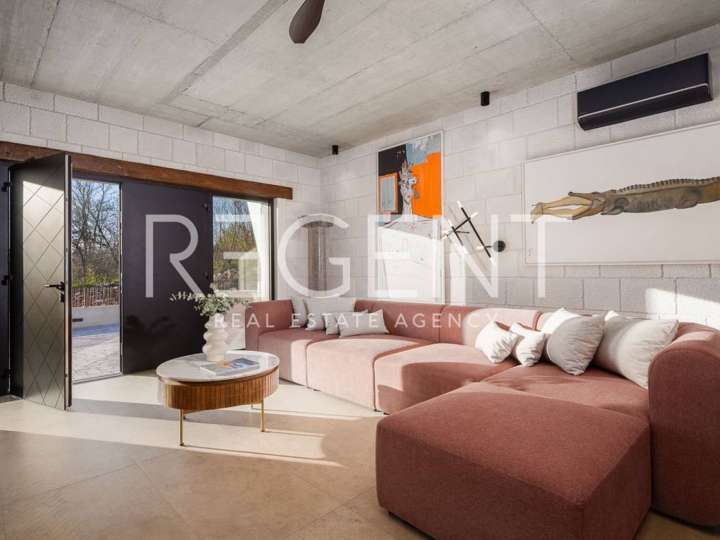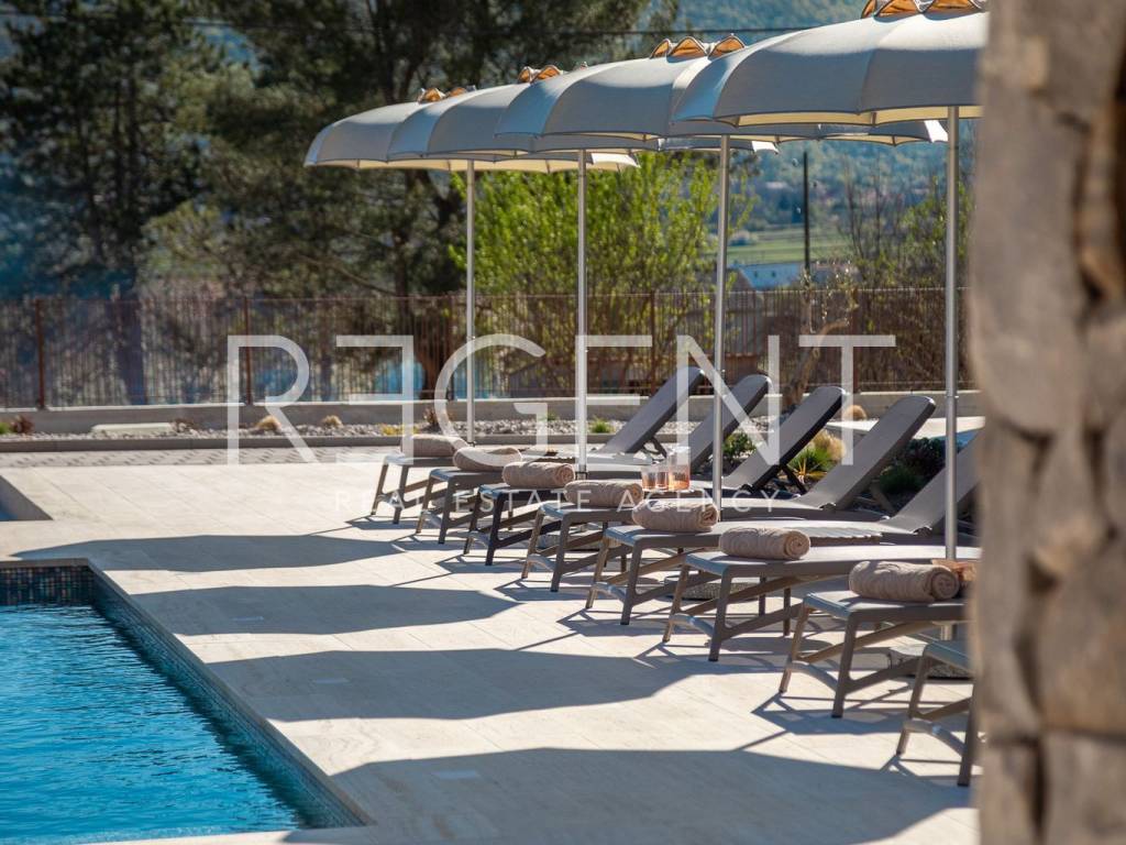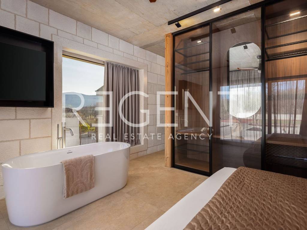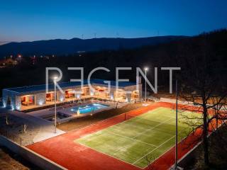 The newly built Mediterranean villa is located in a peaceful natural environment, not far from Split, on a large plot of 3,000 m². The villa is ideal for those seeking complete privacy, luxury and spacious outdoor space, and also represents an excellent investment for tourist rental. The living space of 240 m² is designed in an open space concept that combines industrial style with a Mediterranean atmosphere. On the ground floor there is a large living room with a kitchen and dining room, open to a covered terrace with a summer kitchen, fireplace and "fire pit" zone. The villa has four bedrooms, each with its own bathroom, and the interior is decorated with a combination of stone, concrete and wood. High-quality aluminum joinery includes entrance doors 4 meters high and large sliding walls that ensure an open view of the environment. The outdoor areas are paved with travertine, with ambient LED lighting. The garden includes a heated pool of 45 m² with a heat pump, a tennis court measuring 17 × 34 m with artificial grass and floodlights, a sun deck and a large terrace of 250 m². Additional amenities include an outdoor shower with hot water, an outdoor toilet, automatic irrigation and landscaped horticulture. The parking space provides space for 5–6 vehicles. The villa has underfloor heating with separate regulation per room, two Panasonic air conditioners, Hans Grohe bathroom equipment and video surveillance. Energy certificate A confirms high efficiency. The location offers perfect peace and nature, with simultaneous proximity to Split, the sea and all necessary amenities. This is an ideal opportunity for those who want a luxury property for personal use or high-end tourist rental. The villa is ready to move into immediately. For more information and to arrange a viewing, feel free to contact us.