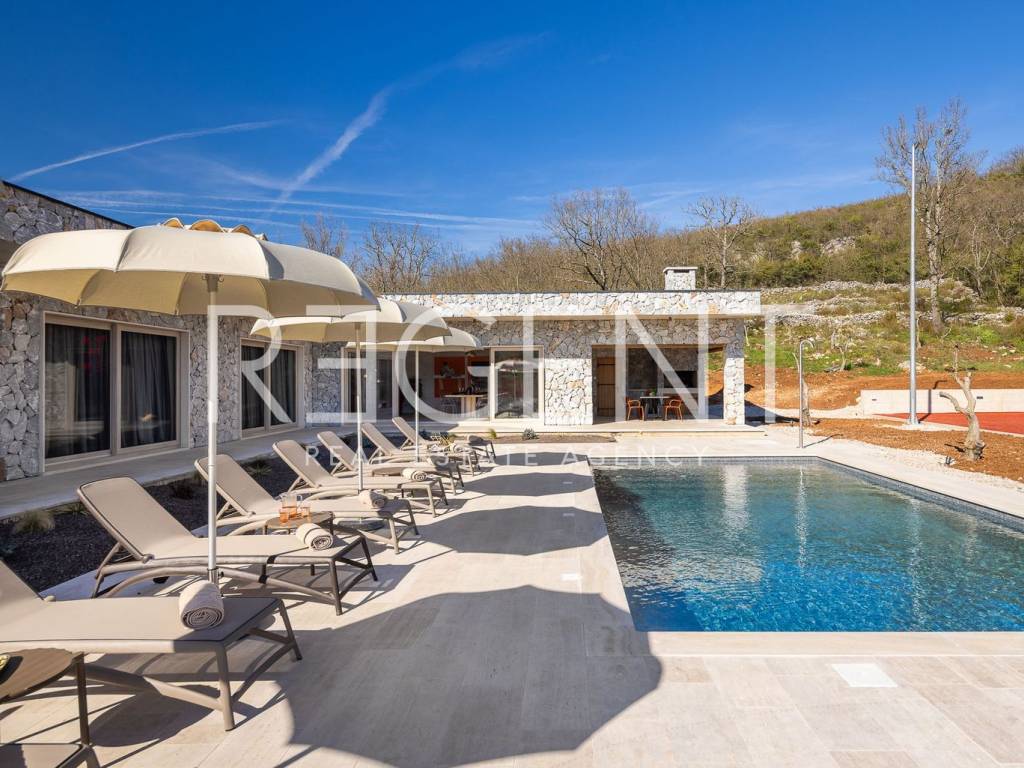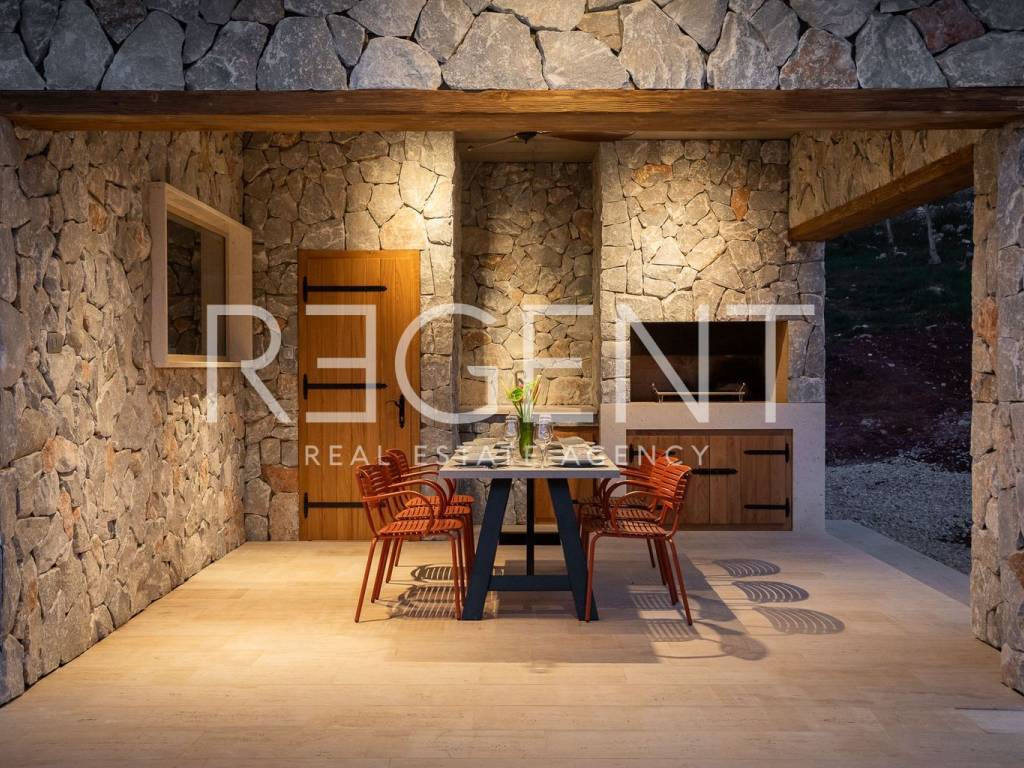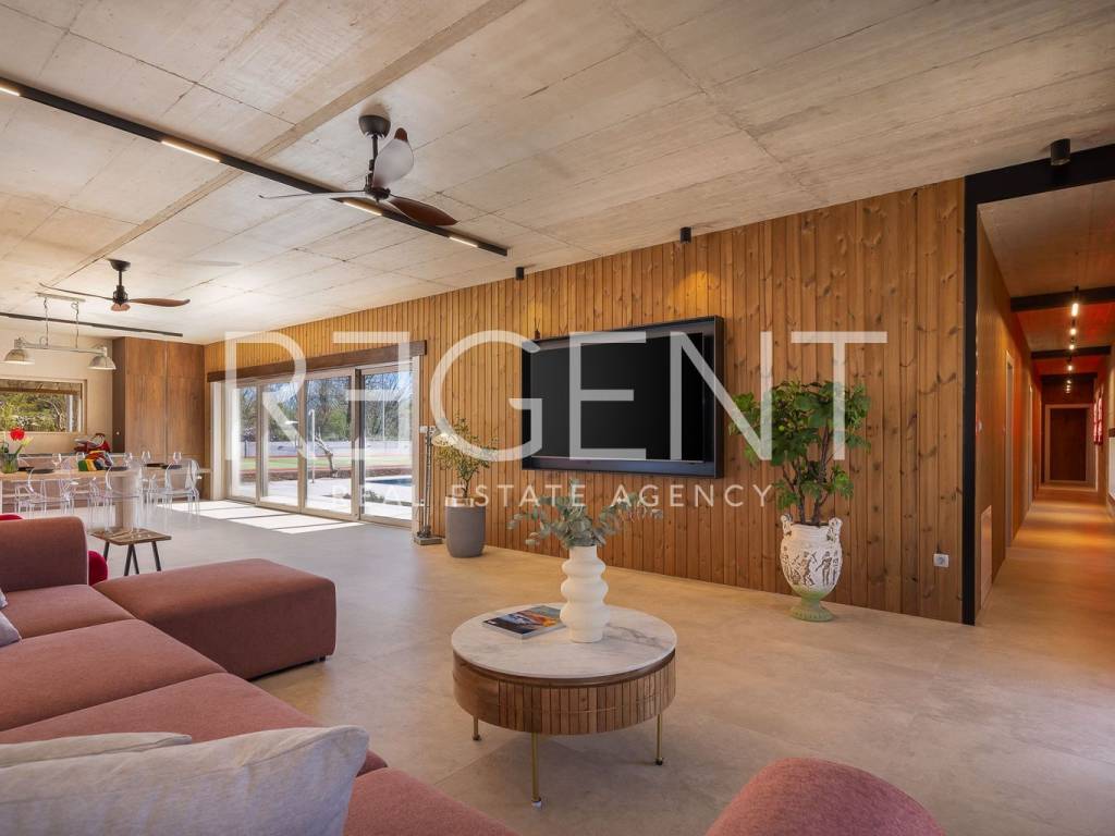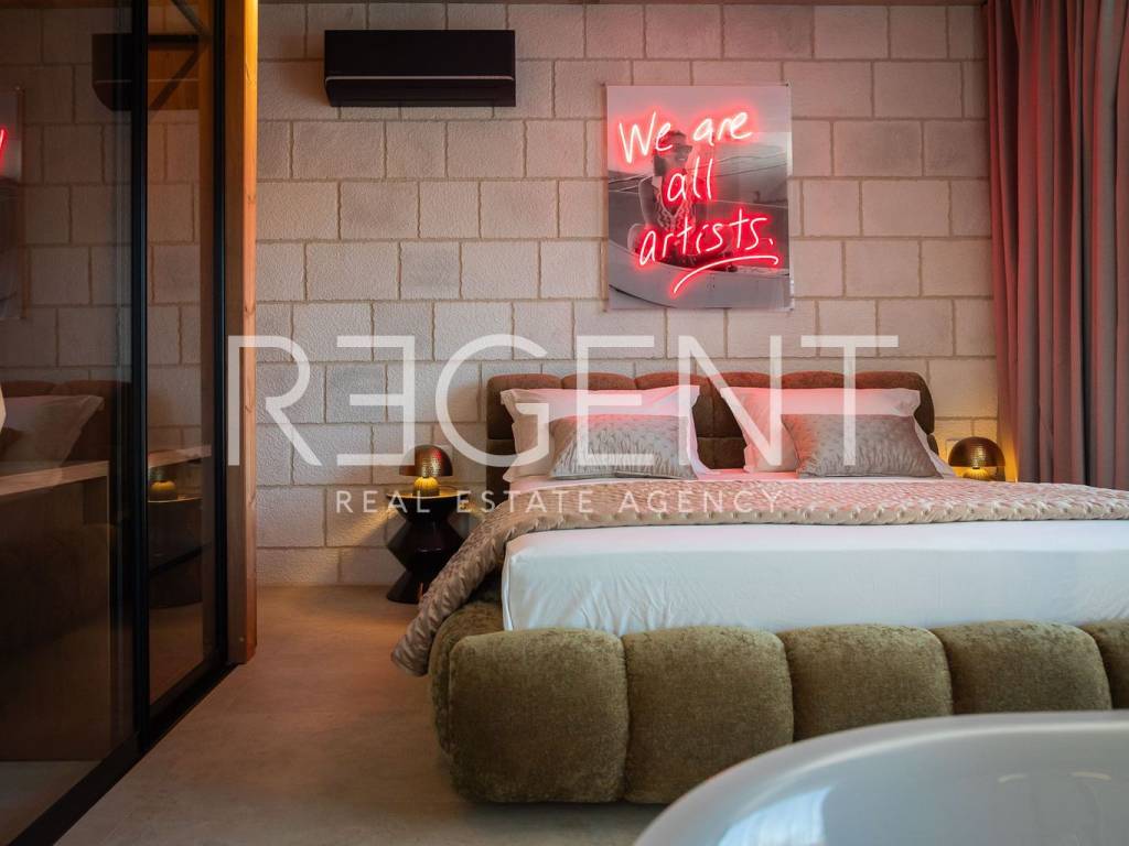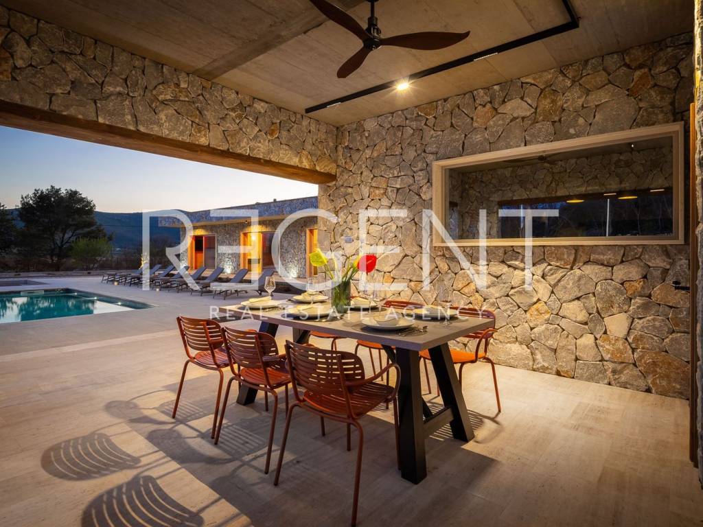 The newly built Mediterranean villa is located in a peaceful natural environment, not far from Split, on a large plot of 3,000 m². The villa is ideal for those seeking complete privacy, luxury and spacious outdoor space, and also represents an excellent investment for tourist rental. The living space of 240 m² is designed in an open space concept that combines industrial style with a Mediterranean atmosphere. On the ground floor there is a large living room with a kitchen and dining room, open to a covered terrace with a summer kitchen, fireplace and "fire pit" zone. The villa has four bedrooms, each with its own bathroom, and the interior is decorated with a combination of stone, concrete and wood. High-quality aluminum joinery includes entrance doors 4 meters high and large sliding walls that ensure an open view of the environment. The outdoor areas are paved with travertine, with ambient LED lighting. The garden includes a heated pool of 45 m² with a heat pump, a tennis court measuring 17 × 34 m with artificial grass and floodlights, a sun deck and a large terrace of 250 m². Additional amenities include an outdoor shower with hot water, an outdoor toilet, automatic irrigation and landscaped horticulture. The parking space provides space for 5–6 vehicles. The villa has underfloor heating with separate regulation per room, two Panasonic air conditioners, Hans Grohe bathroom equipment and video surveillance. Energy certificate A confirms high efficiency. The location offers perfect peace and nature, with simultaneous proximity to Split, the sea and all necessary amenities. This is an ideal opportunity for those who want a luxury property for personal use or high-end tourist rental. The villa is ready to move into immediately. For more information and to arrange a viewing, feel free to contact us.
