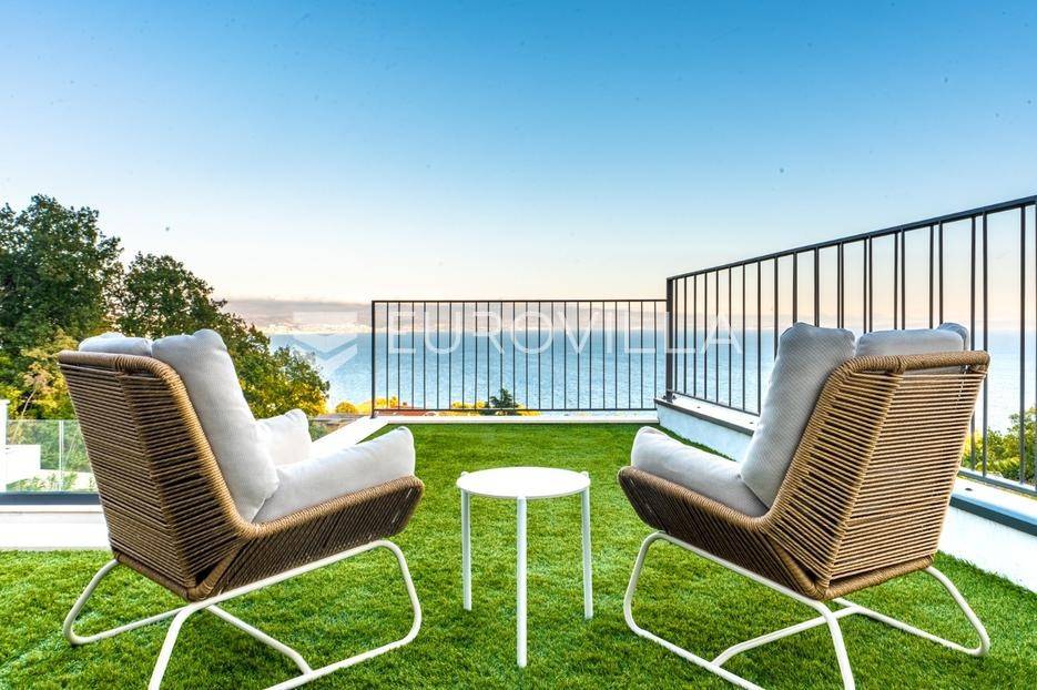 Ekskluzivna moderna vila od 250 m² neto korisne površine smještena je na izrazito mirnoj i sunčanoj lokaciji u predivnom Lovranu.Raspored na dvije etaže (prizemlje i prvi kat) obuhvaća 4 prostrane spavaće sobe, veliki otvoreni dnevni boravak s blagovaonicom i modernom kuhinjom, 2 kupaonice, prostranu terasu, privatni bazen s sunčalištem te pomoćni objekt od 12 m².Nekretnina nudi apsolutnu privatnost, potpuni mir i nezamjenjiv panoramski pogled na Kvarnerski zaljev. Izrađena je i opremljena najkvalitetnijim materijalima te je spremna za trenutno useljenje.Idealan izbor kao obiteljski dom ili kao visoko profitabilna investicija za turistički najam zahvaljujući vrhunskoj lokaciji i stalnoj potražnji u rivijeri Lovran-Opatija.Za sve informacije i dogovor razgledanja, slobodno nas kontaktirajte.