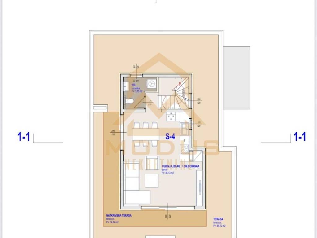 Stan je dvoetažan, na donjoj etaži nalaze se dvije spavaće sobe i dvije kupaonice, te jedan balkon, dok se na gornjoj etaži (nadgrađu) nalazi wc te dnevni boravak, blagavaonica i kuhinja s izlazom na veliku terasu.