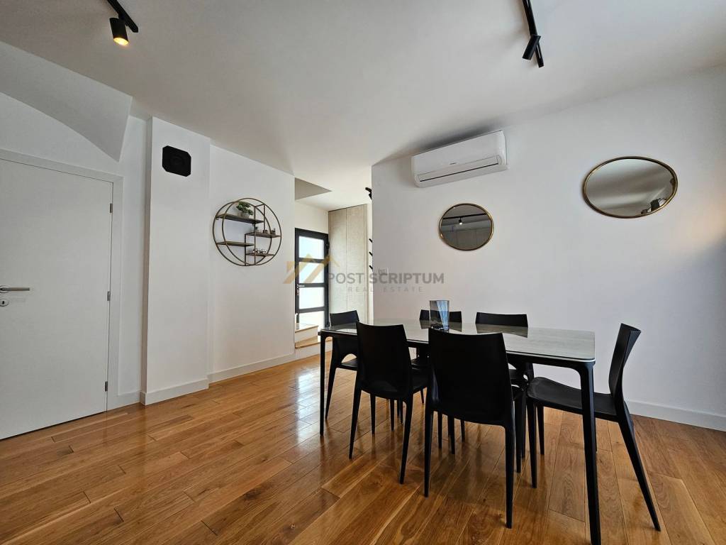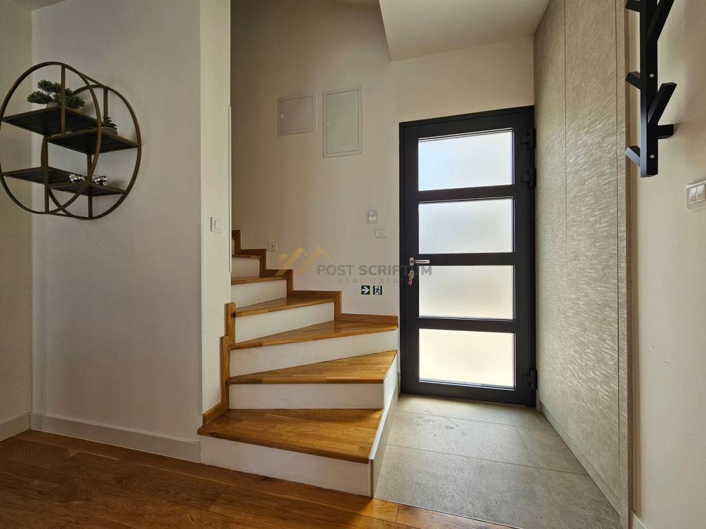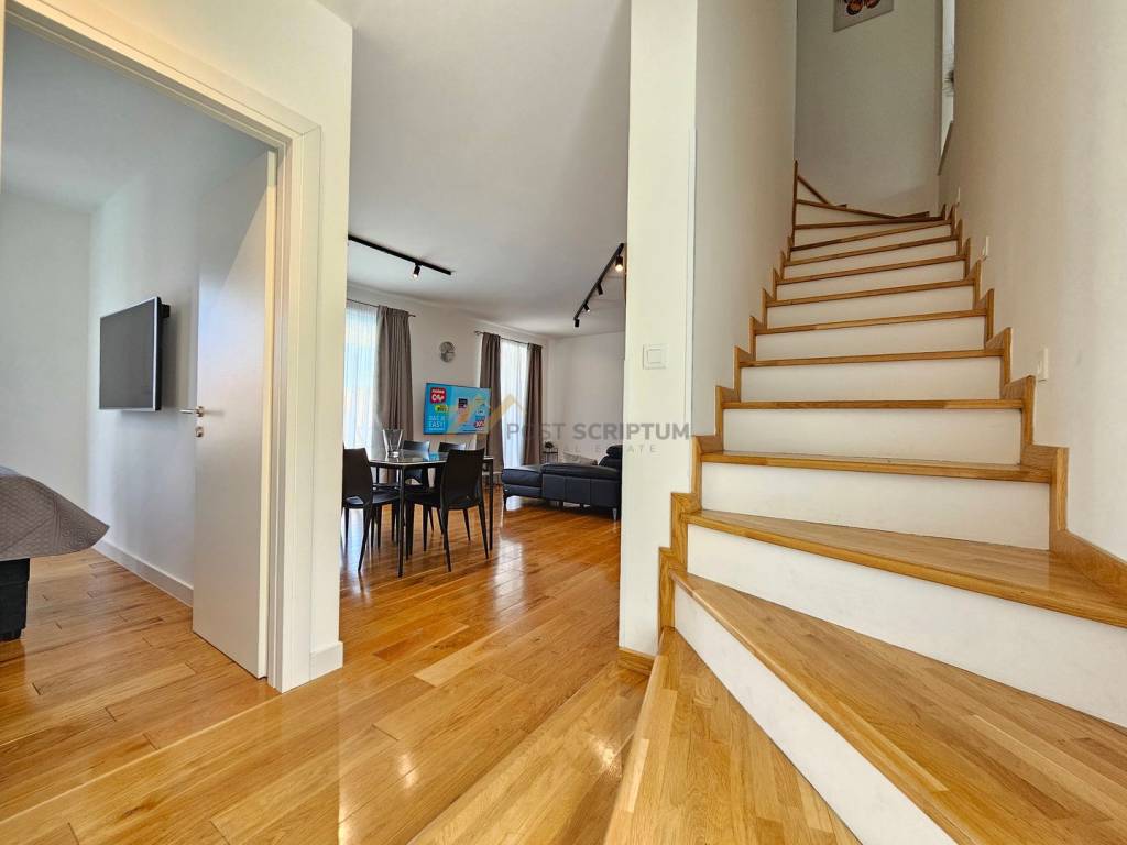 Etaže su povezane unutarnjim stubištem obloženim u drvu, a na trećoj etaži nalazi se prohodna krovna terasa od 49m2.