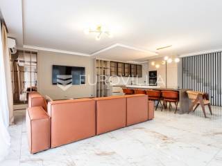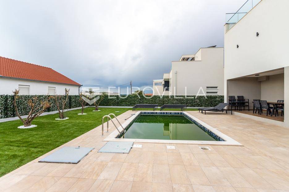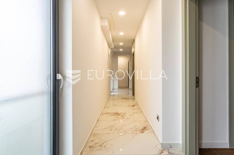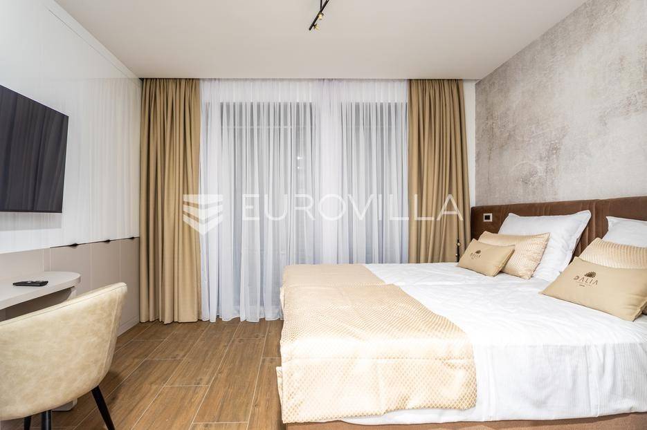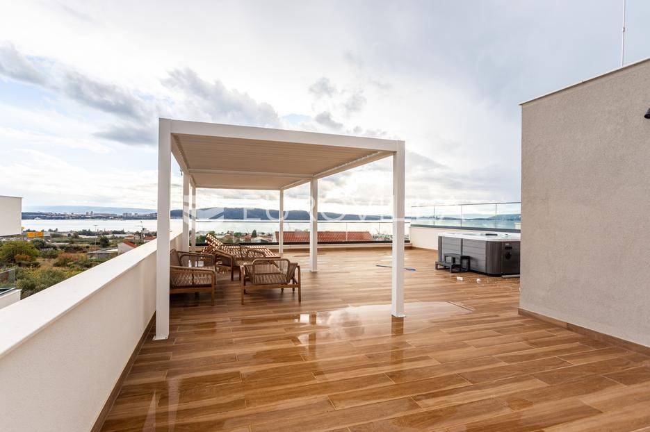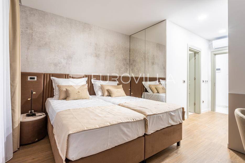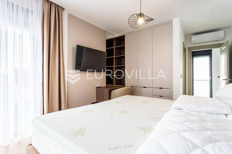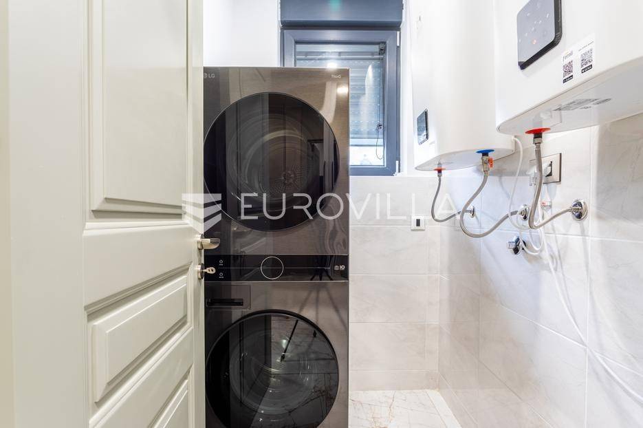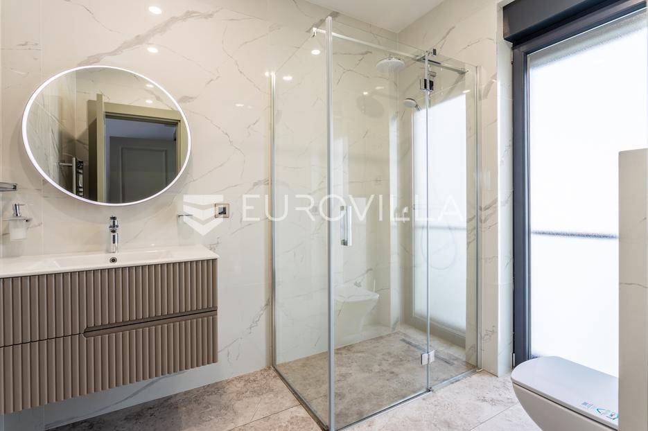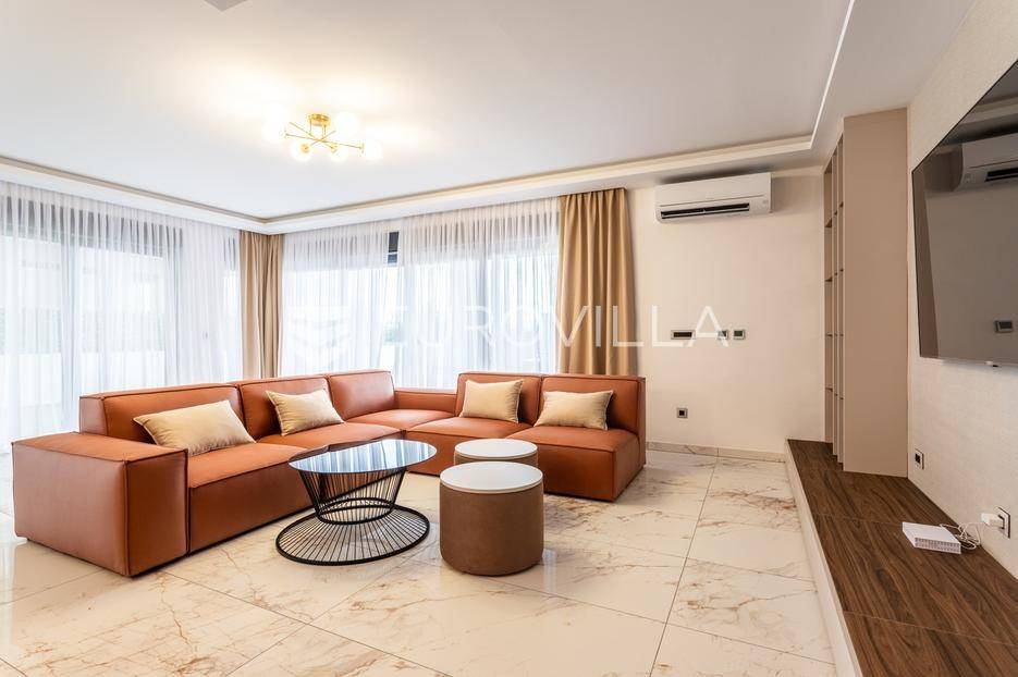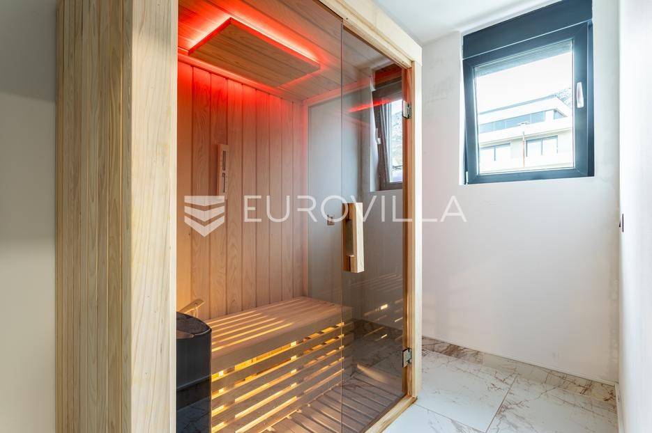 Prizemlje je zamišljeno kao open space dnevni prostor s potpuno opremljenom kuhinjom i izlazom na terasu i vrt, a u sjevernom dijelu je jedan zajednički wc, praonica, ostava i sauna. Prva etaža je podijeljena na četiri spavaće sobe s pripadajućim kupaonicama, dok je na drugoj etaži prostrana krovna terasa s jacuzzijem, roštiljem i natkrivenim dijelom dijelom za opuštanje.Svaka prostorija ima podno grijanje i vlastiti klima uređaj.Za sve dodatne informacije, stojimo Vam na raspolaganju.
