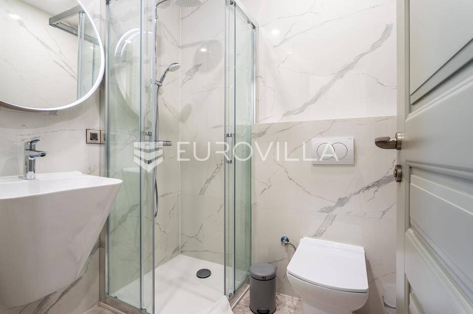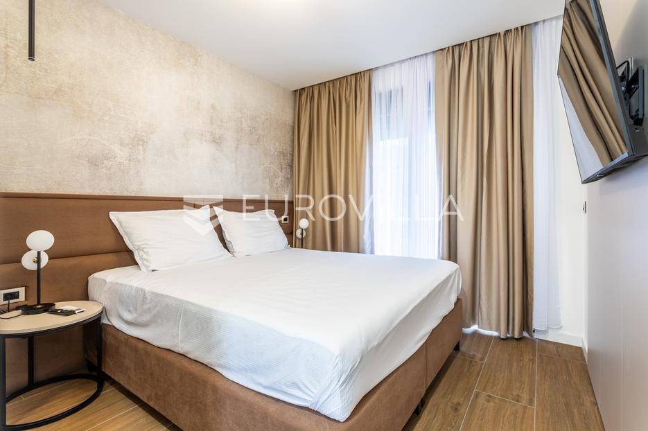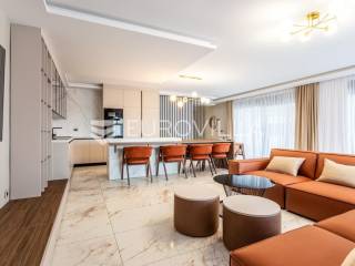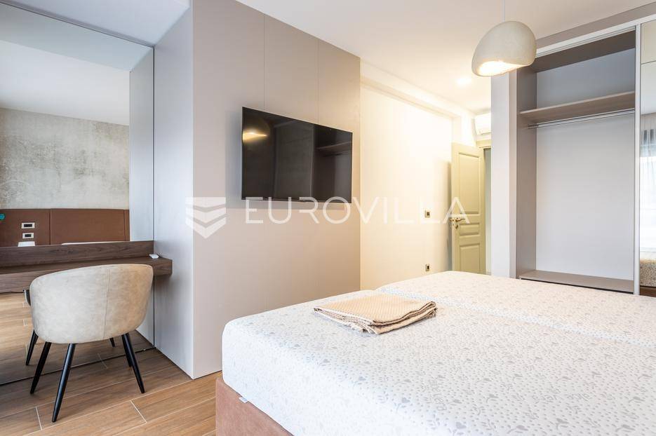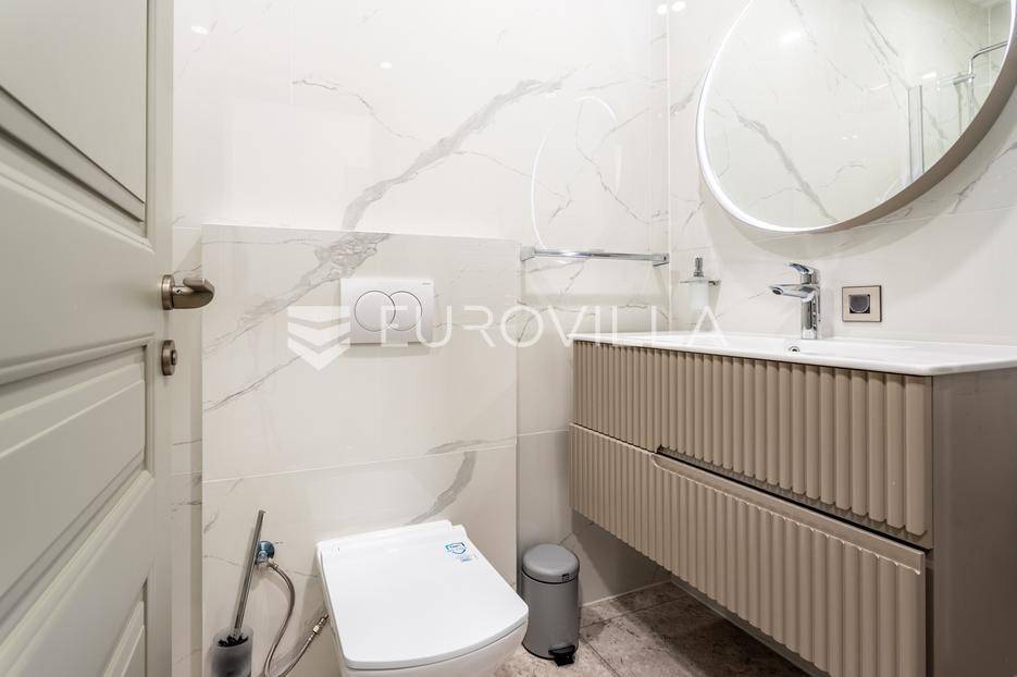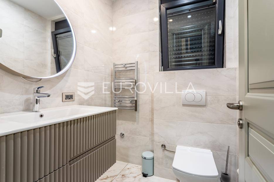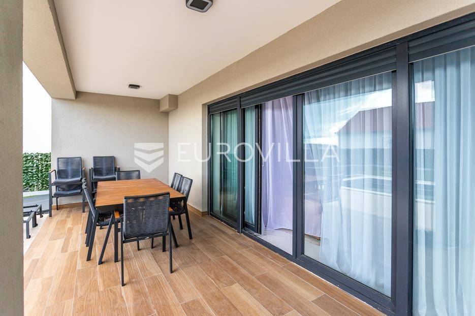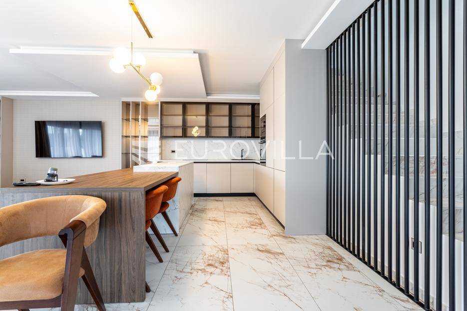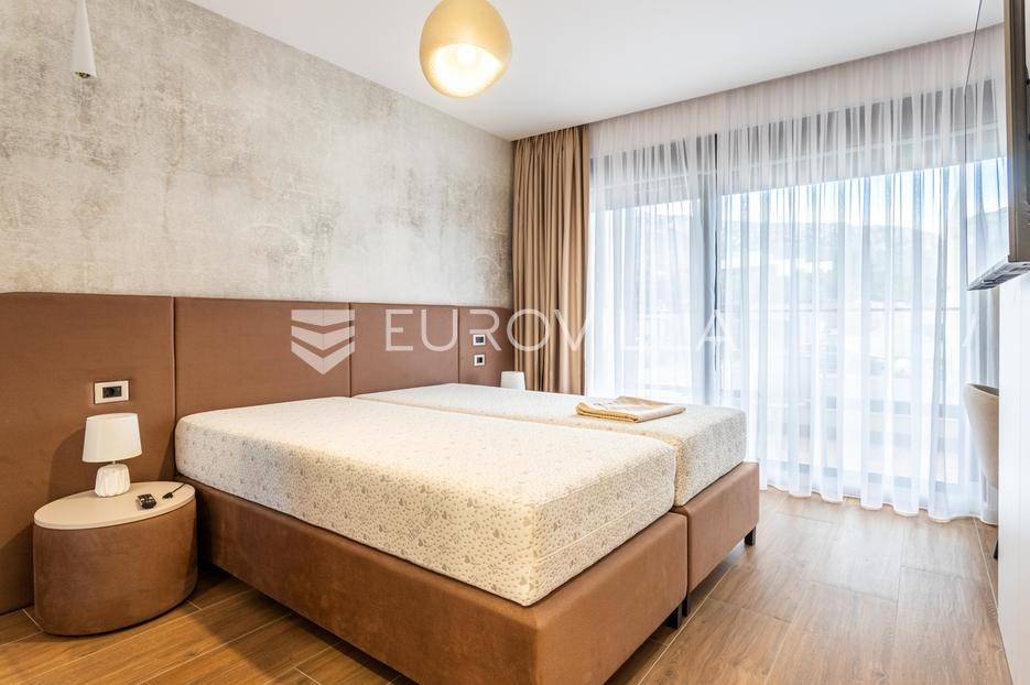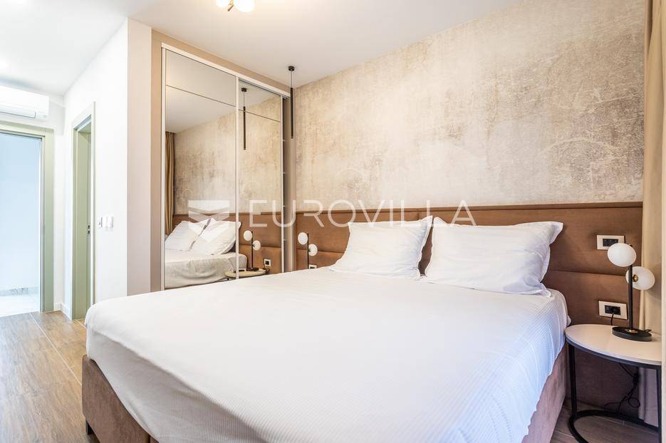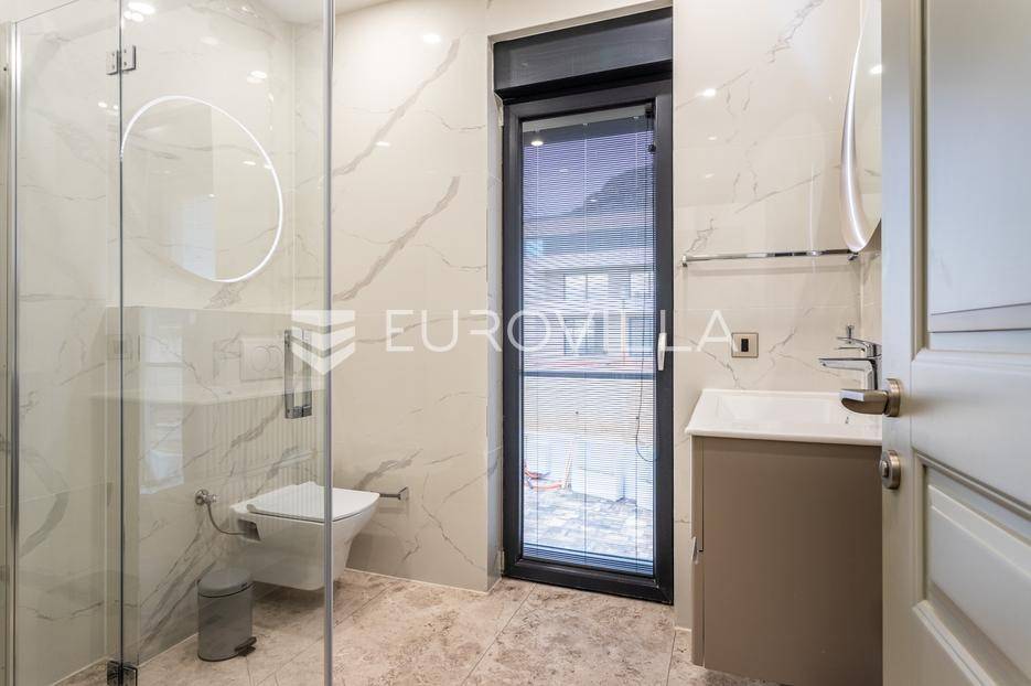 Prizemlje je zamišljeno kao open space dnevni prostor s potpuno opremljenom kuhinjom i izlazom na terasu i vrt, a u sjevernom dijelu je jedan zajednički wc, praonica, ostava i sauna. Prva etaža je podijeljena na četiri spavaće sobe s pripadajućim kupaonicama, dok je na drugoj etaži prostrana krovna terasa s jacuzzijem, roštiljem i natkrivenim dijelom dijelom za opuštanje.Svaka prostorija ima podno grijanje i vlastiti klima uređaj.Za sve dodatne informacije, stojimo Vam na raspolaganju.