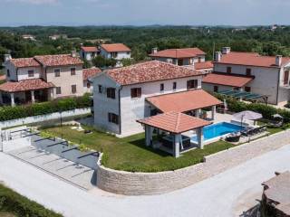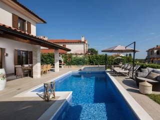We offer this elegant designer villa located on the west coast near Visnjan. This elegant house with a view of the charming Istrian houses and vineyards can be a dream home or bring you a great income if you want to rent this house. On the ground floor there is a fully equipped top quality kitchen, dining room with 8 seats and a comfortable living room with fireplace. In addition, on this floor there is a wine room for real wine lovers, and a room with a toilet and toilet. Upstairs are 3 bedrooms with comfortable double beds measuring 200x200cm, and two rooms have one sofa bed as an extra bed. Each room is air conditioned and has a TV with internet. Upstairs there are 3 more elegant bathrooms - 2 bathrooms have a shower and one sink, and one has two sinks and a bathtub. On the same floor there is also an auxiliary room with a washing machine and dryer. In the courtyard there is a large swimming pool, a covered jacuzzi, and a small park for children. The current owner did not save on this facility in any way, everything was made and equipped with designer furniture and some antique pieces of furniture. Also, if someone wants, they can upgrade this building with another floor where everything is done in advance (electricity and water), and then from that floor they would get a beautiful view of the sea.