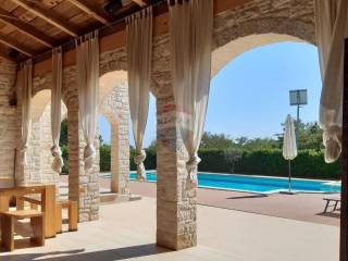 This beautiful stone villa with an area of 240m2 is situated in the vicinity of Kringe. On the ground floor of the villa we have an open space concept where we find a kitchen, dining room and living room with a fireplace. From the living room, we go out to a covered terrace from which there is access to the pool. In the continuation of the terrace, there is a guest room with a bathroom. On the first floor of the villa, there are two spacious rooms with bathrooms that open onto a beautiful terrace. The villa is decorated in autochthonous style. Provides maximum comfort. There is a swimming pool and two covered parking spaces on the garden of 1086m2. The villa has floor heating and air conditioning. This beautiful property is located in a quiet place surrounded by nature. The first beaches are only a 20-minute drive away.
