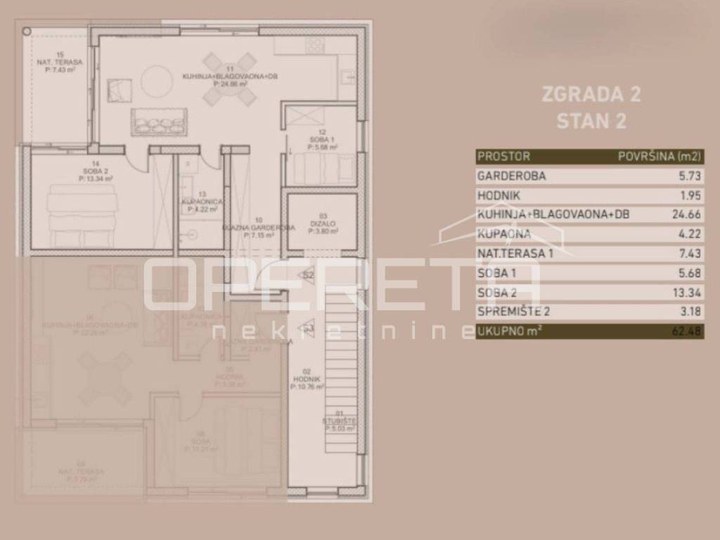 The first-floor apartment has a living area of 63 m² and consists of an entrance hall, one large and one smaller bedroom, a modern bathroom, while the central part features a spacious living room with a kitchen and dining area, which opens onto a covered terrace. The apartment includes a storage room on the ground floor and two parking spaces in front of the building.