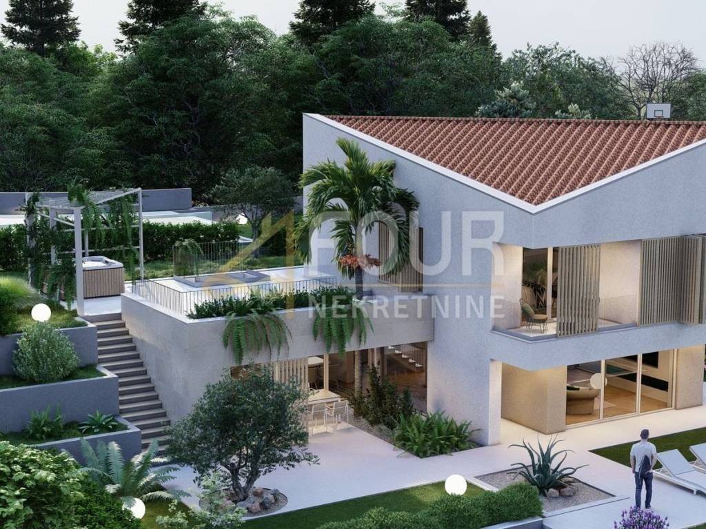 On the ground floor of the villa there are spacious living room connected to the kitchen and dining room, one bedroom, bathroom, hallway and storage room, while on the first floor there are two additional bedrooms, each with its own private bathroom, as well as a laundry room and hallway. The connection between the interior and exterior is emphasized by large glass openings and access to numerous covered and uncovered terraces, including a covered summer kitchen and a porch, making the space ideal for outdoor living throughout the year.