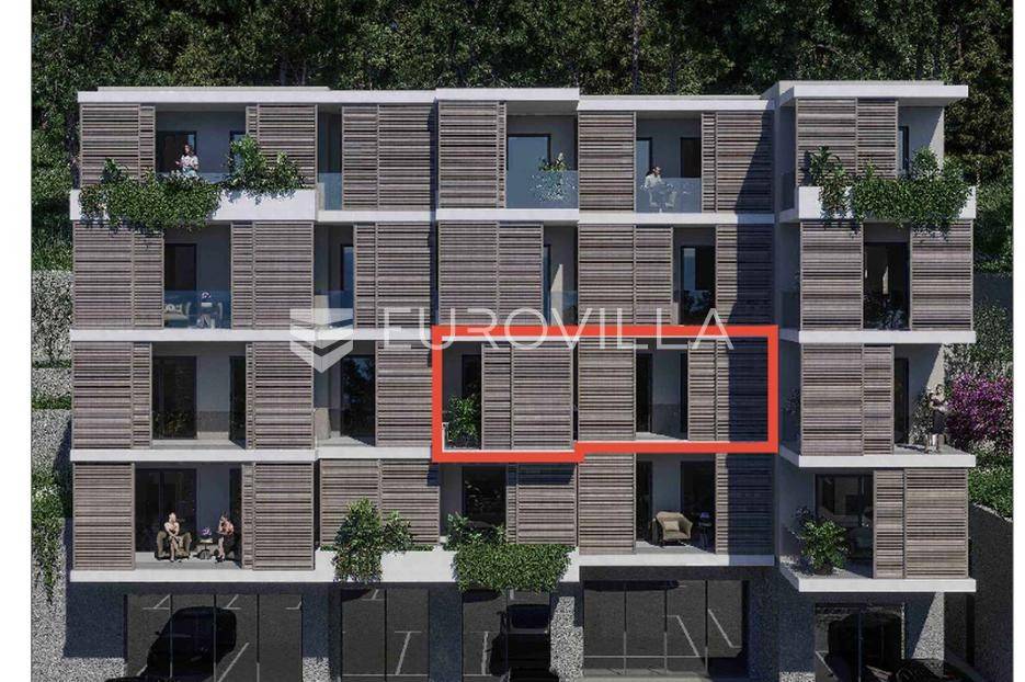 Omiš, moderan stambeno-poslovna zgrada s ukupno dvanaest stambenih jedinica- predivan i otvoren pogled na more.STAN 4- dvosoban stan drugom katu zatvorene površine 55,95 m2, s balkonom površine 9,50 m2.Stan se sastoji se od ulaznog hodnika, dvije spavaće sobe, kupaonice, WC-a, kuhinje s blagovaonicom, te dnevnog boravka s izlazom na balkon .Uz stan moguća je kupnja privatne garaže površine 16,56 m2 po cijeni od 22 000, 00 EUR-a, te vanjskog parkrinog mjesta površine 12,50 m2 po cijeni od 17 000, 00 EUR-a.Useljenje je predviđeno krajem 2026. godine.Oprema: podno grijanje u kupaonicama, klimatizirana svaka prostorija, ALU stolarija, protuprovalna ulazna vrata, vrhunski parket, keramika i sanitarna oprema...Lokacija - na dvije minute vožnje od centra Omiša, okružena zelenilom i s predivnim pogledom na more. Najbliža plaža je udaljena 200 metara zračne linije.Za sve ostale informacije stojimo Vam na raspolaganju.