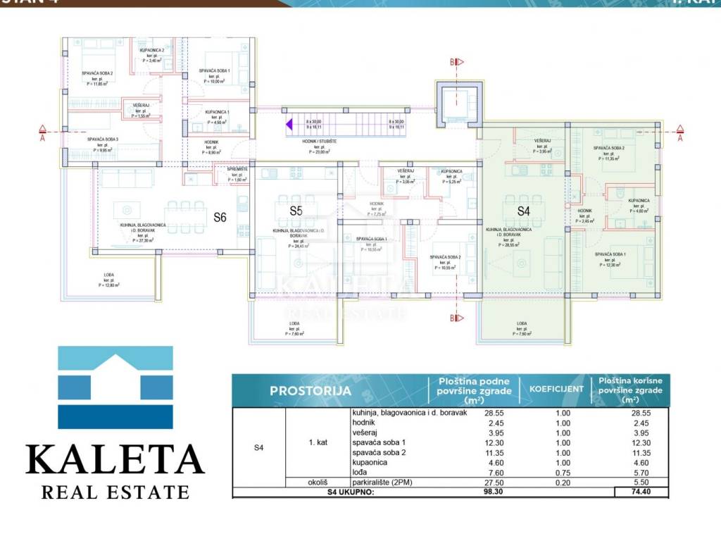 Apartment S4, with a total sales area of 74.40 m² net, is located on the ground floor of the building and has 63.2 m² of interior space. It also includes a loggia of 7.6 m² and two parking spaces, giving a total of 98.30 m² of actual usable area.