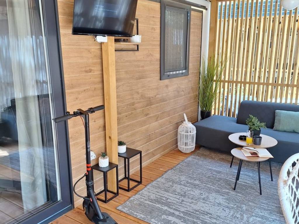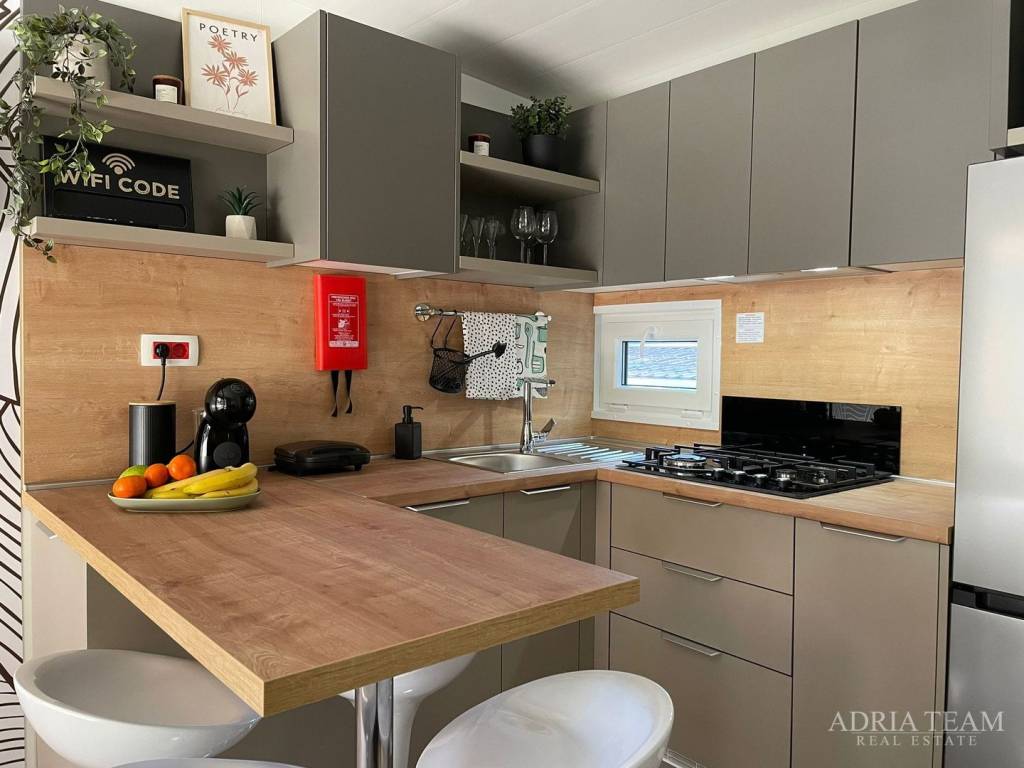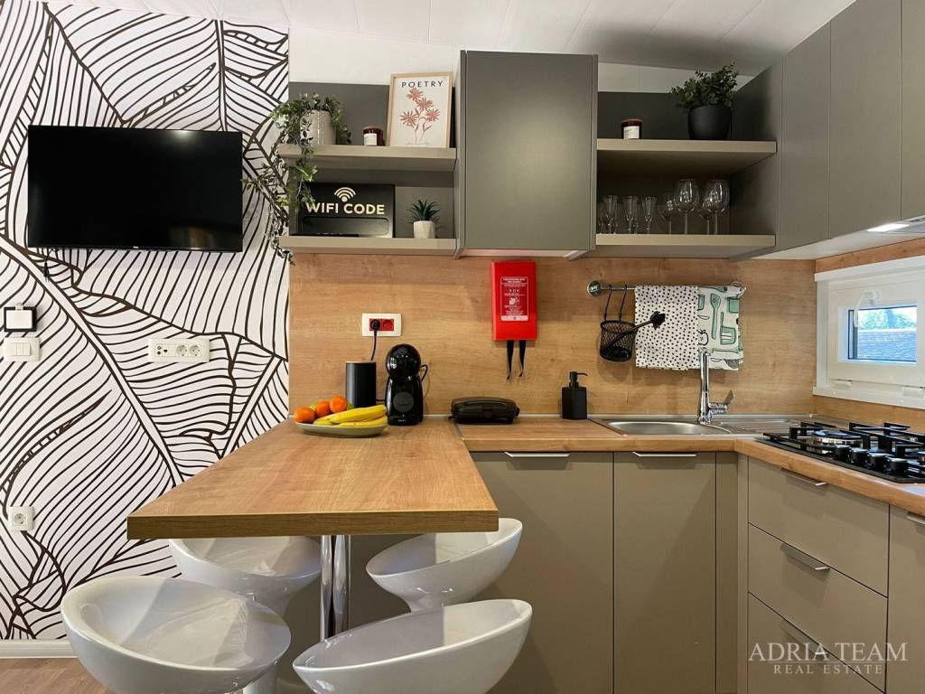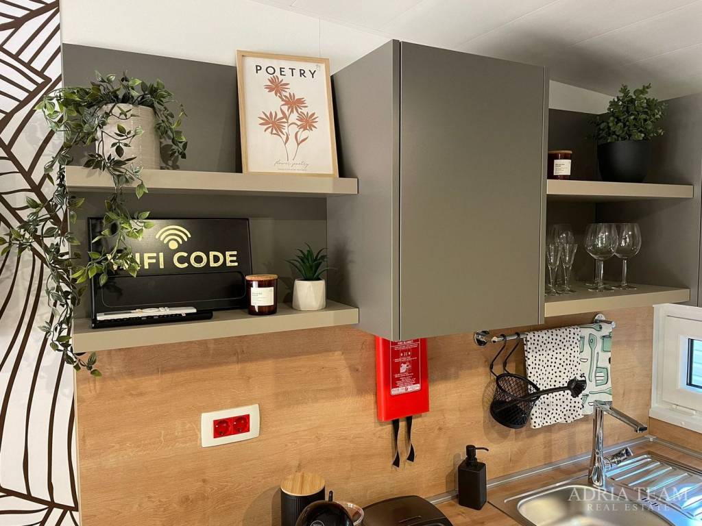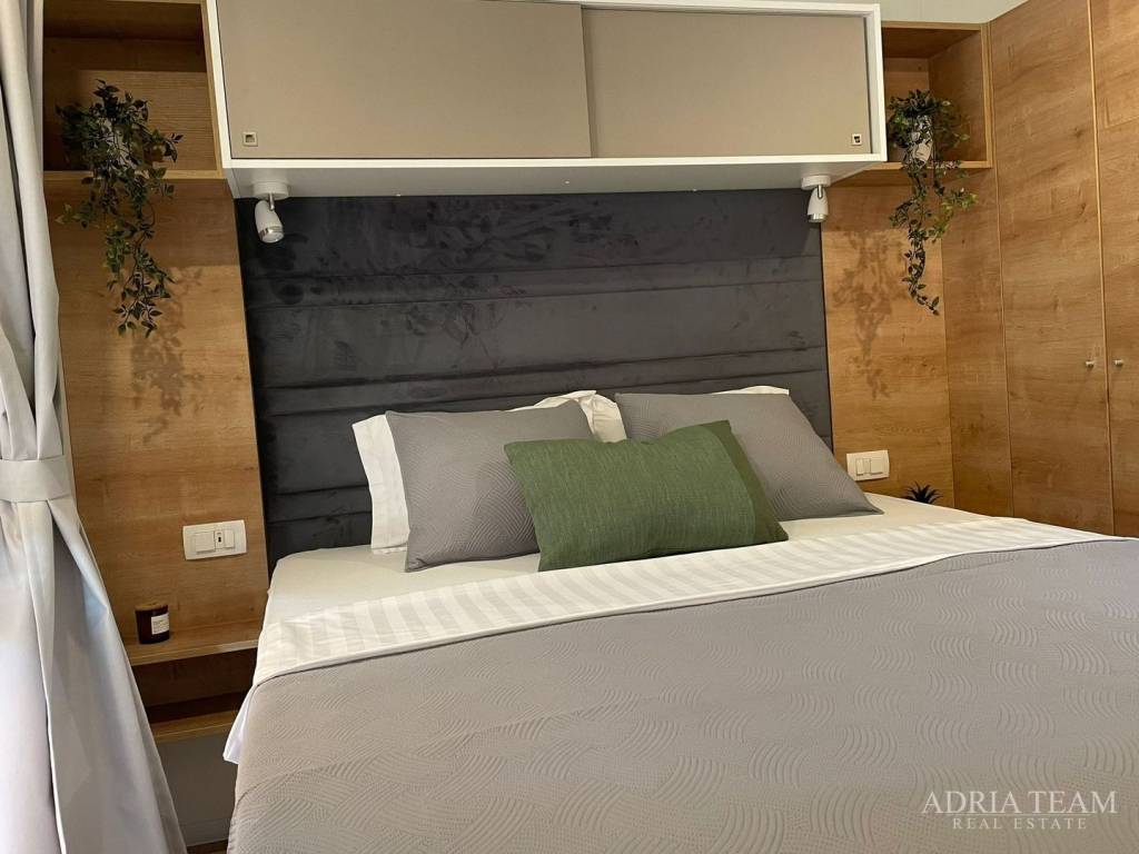 Prodaje se potpuno opremljena MOBILNA KUĆA, udaljena 150 m od mora u Biogradu na Moru. Kućica se nalazi u kampu, a veličina joj je 8,1 m × 4 m.