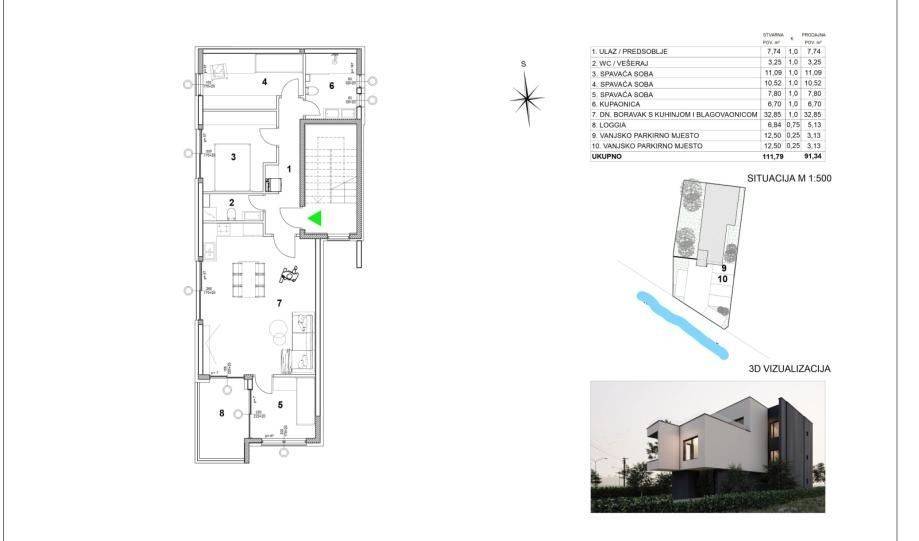Zgrada se gradi u blizini samog centra a stan oznake S2 sastoji se od ; ULAZA 7,74 m2 , SPAVAĆE SOBE 1 - 11,09 m2 , DN. BORAVAK S KUHINJOM I BLAGOVAONICOM 32,85 m2, SPAVAĆA SOBA 2 - 10,52 m2 , SPAVAĆA SOBA 3- 7,80 m2, KUPAONA 6,30 m2 , WC / VEŠERAJ 3,25 m2 , LOGGIA 6,84 m2 obr. 5,13 m2 , VANJSKO PARKIRNO MJESTO 12,50x 0,25-obr. 3,13 m2 , VANJSKO PARKIRNO MJESTO 12,50 x 0,25 -obr. 3,13 m2.