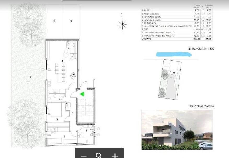 Zgrada se gradi u blizini samog centra a stan oznake S2 sastoji se od ; ULAZA 7,75 m2 , SPAVAĆE SOBE 1 - 11,09 m2 , DN. BORAVAK S KUHINJOM I BLAGOVAONICOM 36,75 m2, SPAVAĆA SOBA 2 - 10,31 m2 , KUPAONA 6,36 m2 , WC / VEŠERAJ 3,25 m2 , VRT 100,80 obr. 10,08 m2 , VANJSKO PARKIRNO MJESTO 12,50x 0,25-obr. 3,13 m2 , VANJSKO PARKIRNO MJESTO 12,50 x0,25 -obr. 3,13 m2.