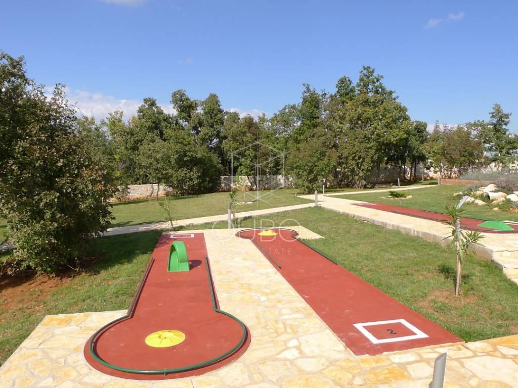 The landscaped grounds include a heated 36 m2 pool with 100 m2 sun deck, covered grill area, children’s playground, 6-hole mini golf, multifunctional court (16 × 8 m), covered parking for two cars, additional parking for two more cars, covered 2.15 × 2.15 m hot tub (5+1 persons), lawn irrigation and a small grove with a shaded rest area.