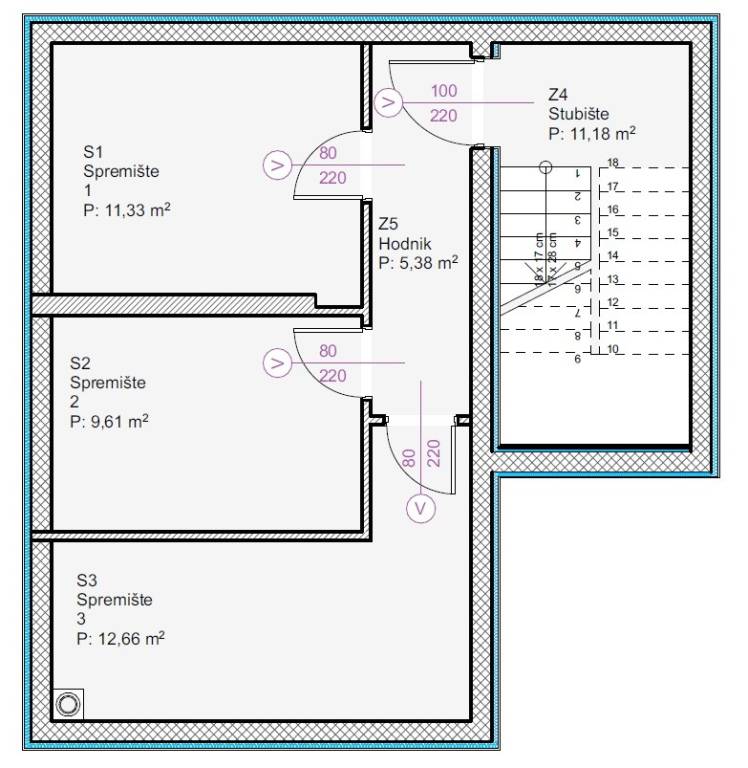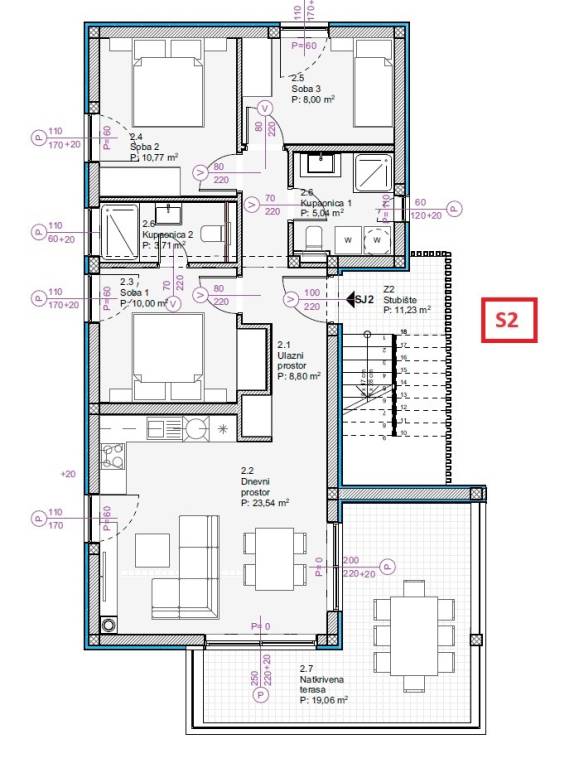 APARTMENT S2 has 89.42m2 of usable area + 9.61m2 storage room, and consists of: entrance area, bathroom 1, bedroom 1 with en-suite bathroom, bedroom 2, bedroom 3, kitchen and dining room, living room, covered terrace of 19.06m2, and parking spaces P2 and P3.