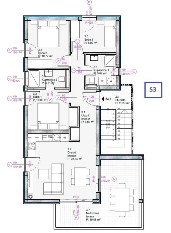APARTMENT S3 has 89.42m2 of usable area + 9.61m2 storage room, and consists of: entrance area, bathroom 1, bedroom 1 with en-suite bathroom, bedroom 2, bedroom 3, kitchen and dining room, living room, covered terrace of 19.06m2, and parking spaces P2 and P3.