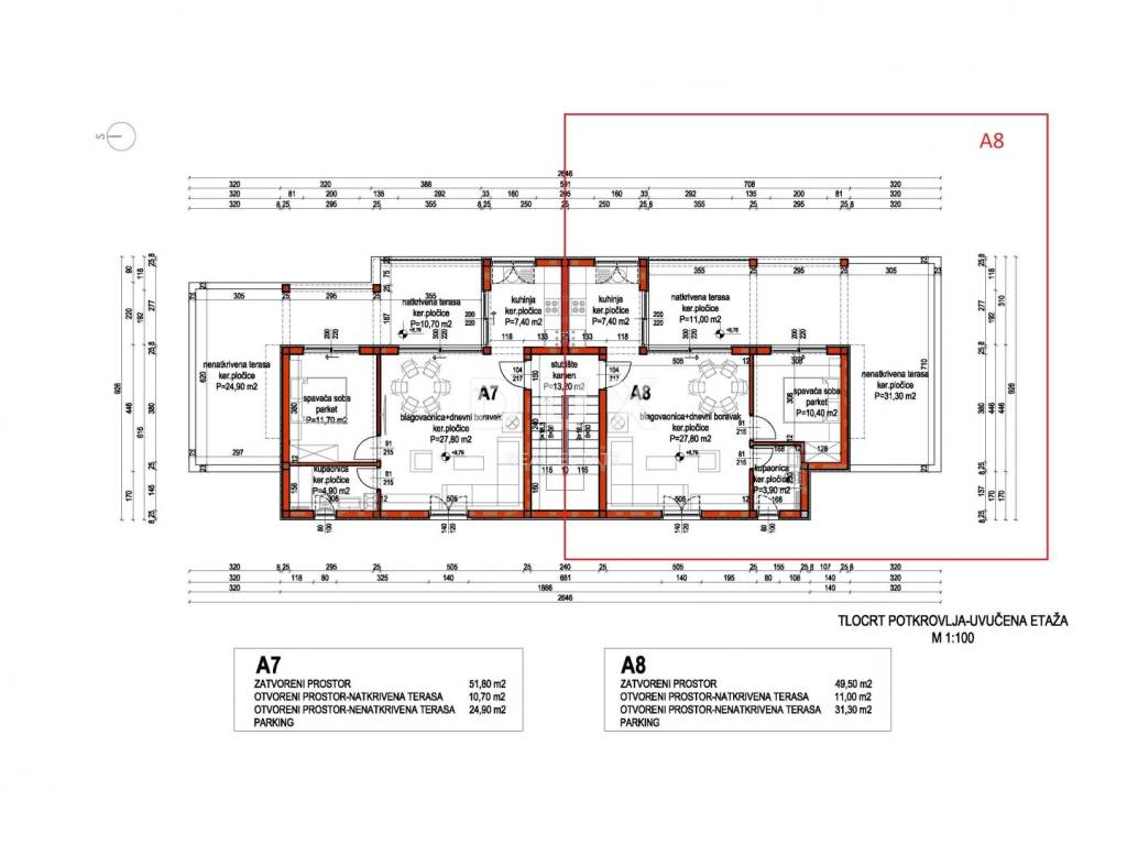 For sale is a modern one-bedroom penthouse apartment A8 on the 3rd floor of a new residential building, with a total usable area of 65.32 m. The apartment is located in a quiet and attractive place Dolac near Primošten, in a quality new building with a total of 8 apartments on a beautiful elevated location that offers an extraordinary sea view and unforgettable sunsets.