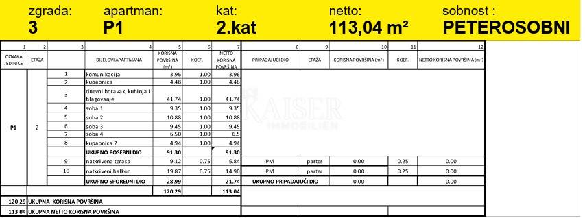 The apartment, marked P1, is located on the second floor of the building and offers a total net usable area of 113.04 m² (including the living area and outdoor areas according to coefficients). The interior living space of 91.30 m² is extremely spacious and functionally arranged, providing maximum comfort for a large family or those who appreciate luxury and space.